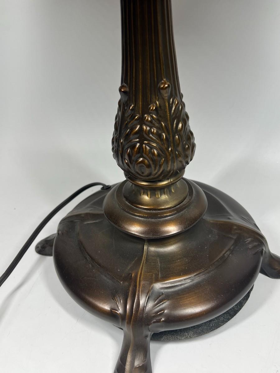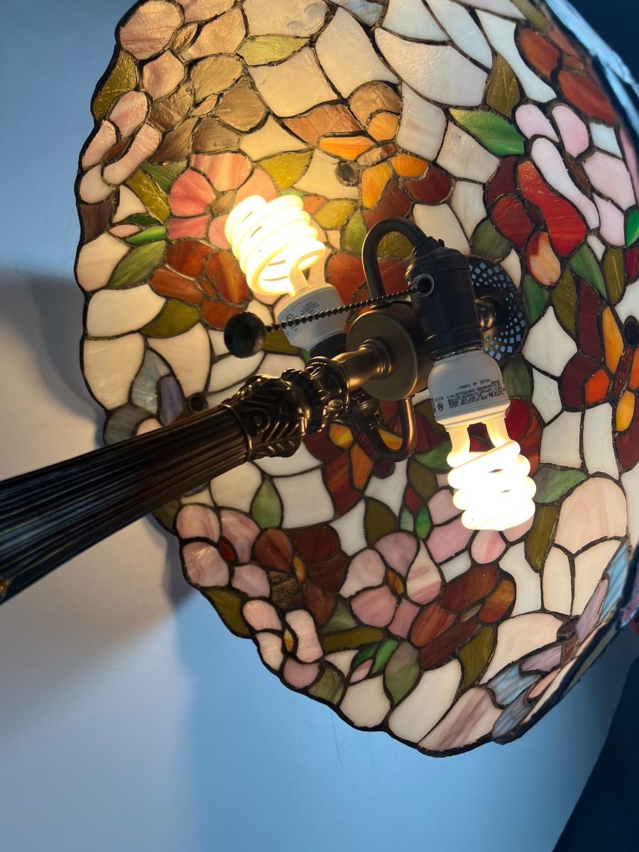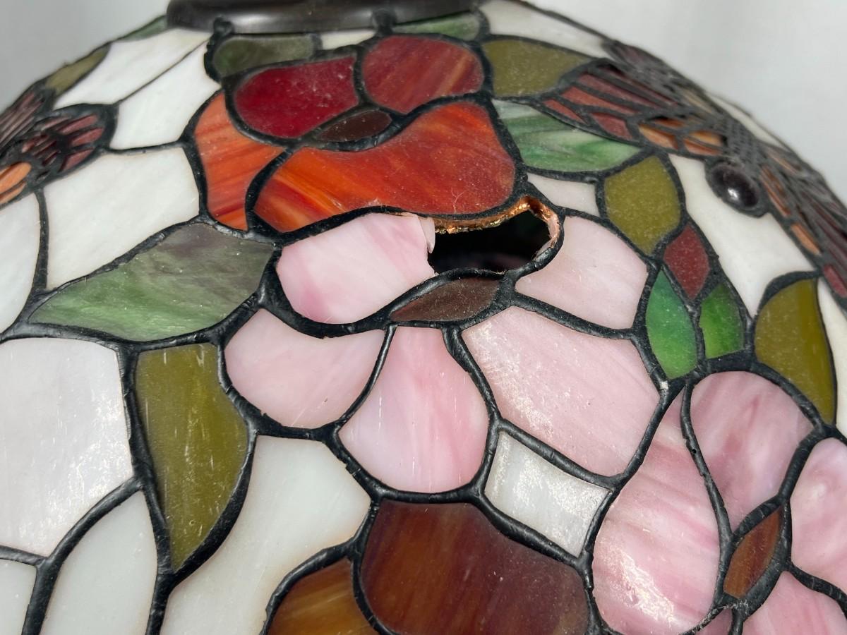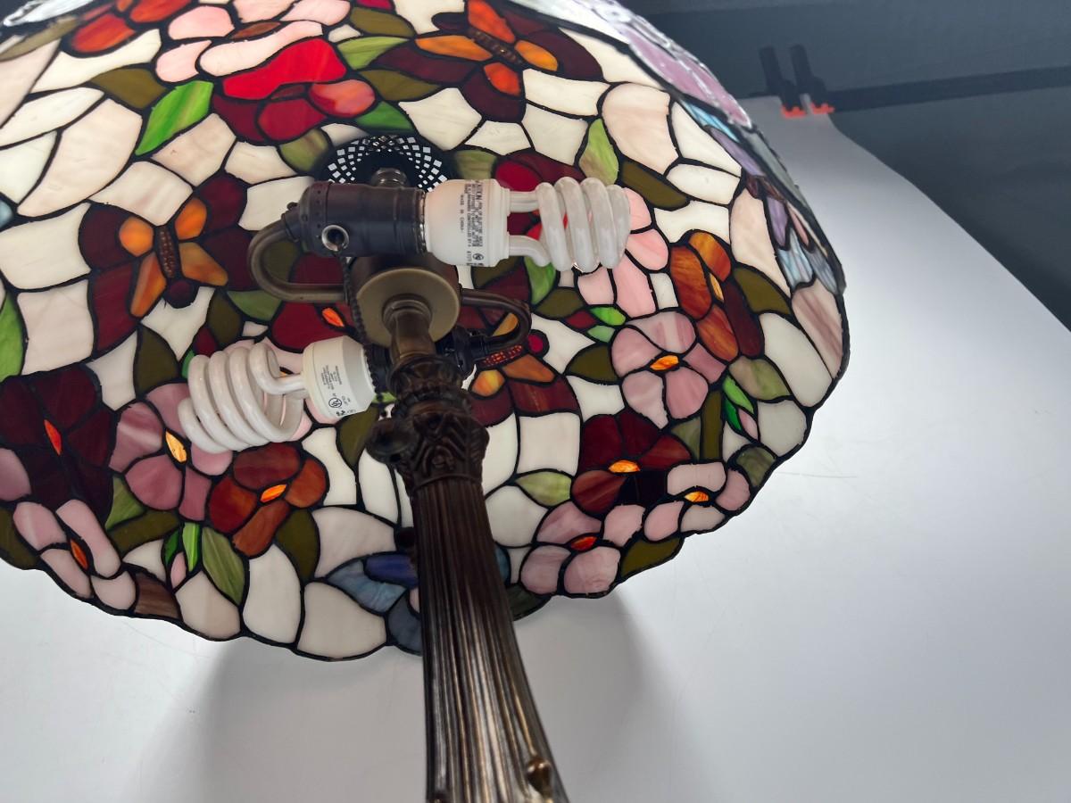 Retro Stained Glass Tiffany Styled Pink & Purple Flower Pattern Glass Cast Metal Base Lamp