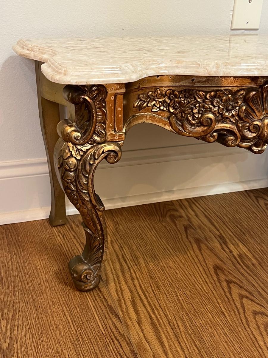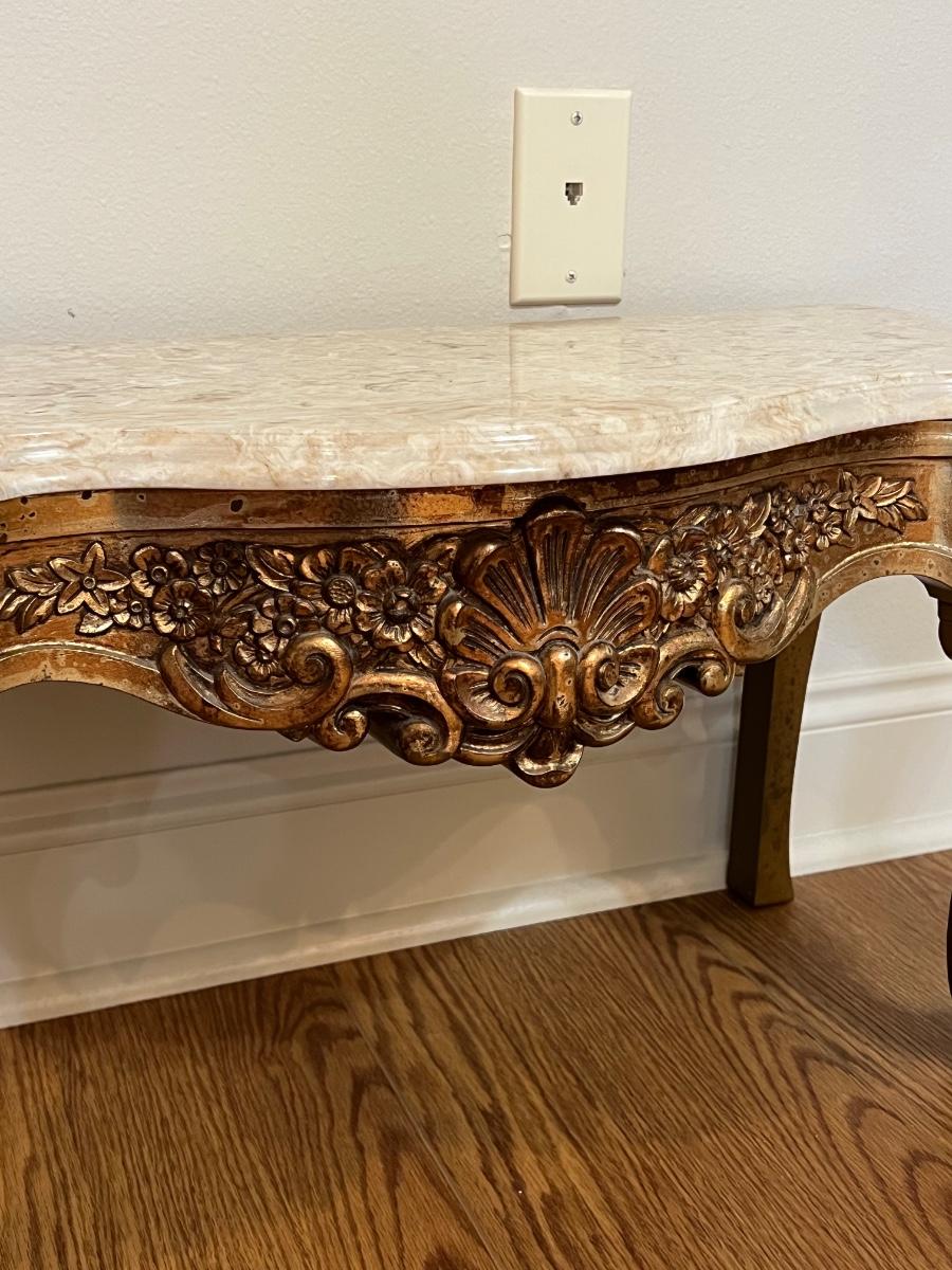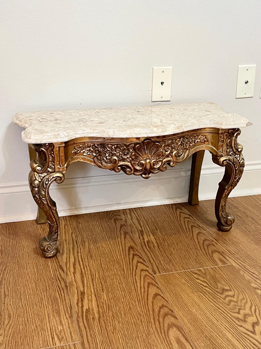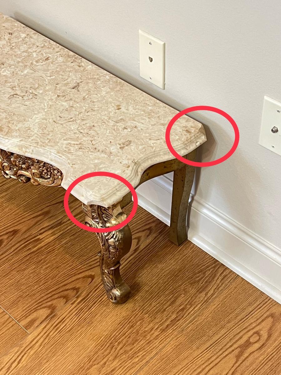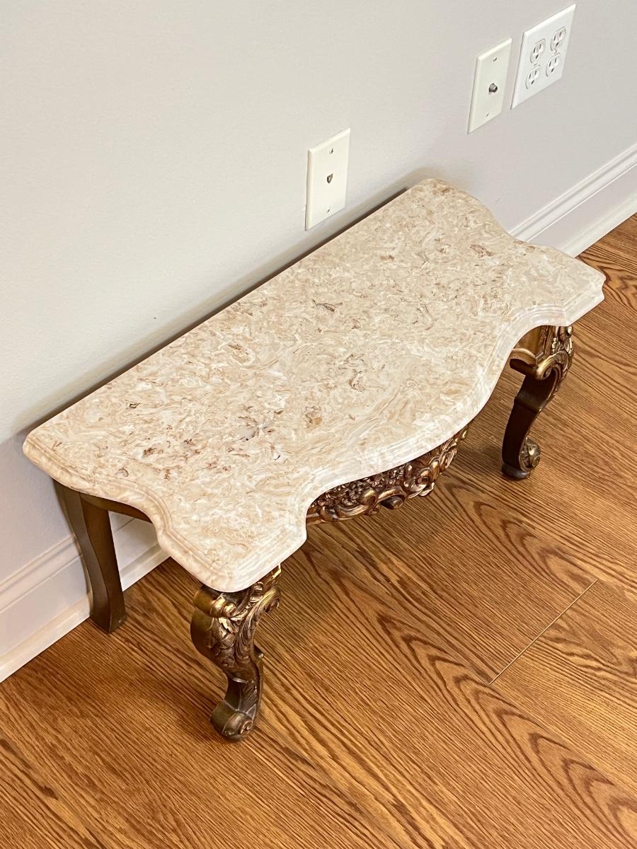 Bottom is made of a plastic type material ~ Couple of minor chips on the corners on the table, see photos for condition ~ 15” H x 25.5 W