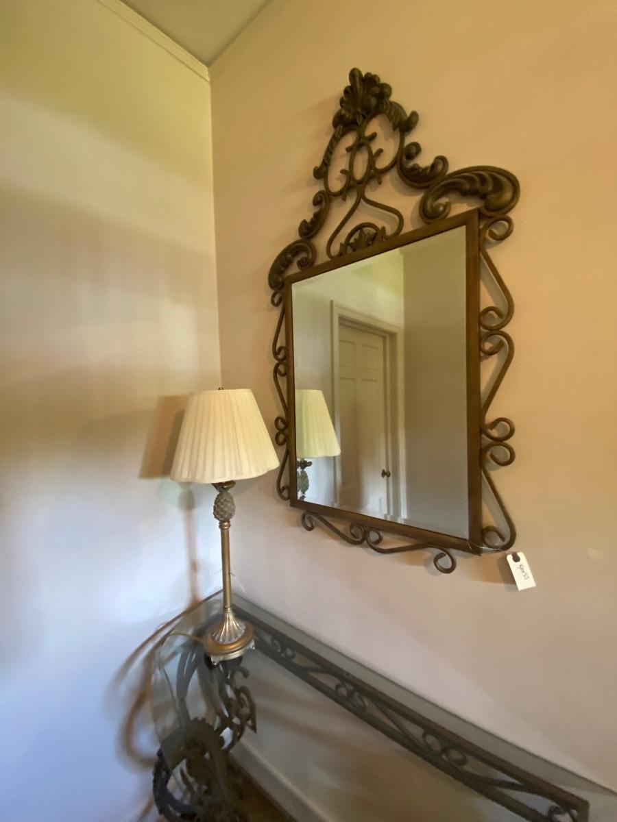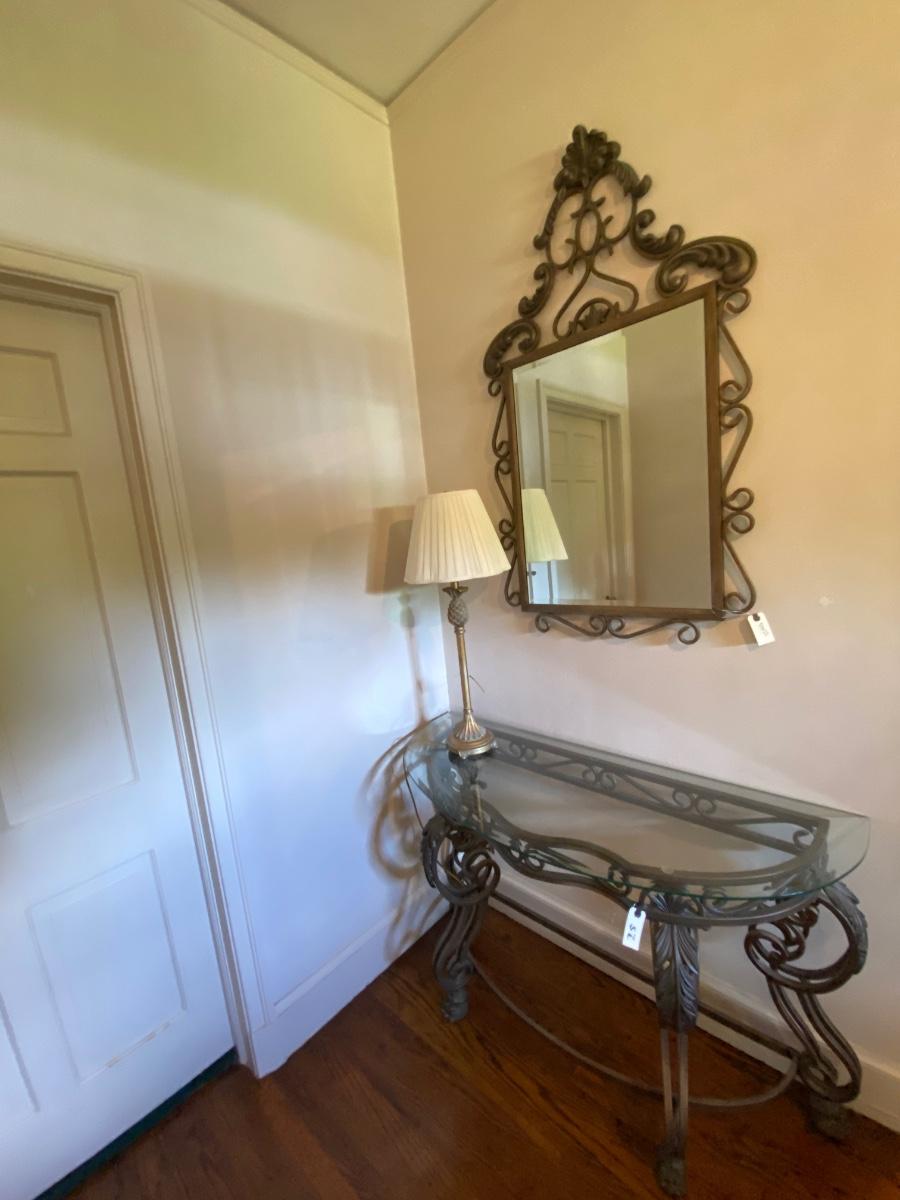 Iron Base Glass Top Console Table (30x19x48), Includes Mirror (50x27) and Candle Stick Lamp As Pictured