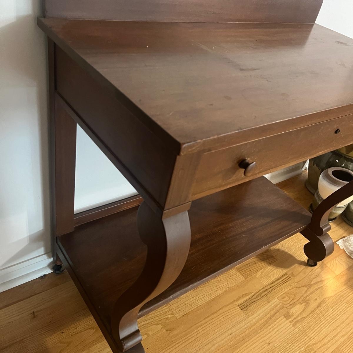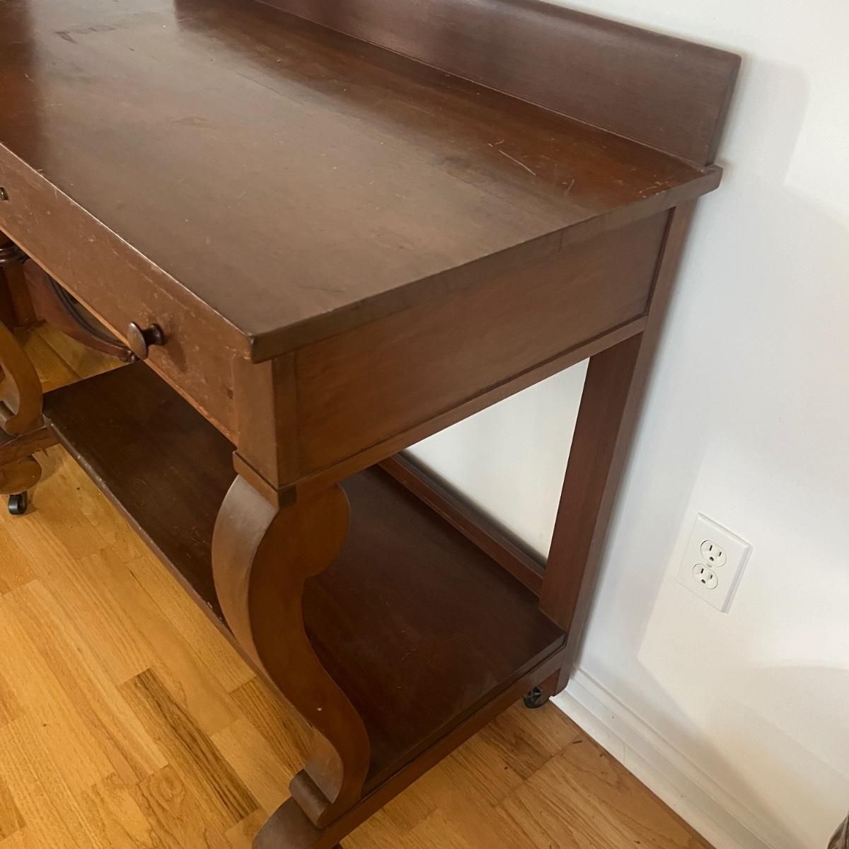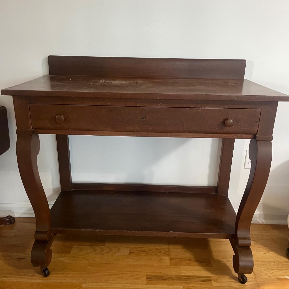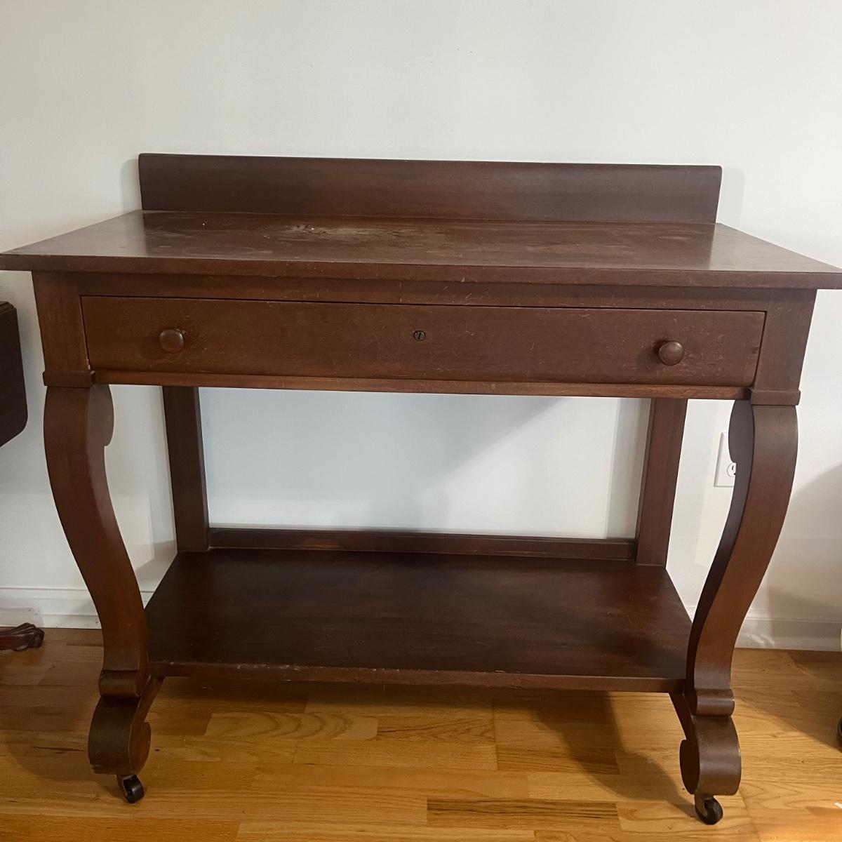 Lot includes a solid wood console table with dovetailed drawer and a shelf underneath. Has cabriole style front legs and sits on casters. No key is included. Table measures 40” x 20” x 28”H. Table has scratches and nicks. Please see pictures.