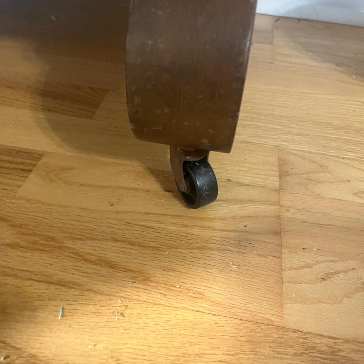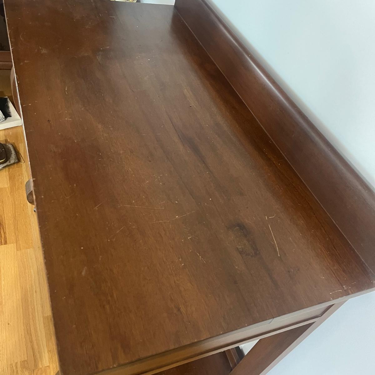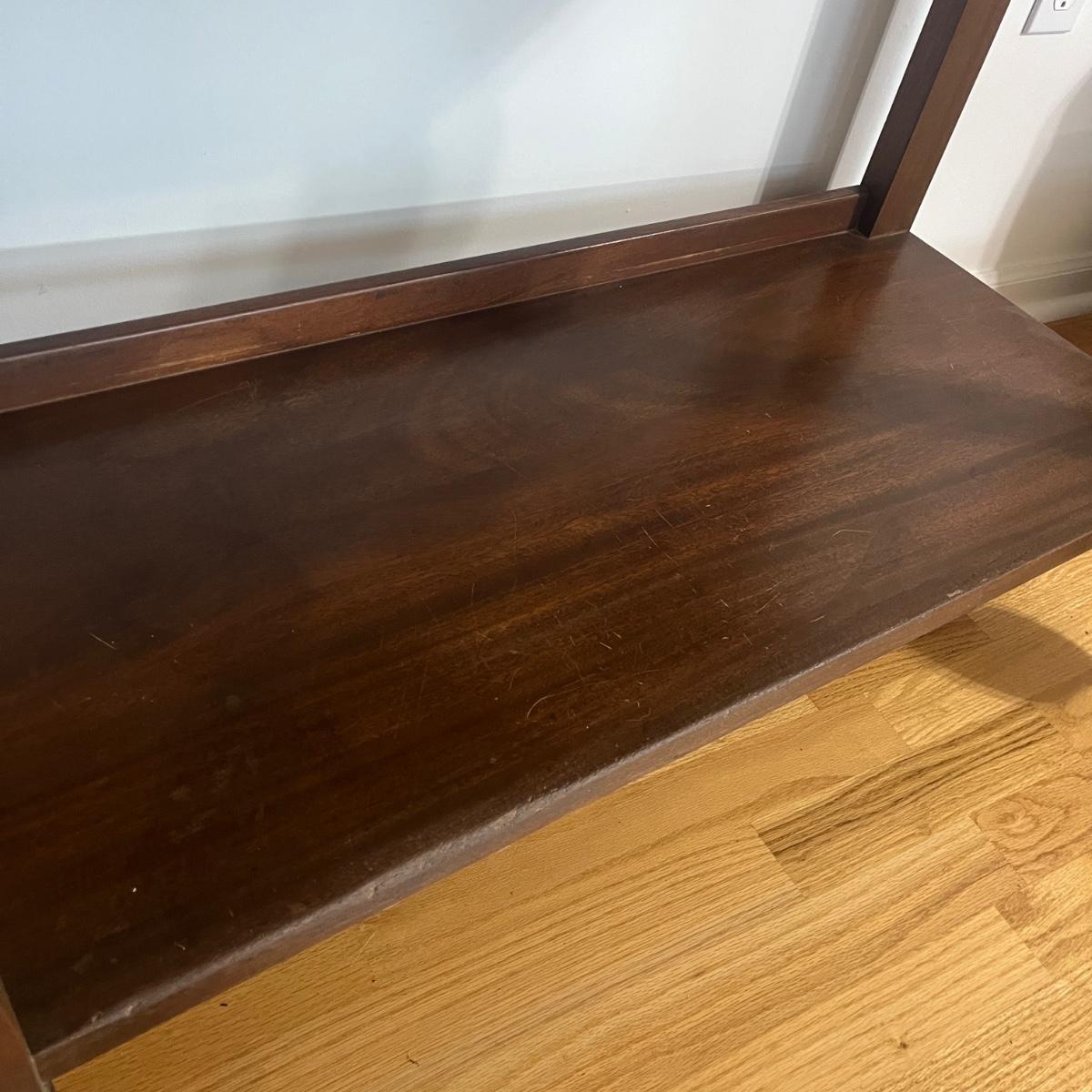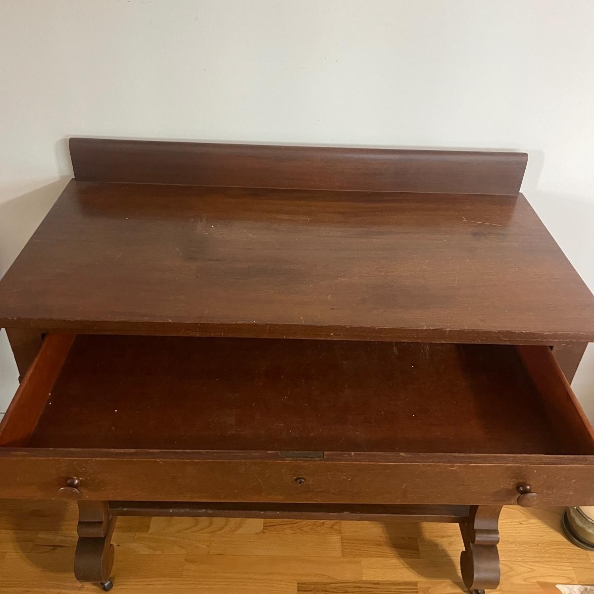 Lot includes a solid wood console table with dovetailed drawer and a shelf underneath. Has cabriole style front legs and sits on casters. No key is included. Table measures 40” x 20” x 28”H. Table has scratches and nicks. Please see pictures.