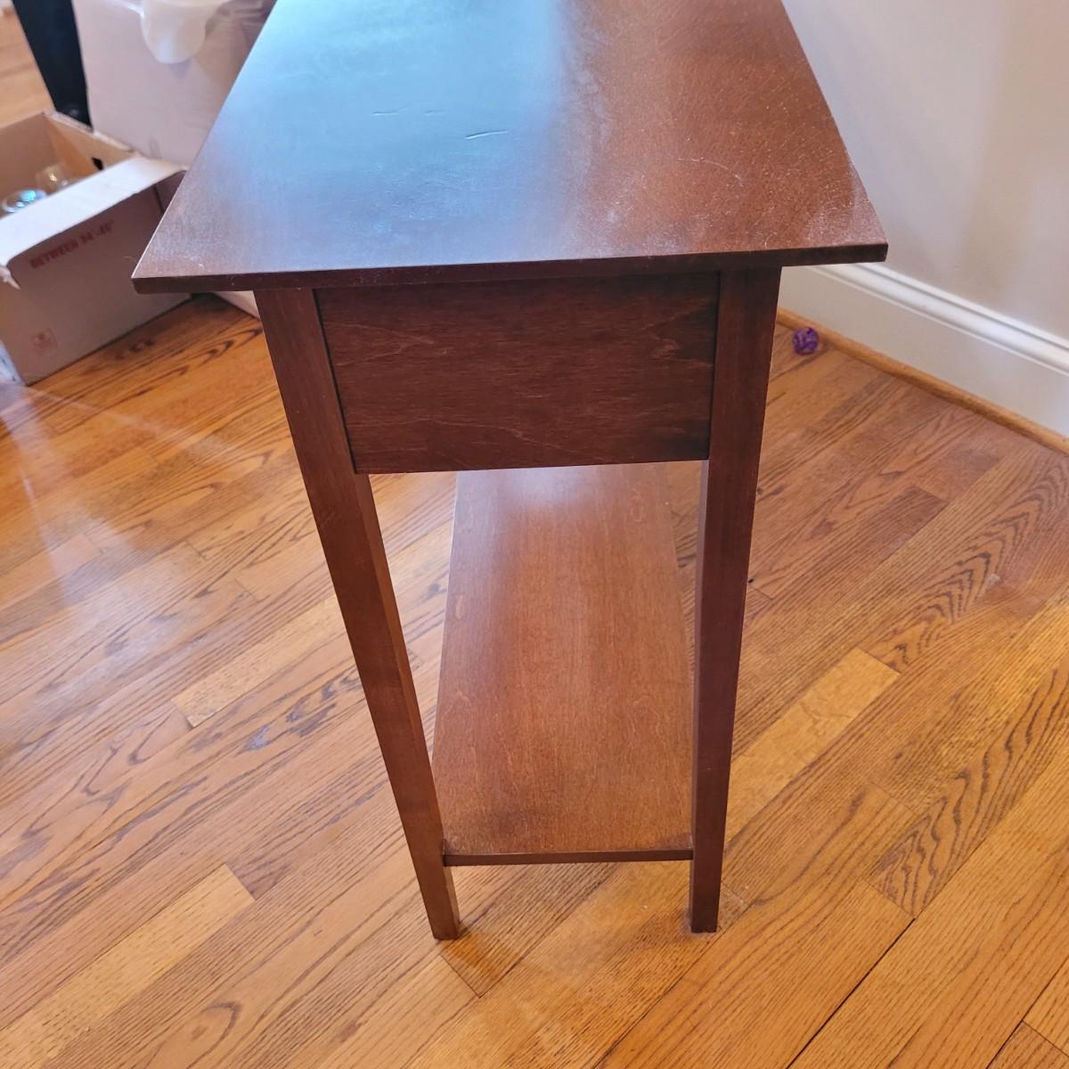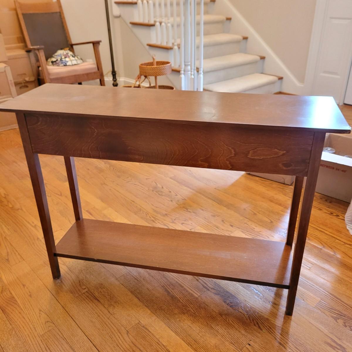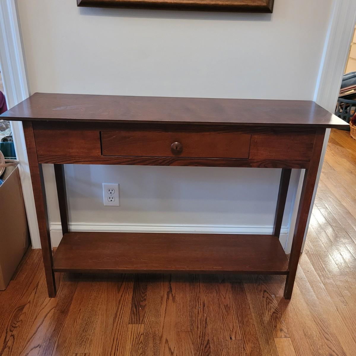 This wooden console table has a small single central drawer and a bottom shelf for extra display and storage. Measures approximately 42” x 13” x 29”H. Please note the slight damage to one corner. Local pickup only. Winning bidder must bring assistance to help move and load this item due to its weight and size.