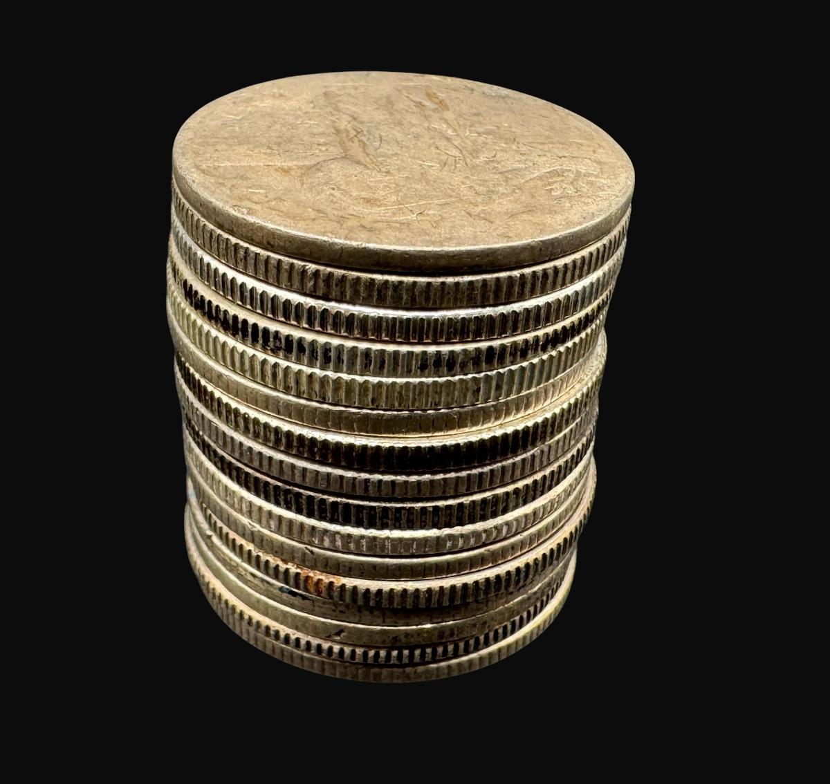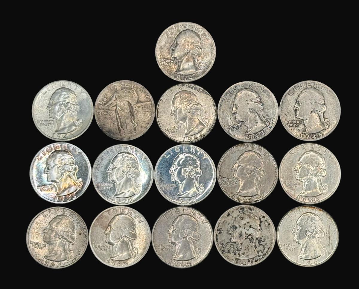 **WIRE TRANSFER IS REQUIRED IF SHIPPED.** Includes 15 pre-1964 Washington quarters with various dates, and one illegibly dated Standing Liberty quarter. Total of 16 pieces. Silver content is 90%. Some are uncirculated. **ALL PRECIOUS METALS SALES ARE FINAL. NO REFUNDS WILL BE GIVEN FOR ANY REASON.** [AG]