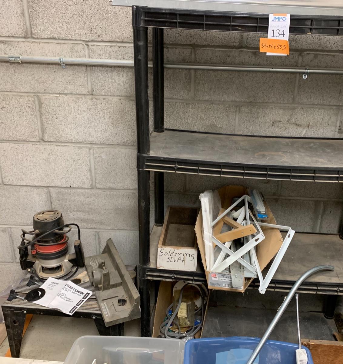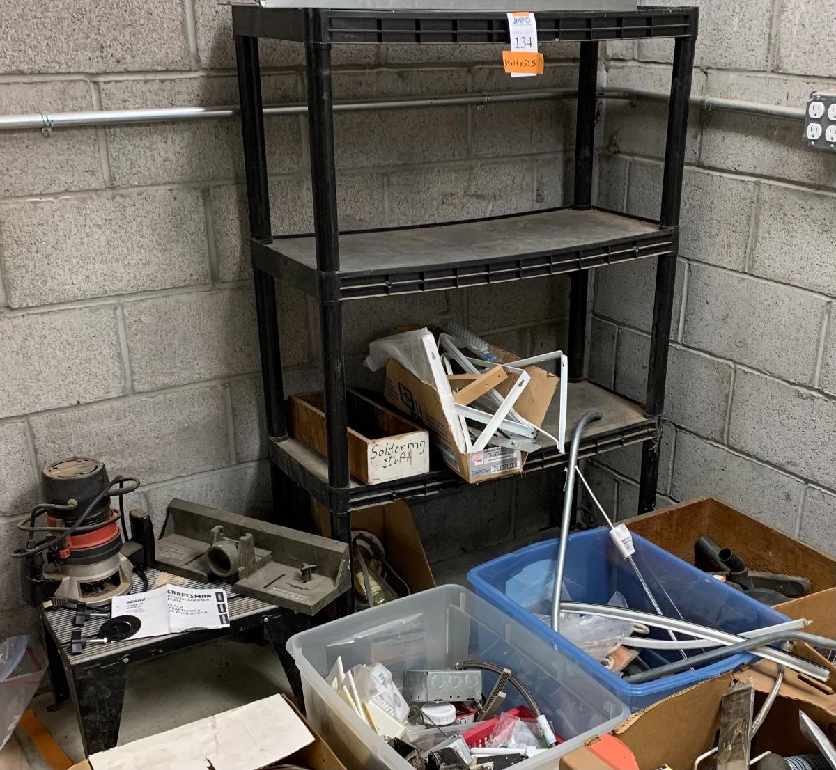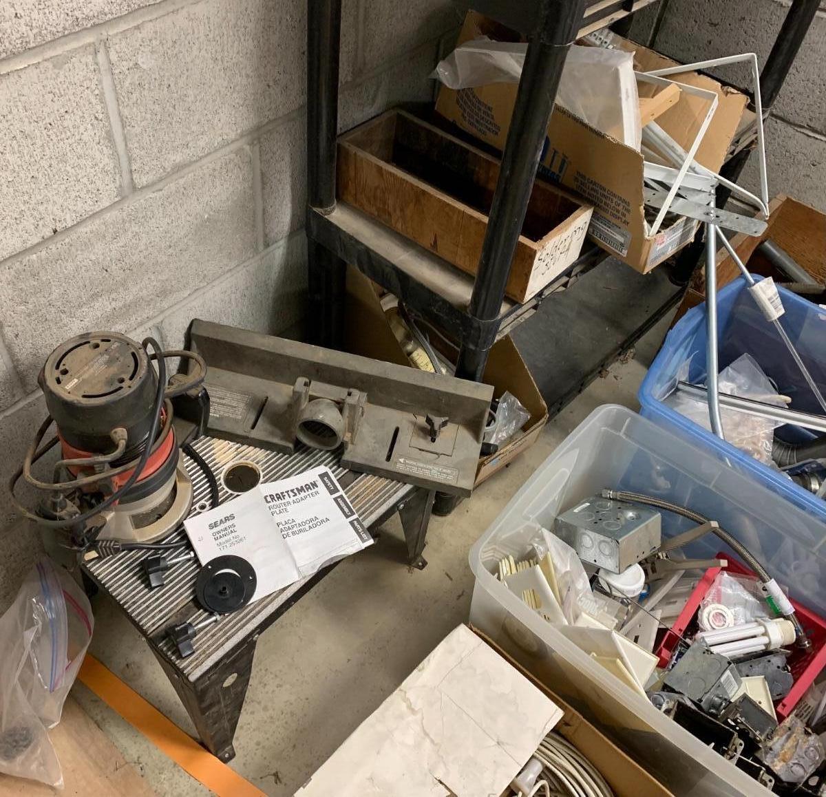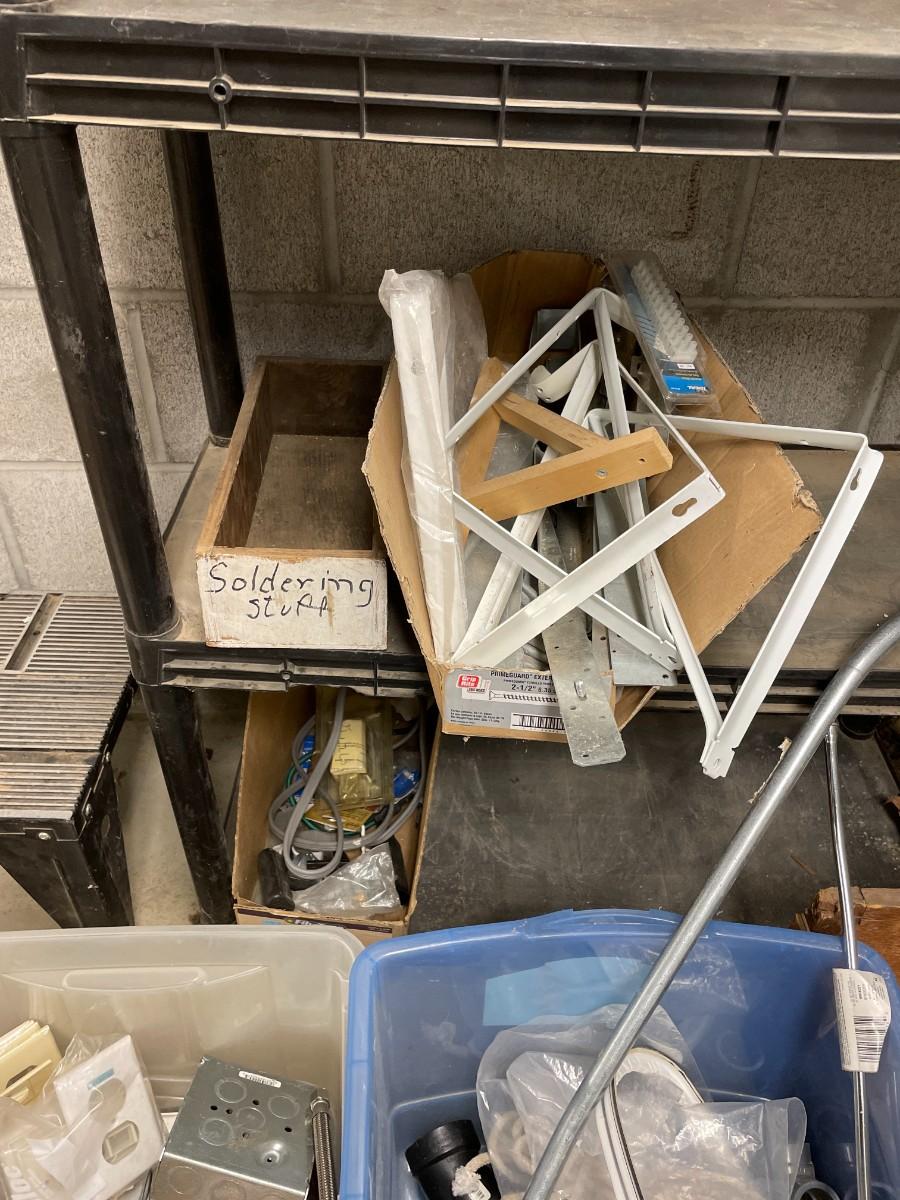 Riser/support for saw. Shelf brackets. Plastic shelving unit. Junction boxes and wall plates. Wire and conduit. Other garage items as shown.