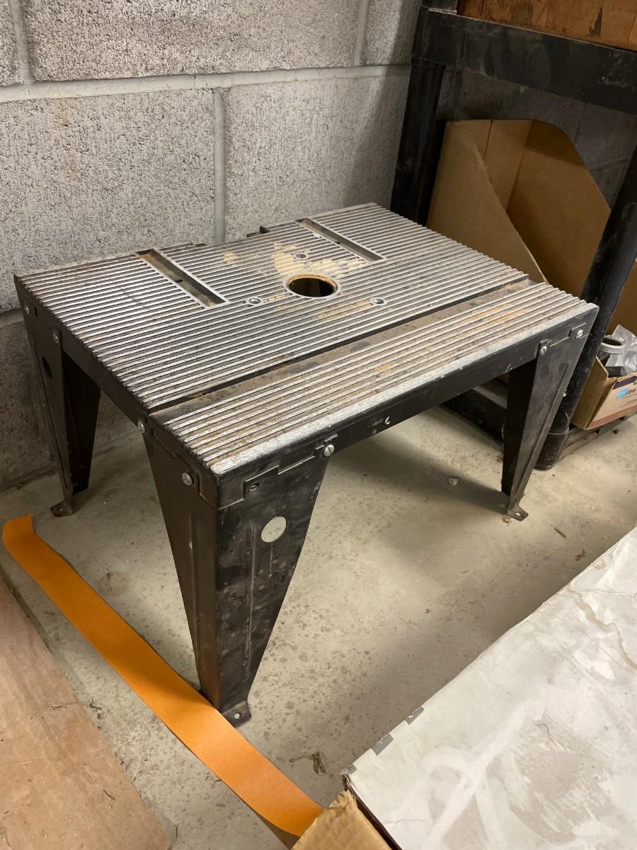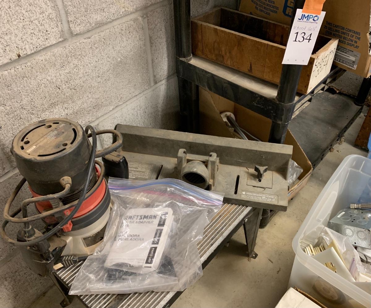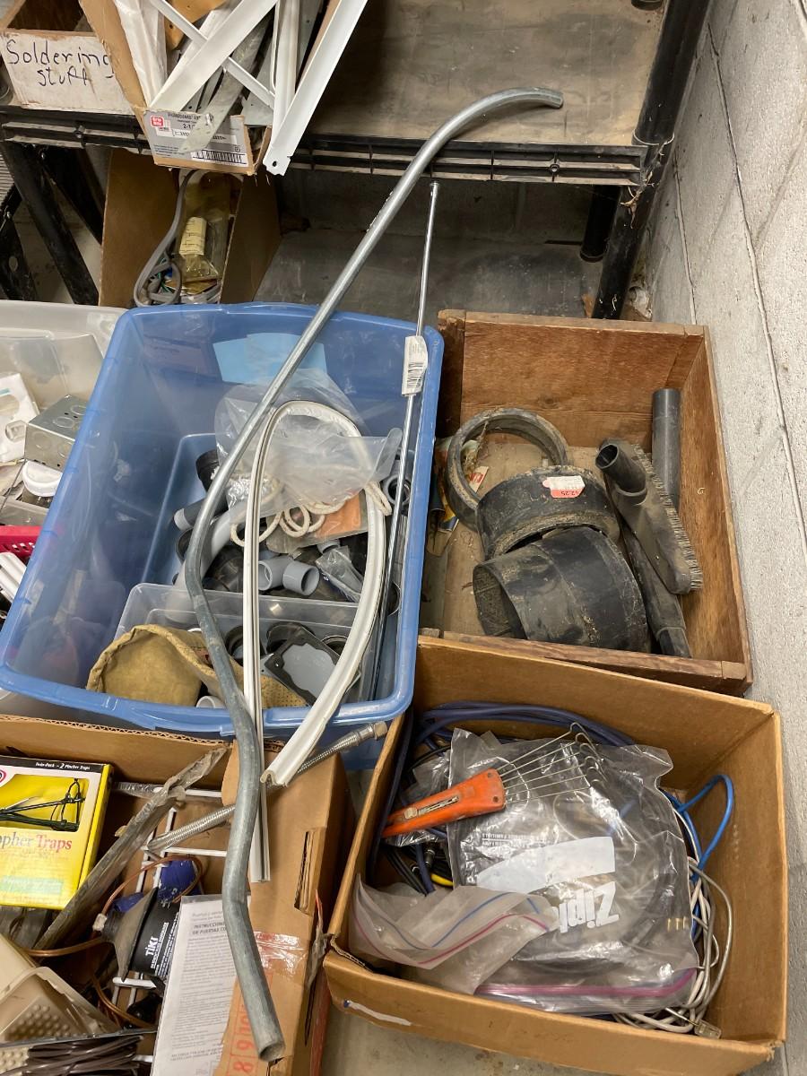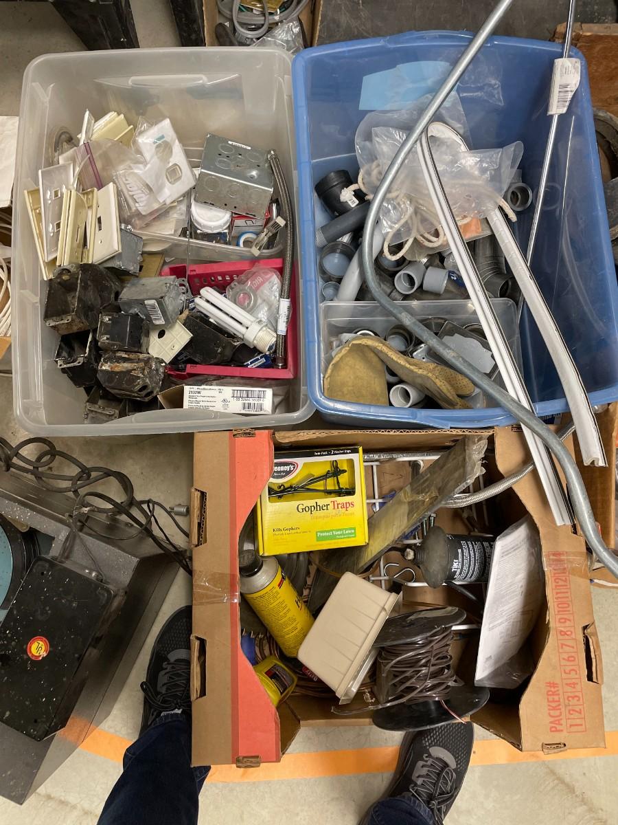 Riser/support for saw. Shelf brackets. Plastic shelving unit. Junction boxes and wall plates. Wire and conduit. Other garage items as shown.