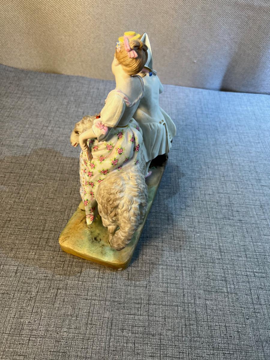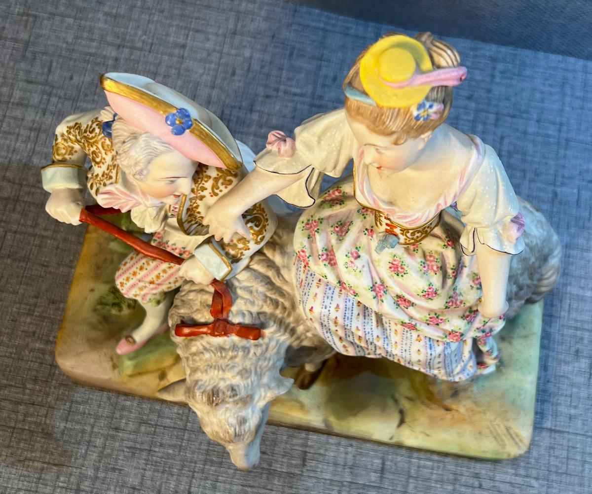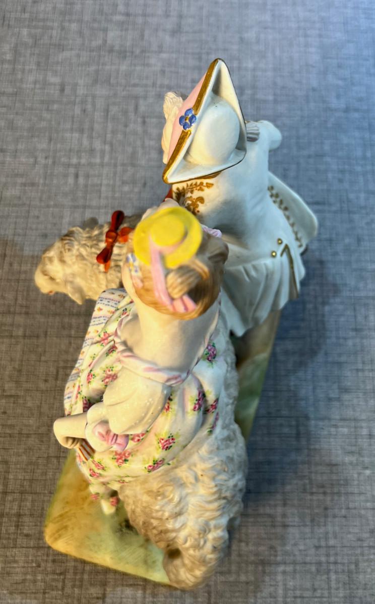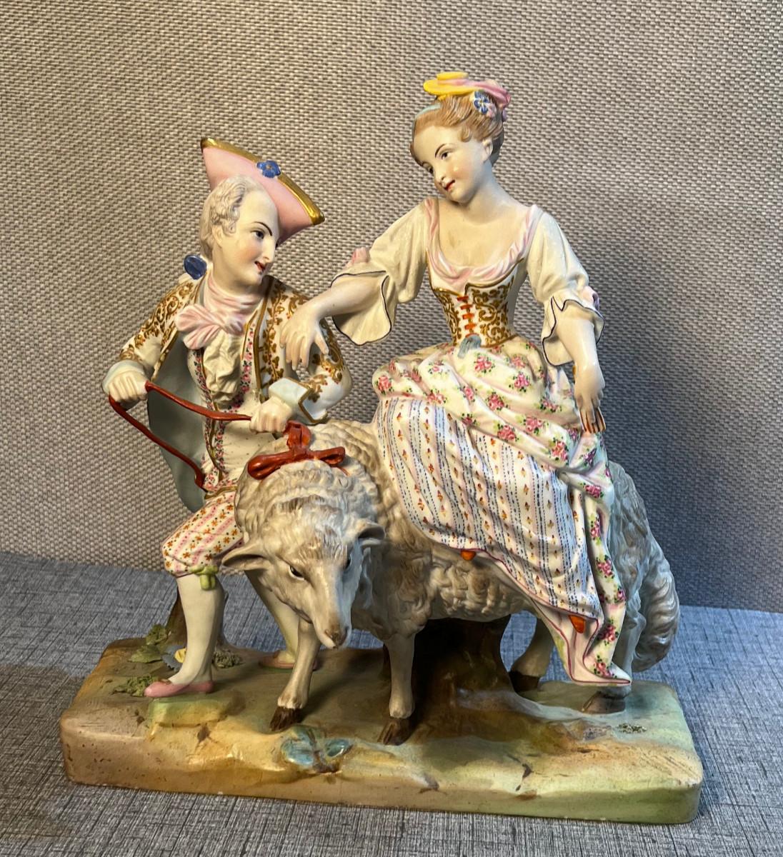 Awesome figurine with a woman riding a sheep. This figurine dates to the 1870's and is fine German porcelain. 9.5" tall and 8.5" wide.