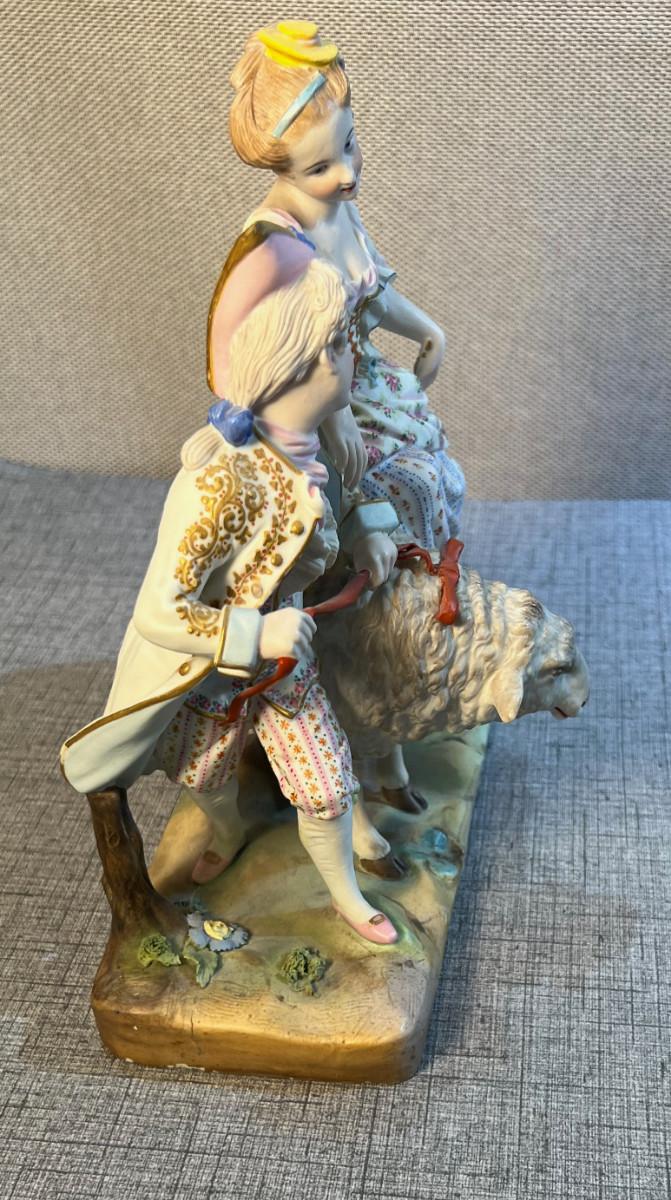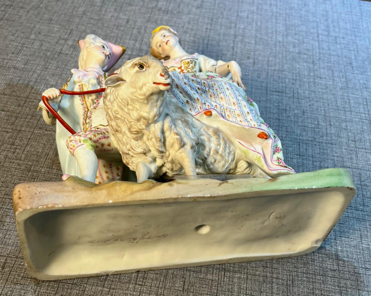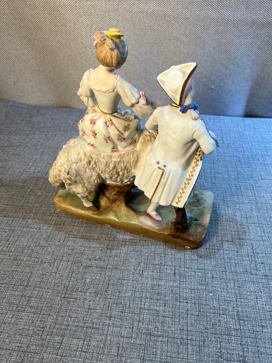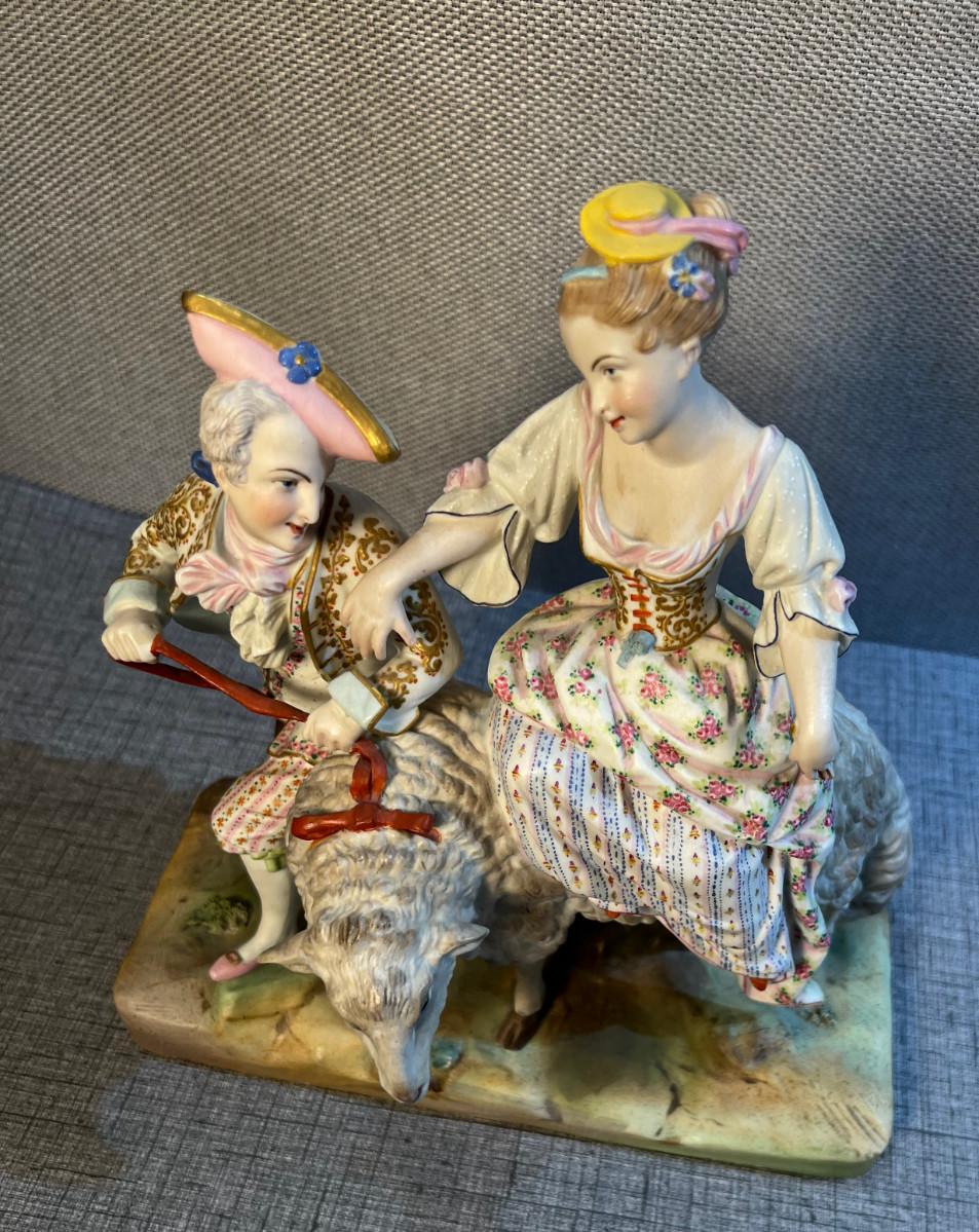 Awesome figurine with a woman riding a sheep. This figurine dates to the 1870's and is fine German porcelain. 9.5" tall and 8.5" wide.