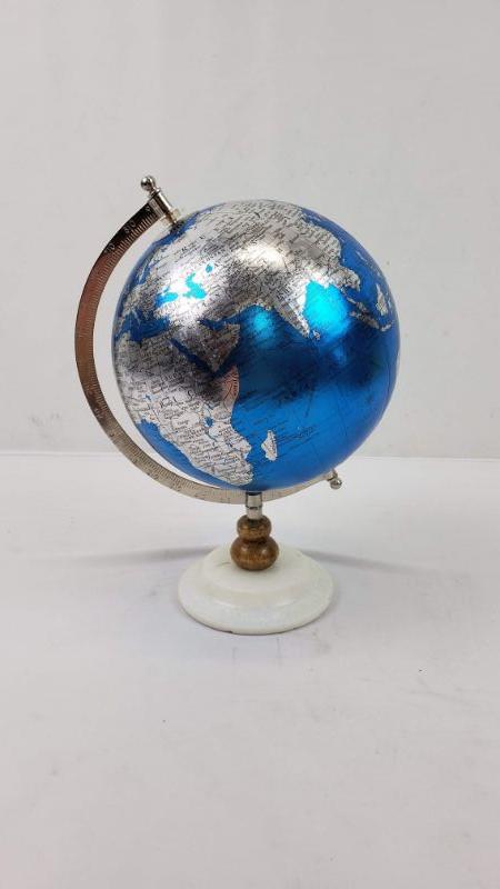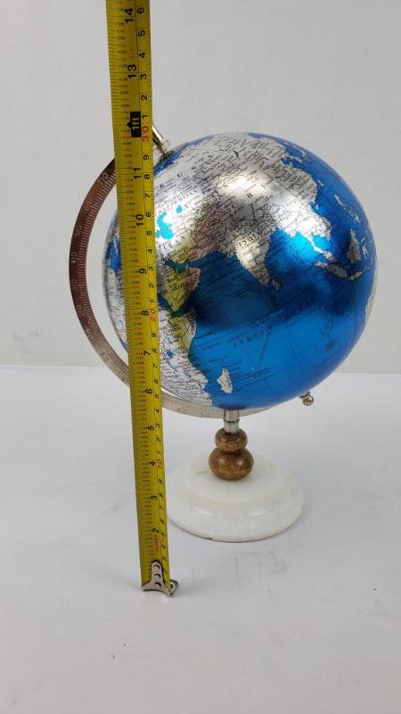 Contemporary 13 Inch Plastic And Marble Pedestal World Globe, Blue - New