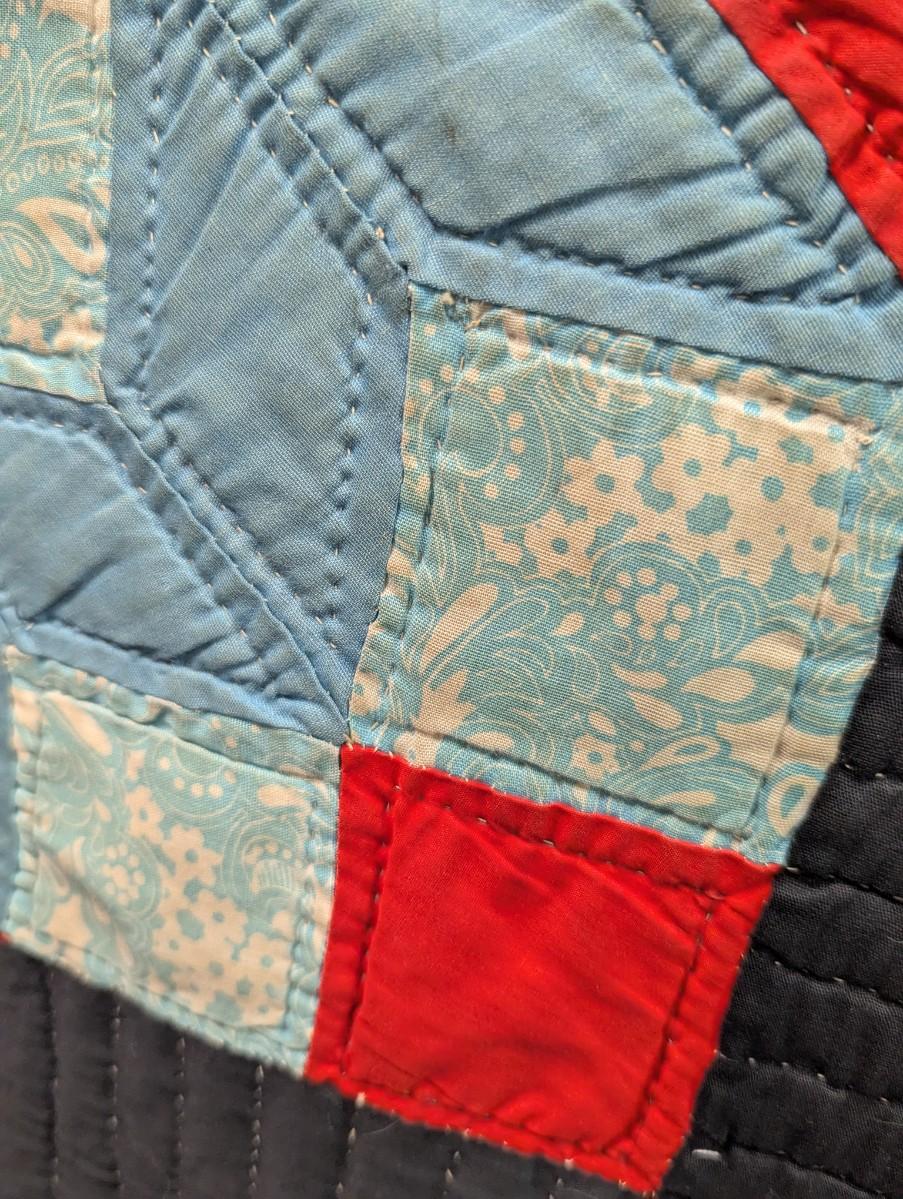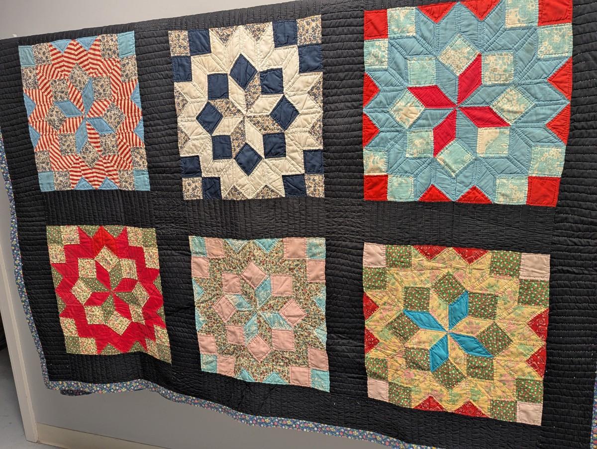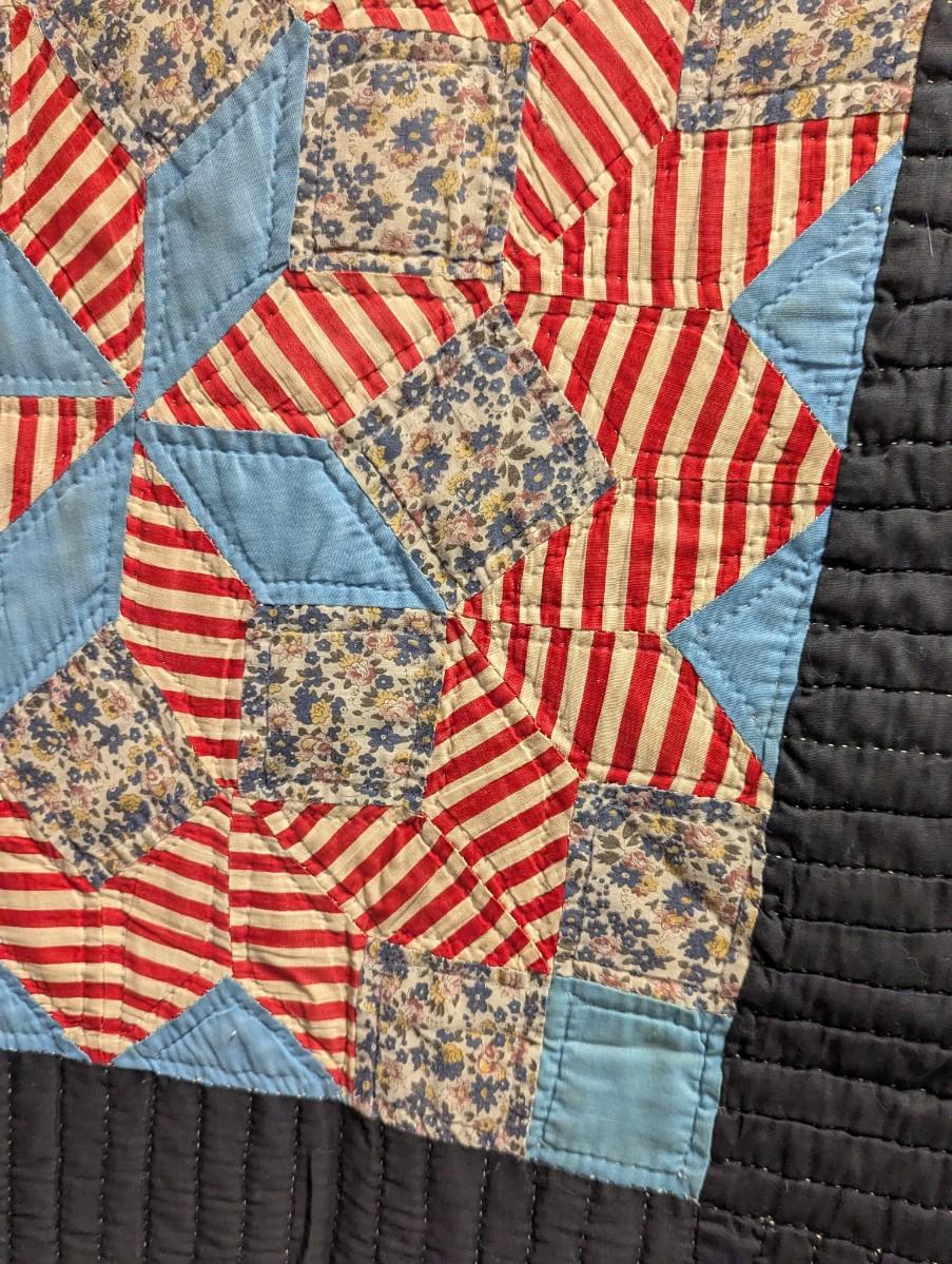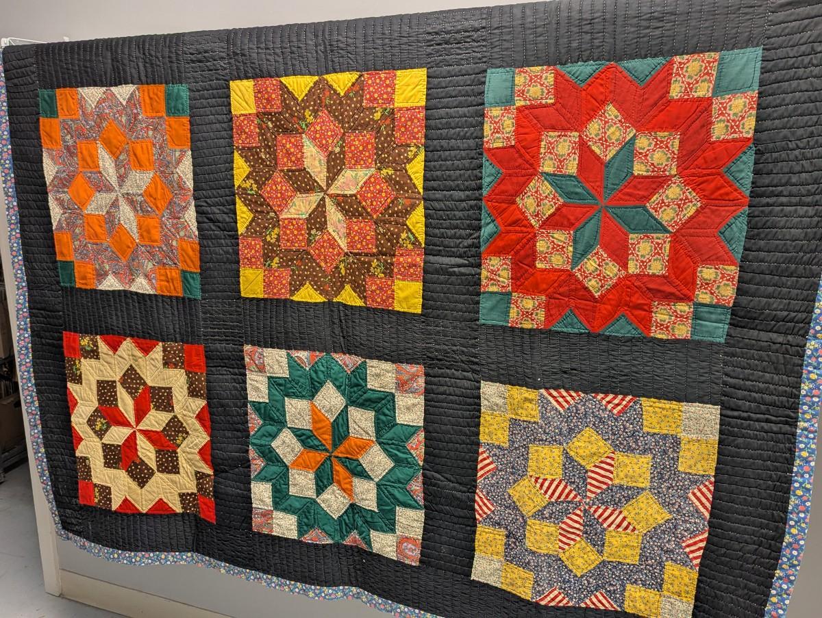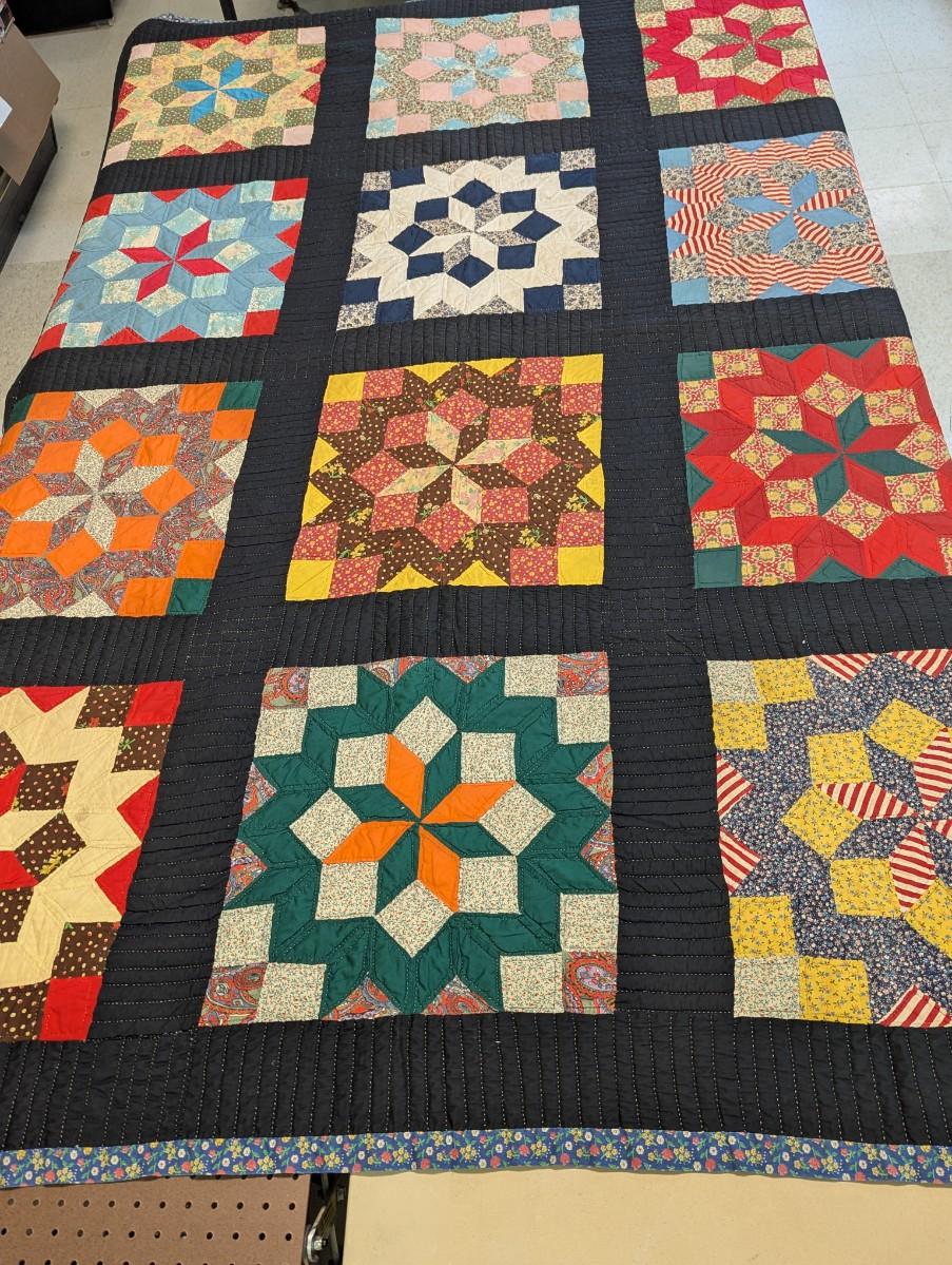Multi-color variegated prints in bold primary colors against a black background 4 1/2 inch black border and calico binding