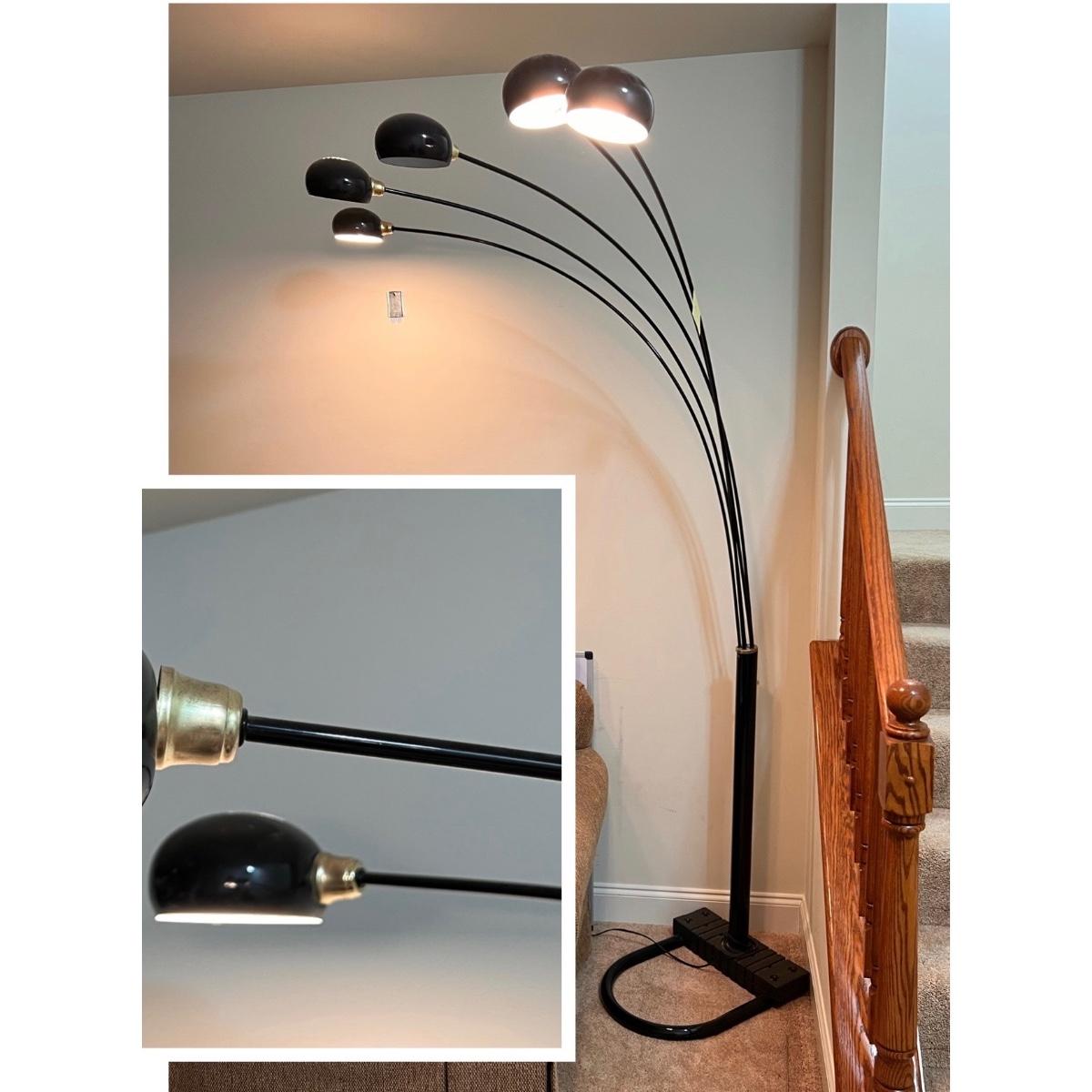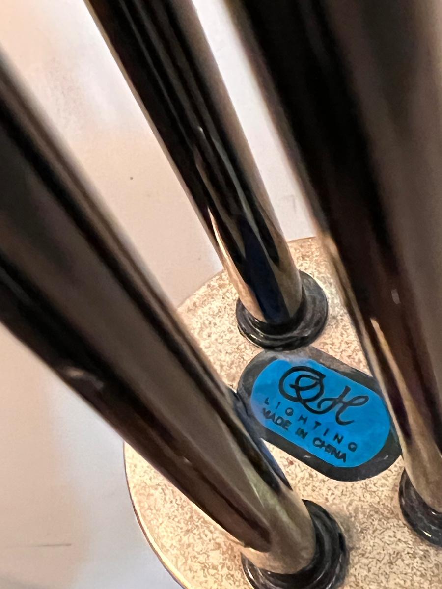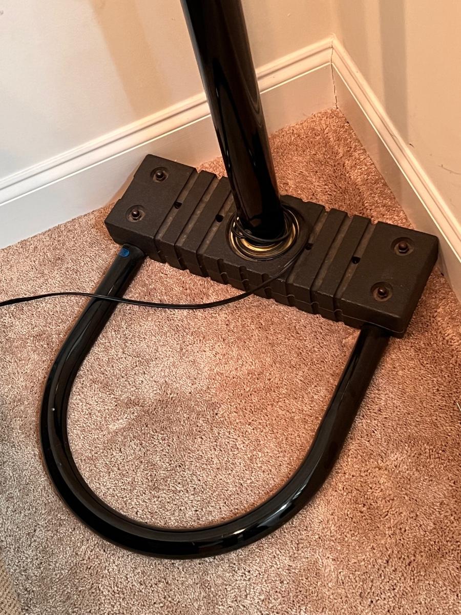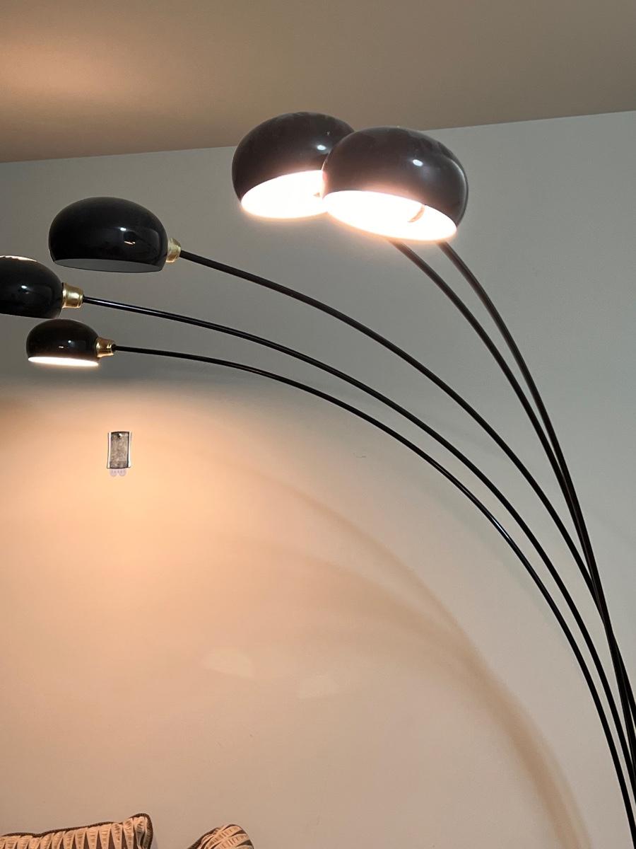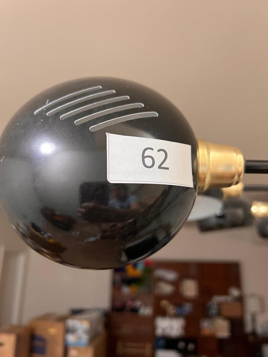 Has dimming switch, large tip free base that hides under a couch or chair. Black metal with gold hardware. In good used condition.