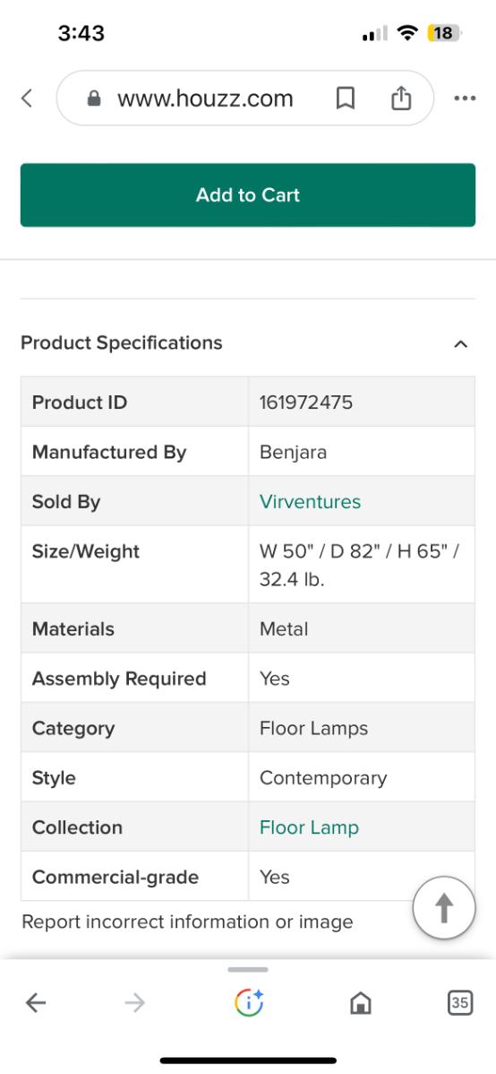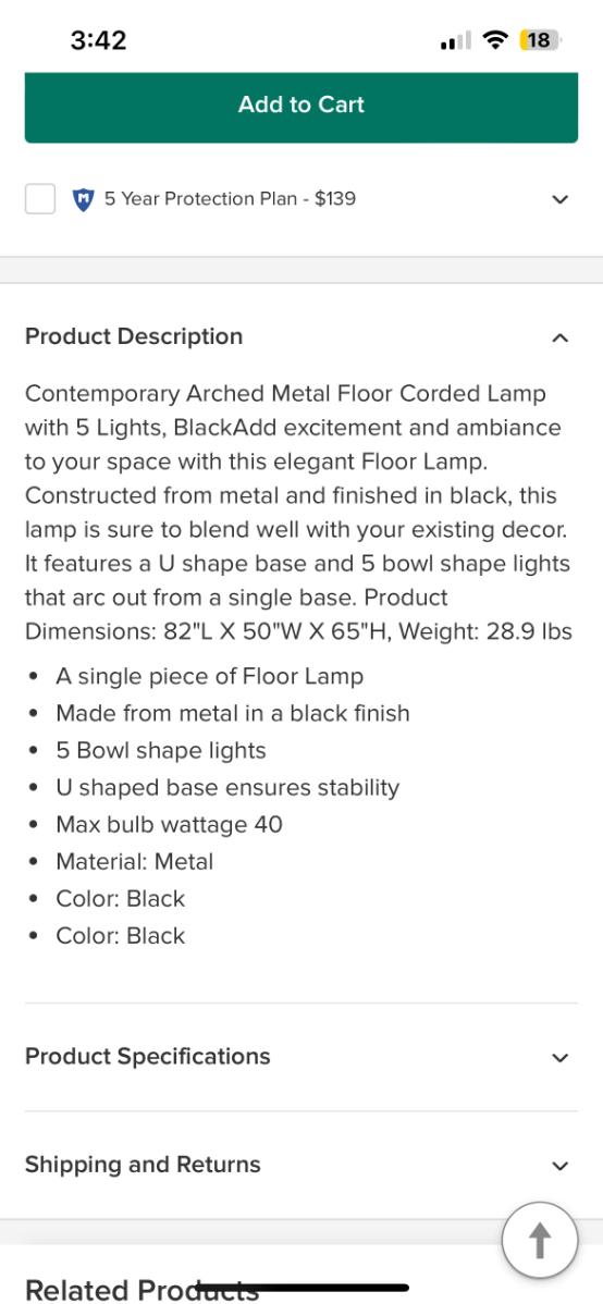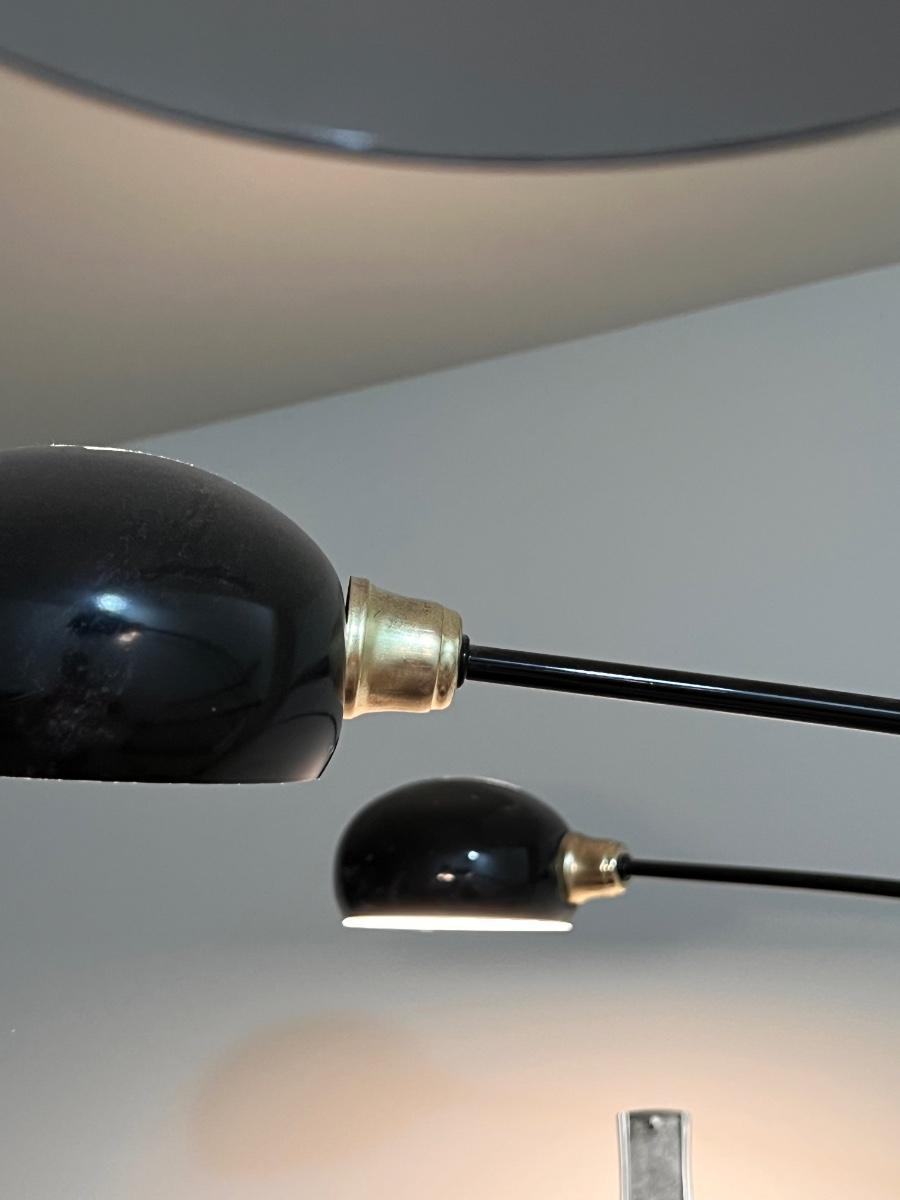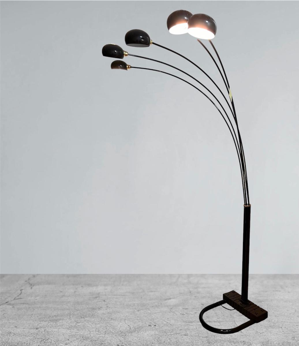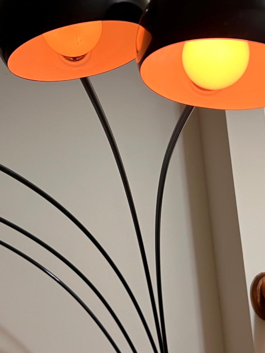 Has dimming switch, large tip free base that hides under a couch or chair. Black metal with gold hardware. In good used condition.