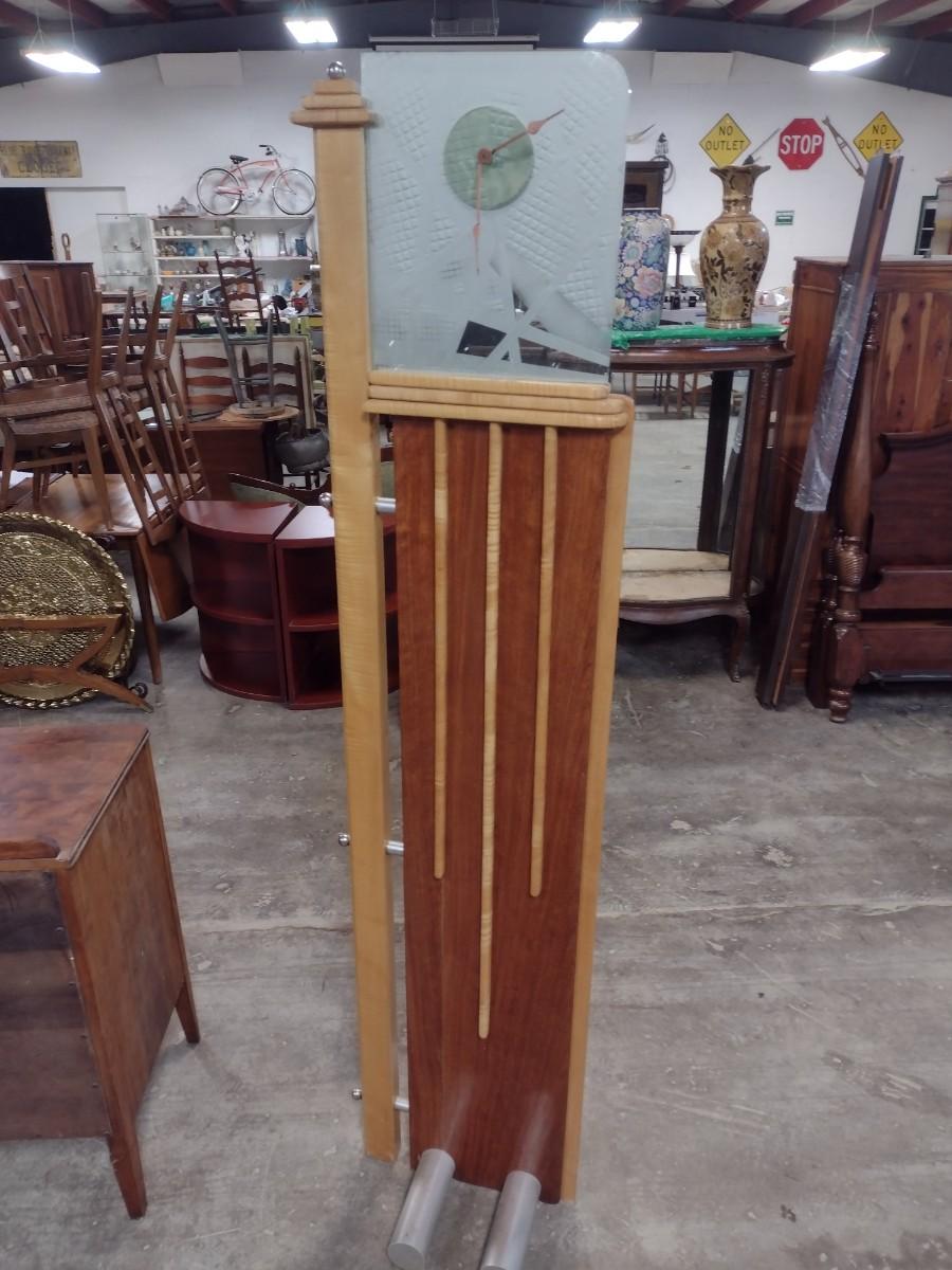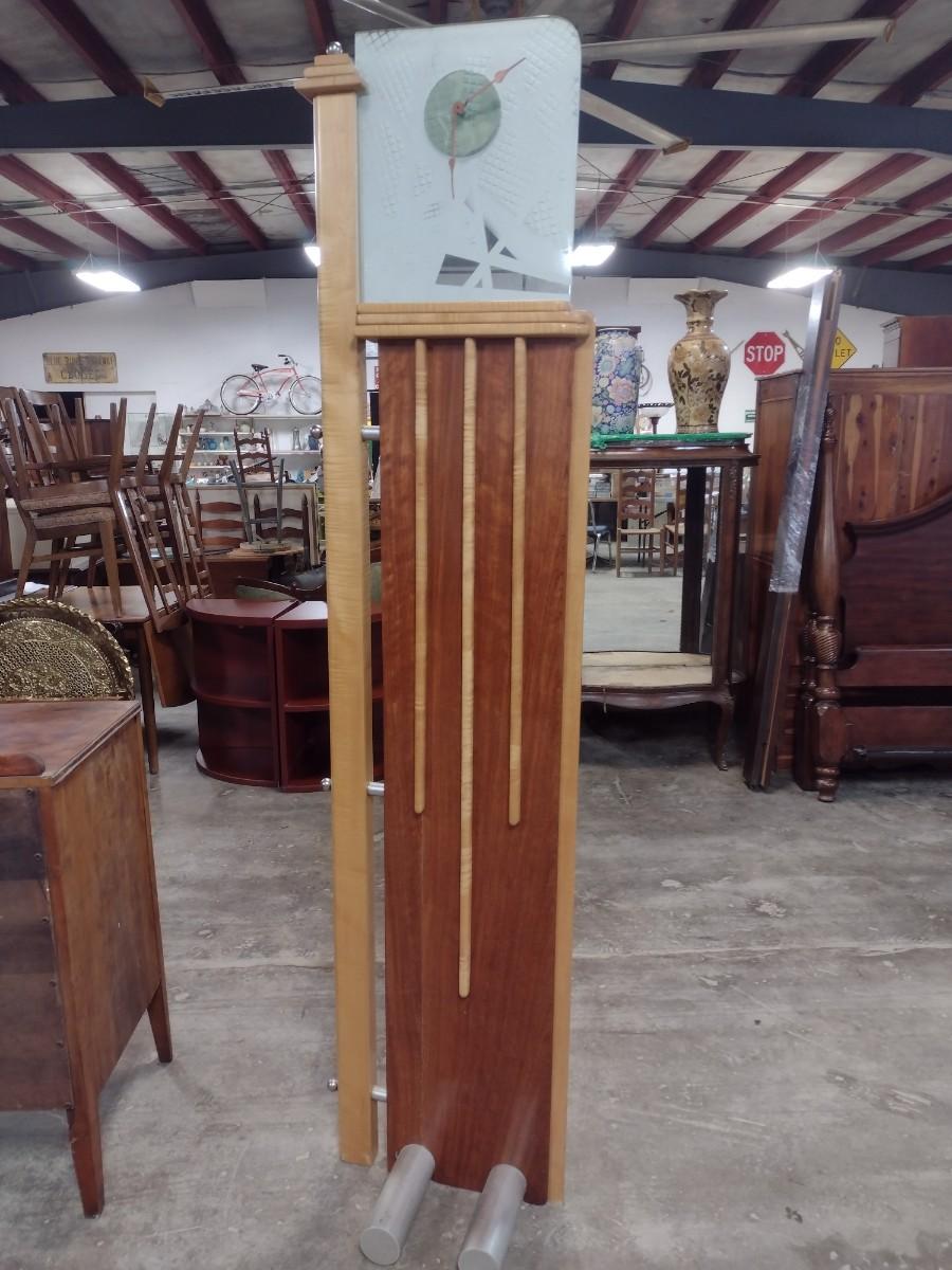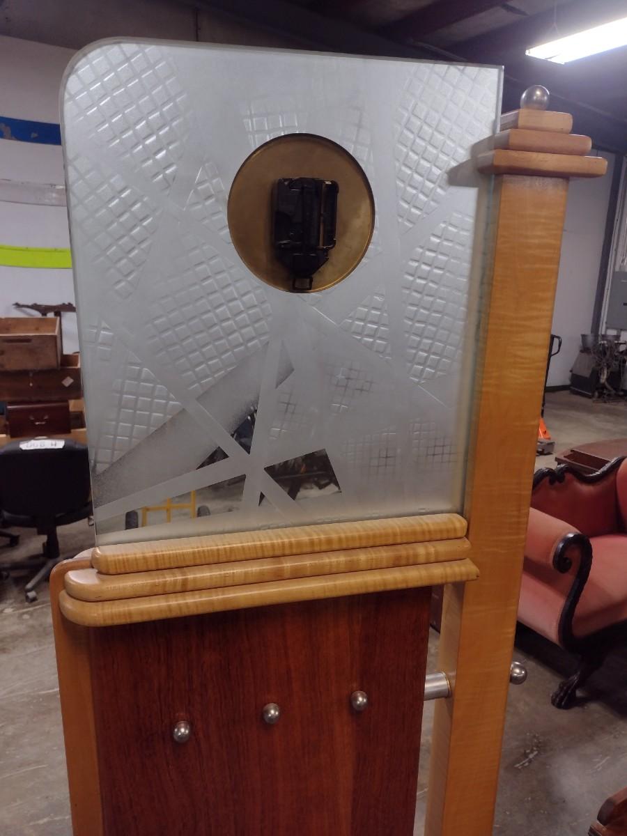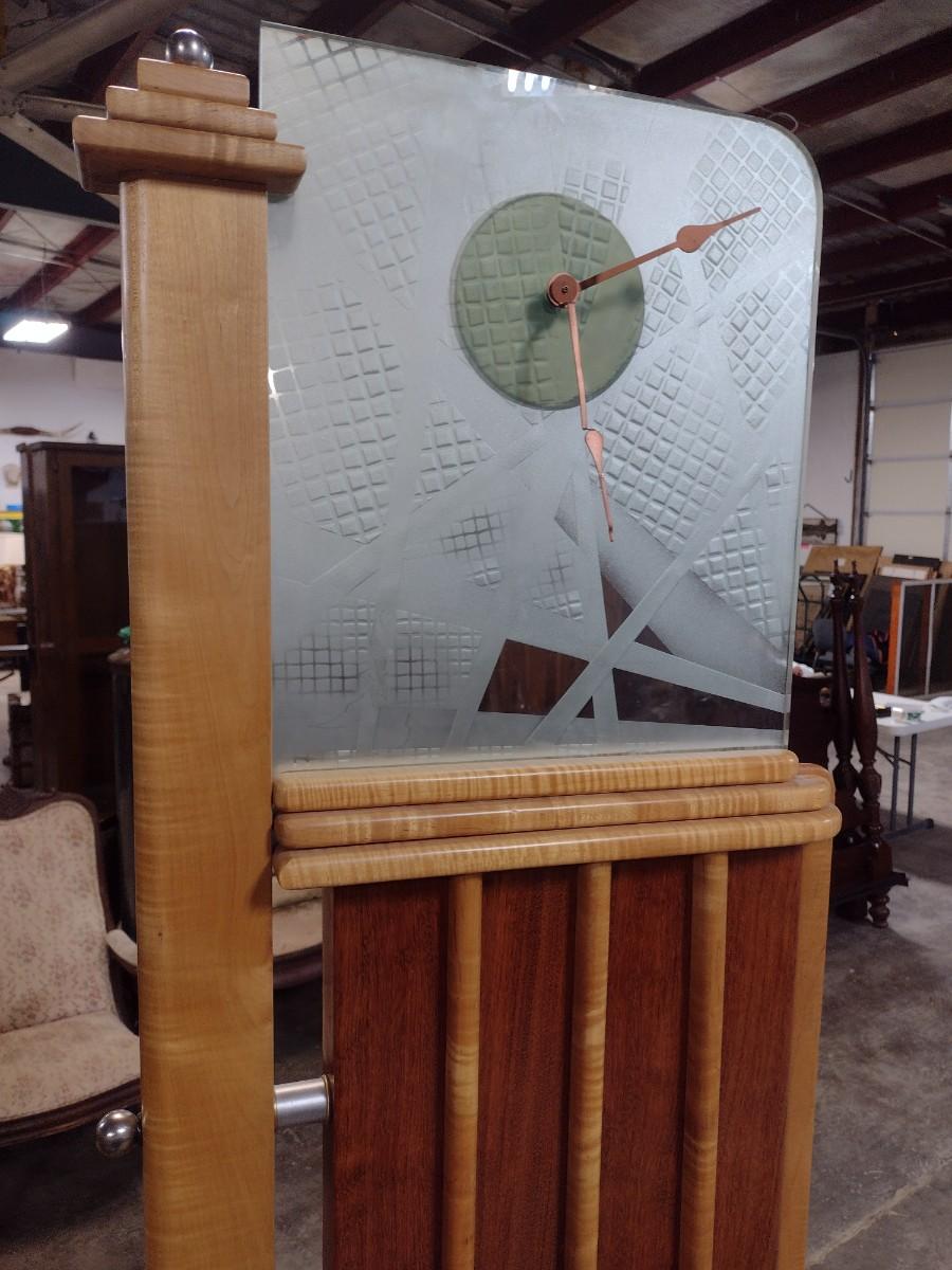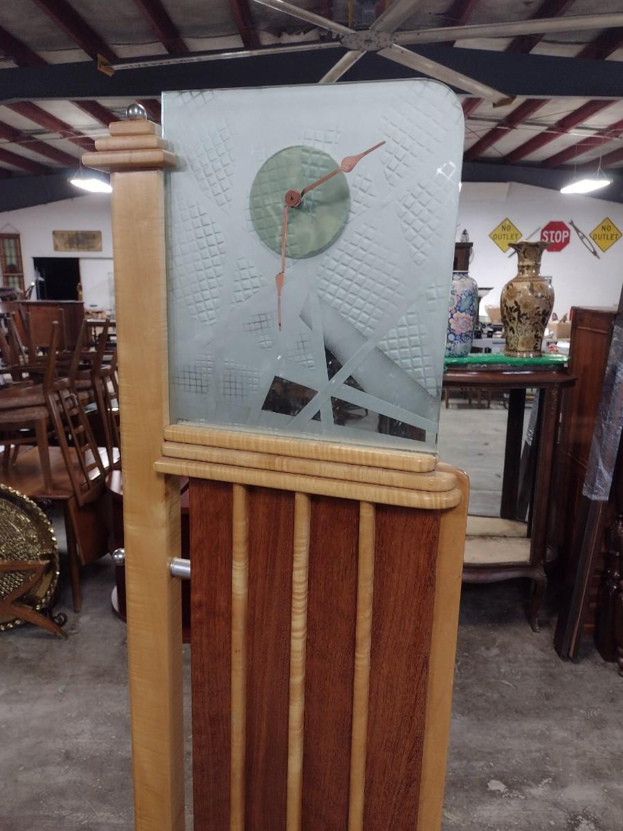 Contemporary Artisan Crafted Wood Floor Clock with Etched Glass Face.