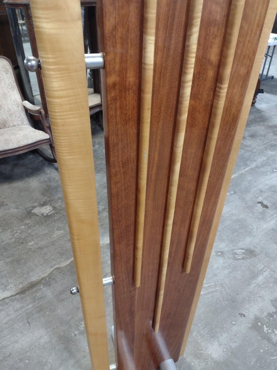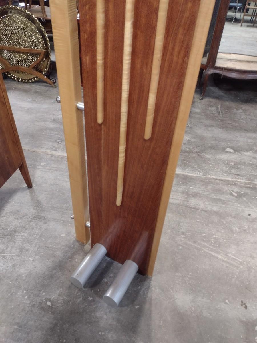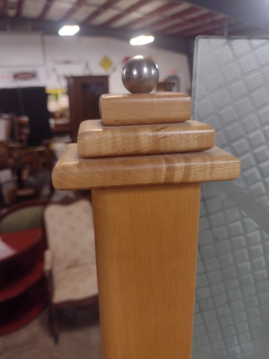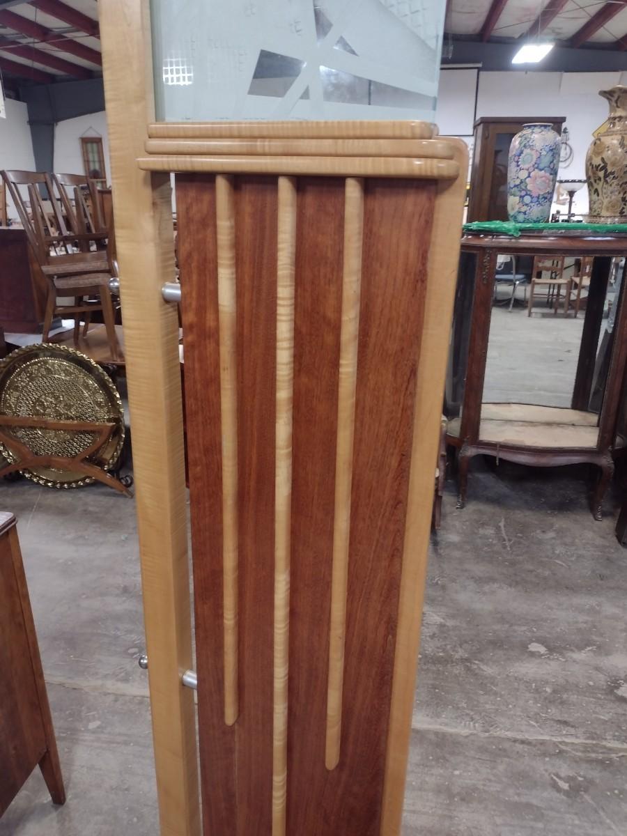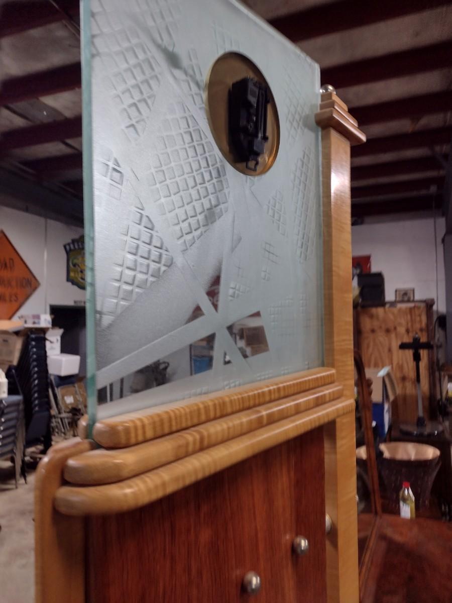 Contemporary Artisan Crafted Wood Floor Clock with Etched Glass Face.