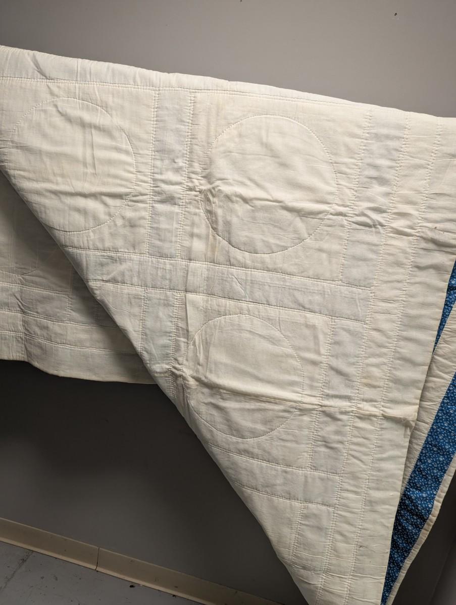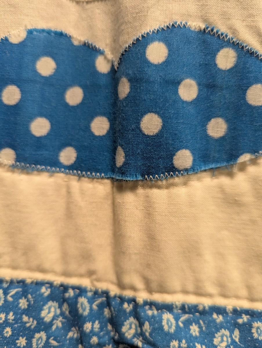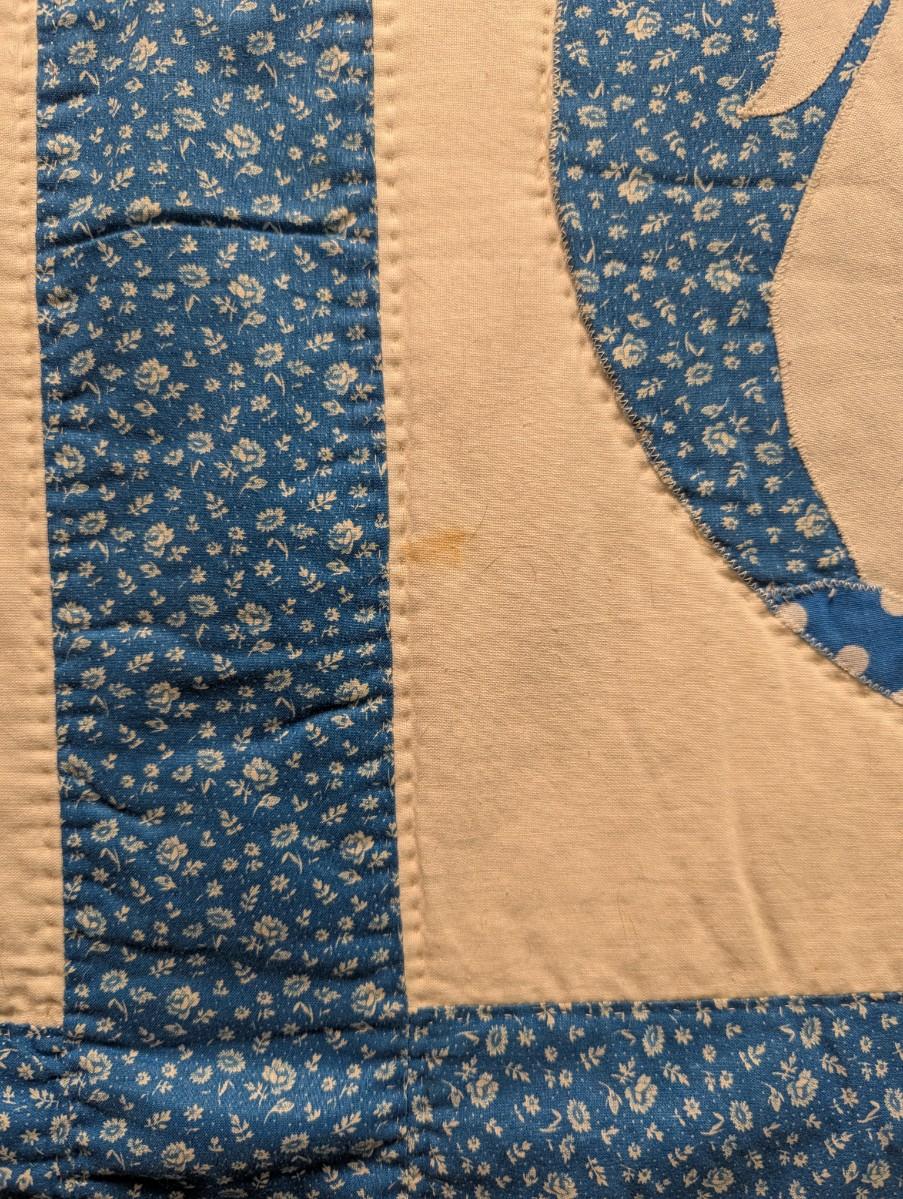Appliqued within blue calico window frames. Applique by machine hand quilted. Very good condition