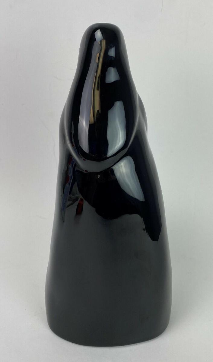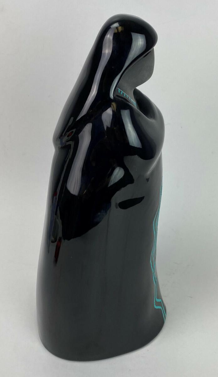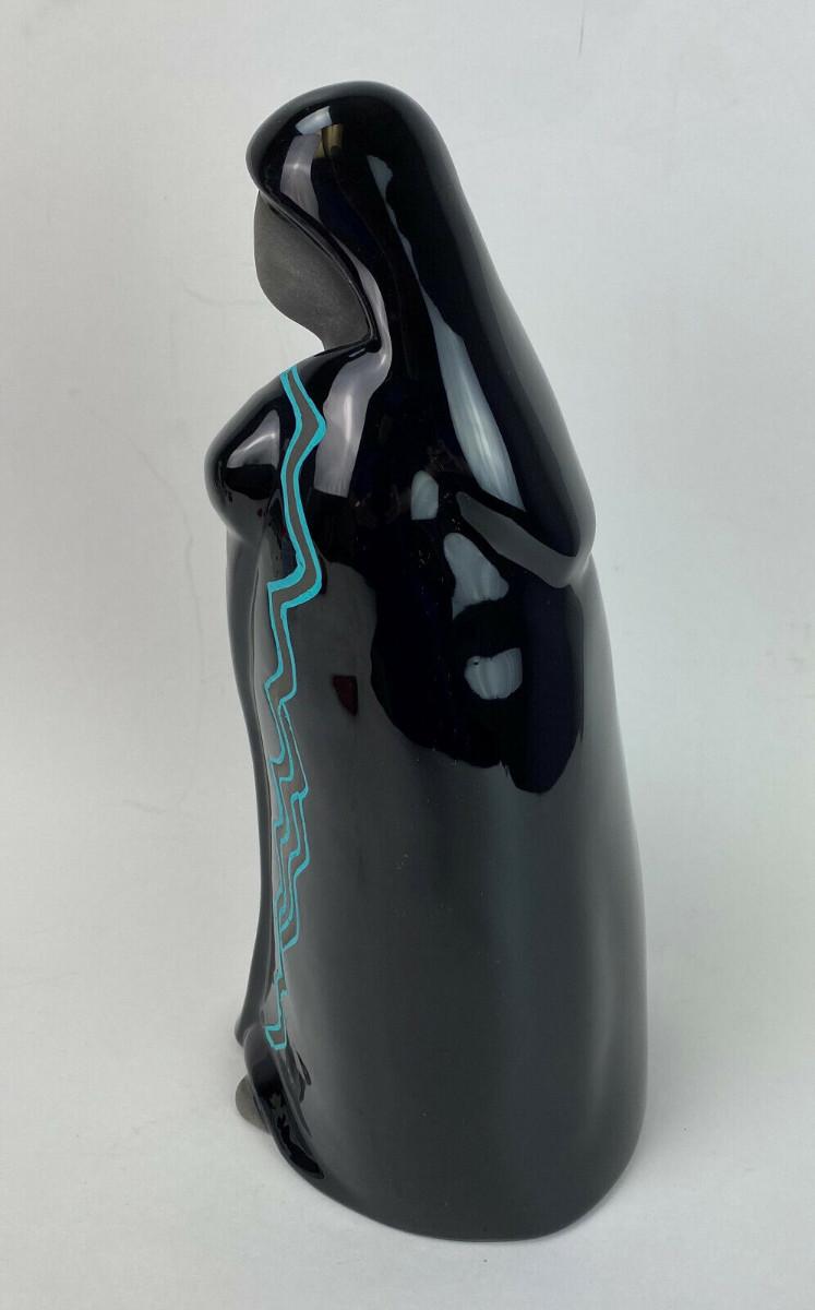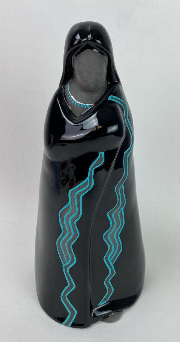 Black gloss on unglazed black with painted accents on this abstract blanketed Native American woman..11" tall figure...Unsigned...Unknown origin...Possibly Native American pottery? Excellent condition on this contemporary art...No chips or cracks...Estate find...Offered with no reserve...