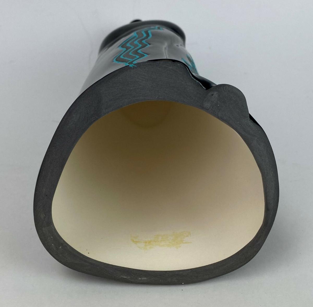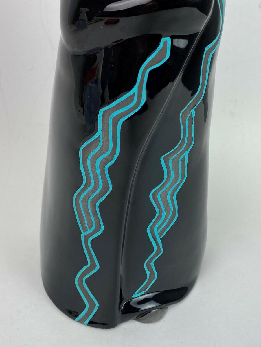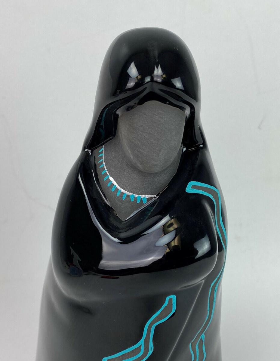 Black gloss on unglazed black with painted accents on this abstract blanketed Native American woman..11" tall figure...Unsigned...Unknown origin...Possibly Native American pottery? Excellent condition on this contemporary art...No chips or cracks...Estate find...Offered with no reserve...