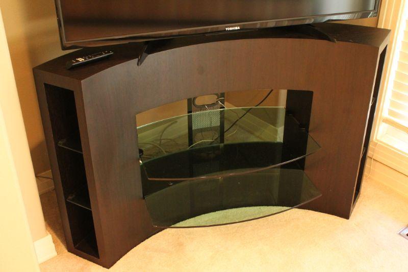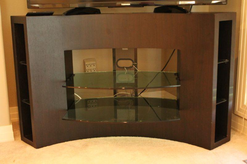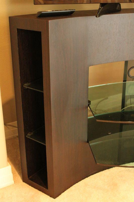 Lot 25: Contemporary Dark Brown Wood & Glass Curved Entertainment Stand