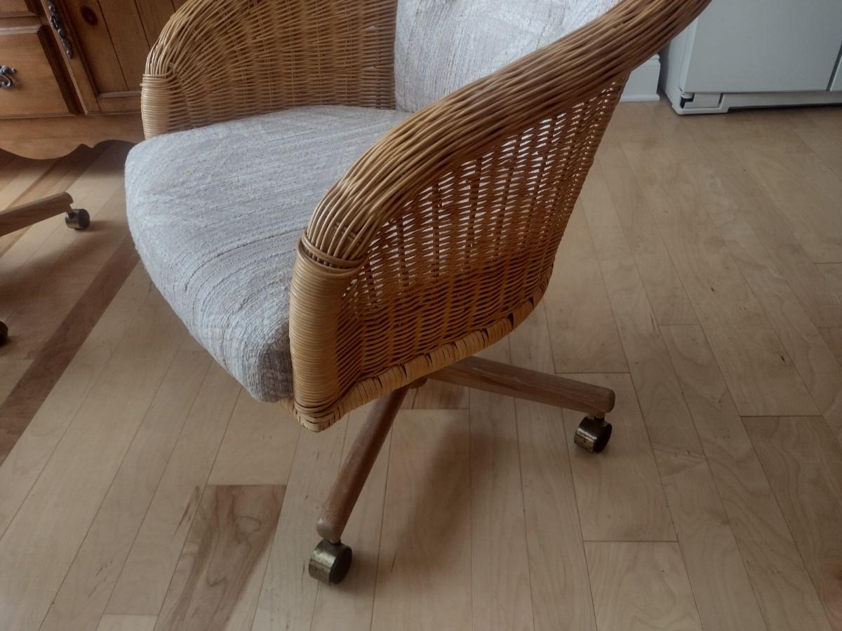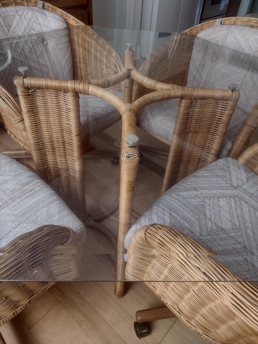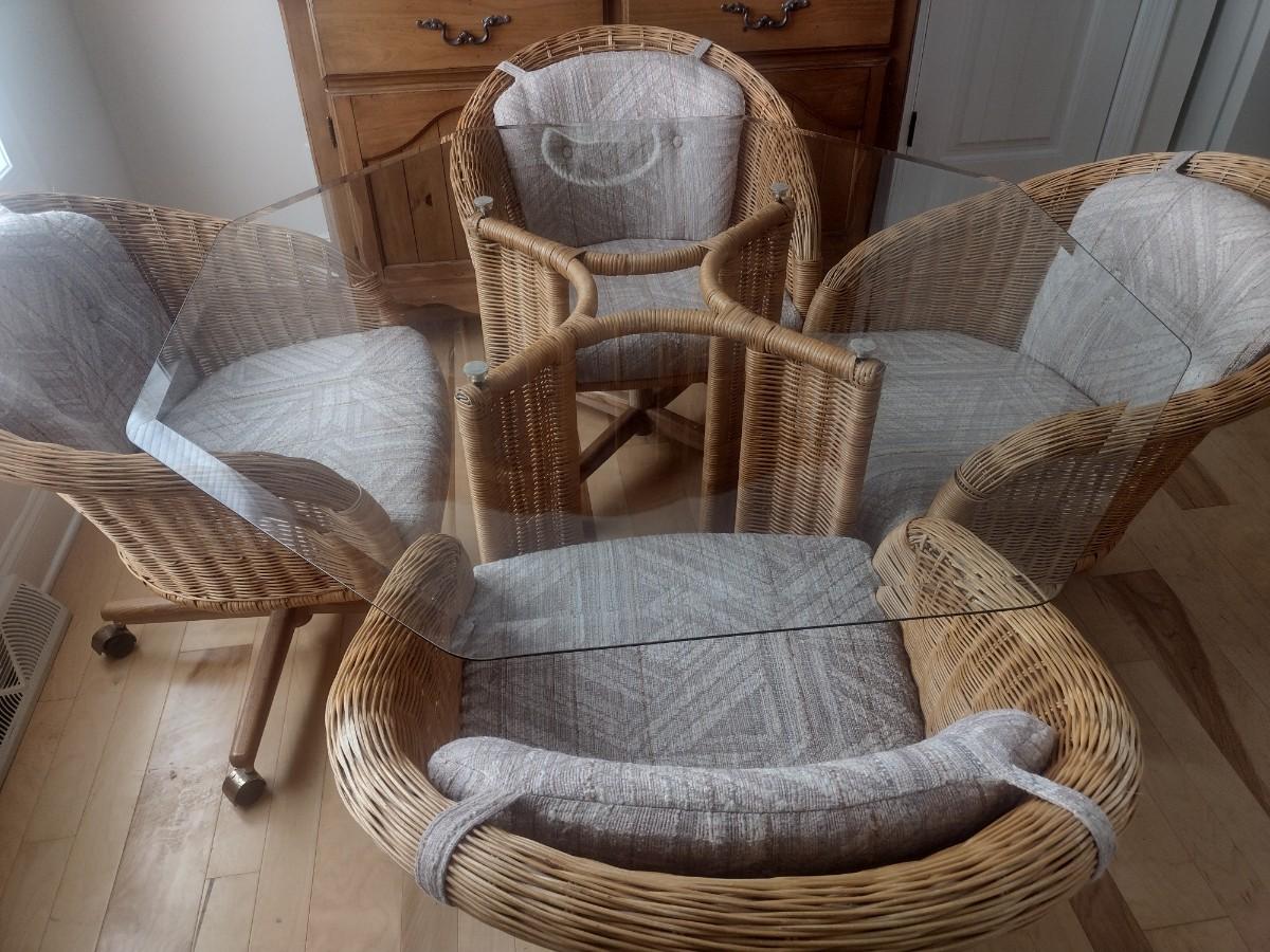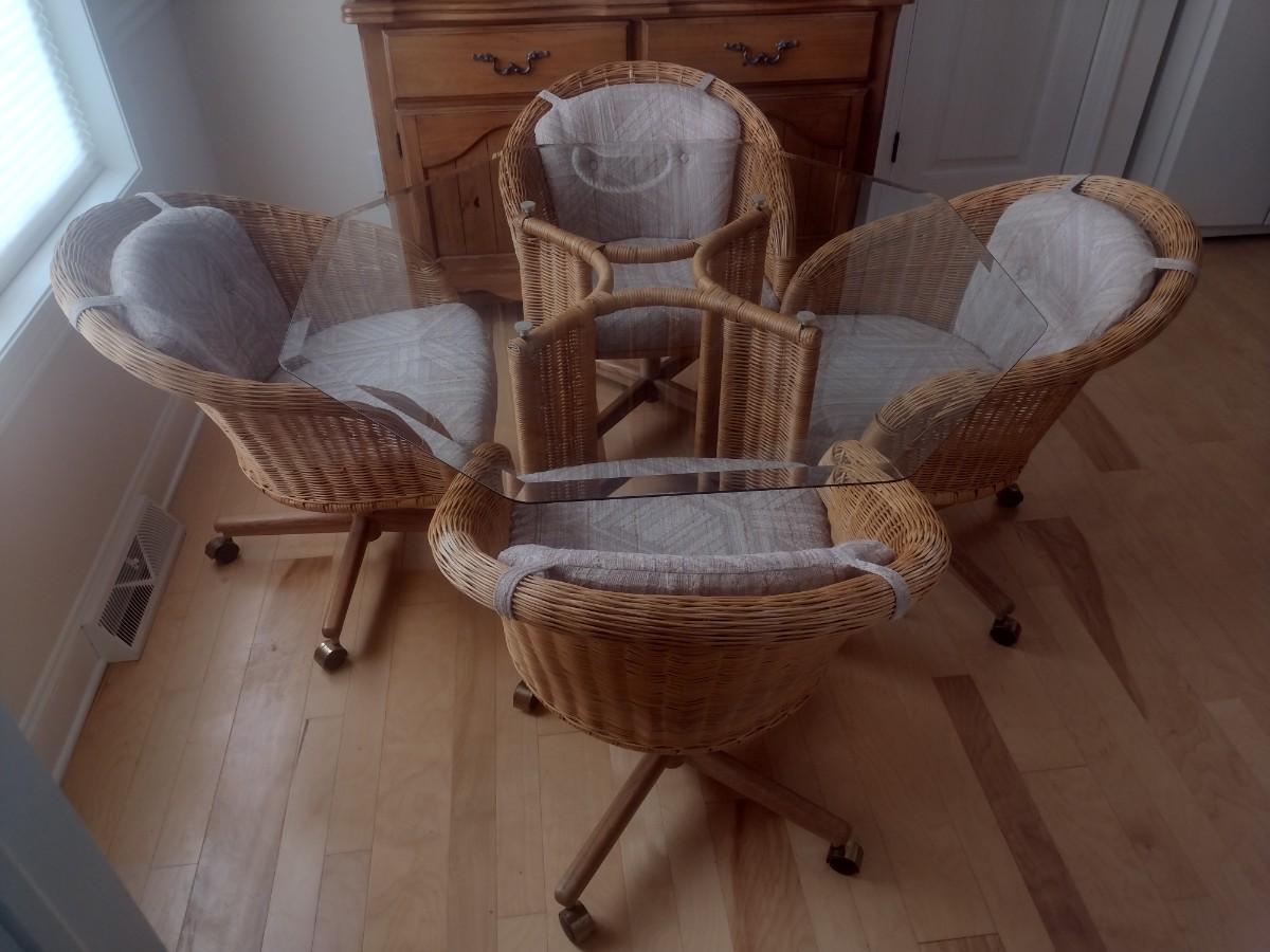 Contemporary Design Real Wicker Five-Piece Table and Chair Set Hexagonal Beveled Glass Table with Cushioned Swivel Chairs on Castors