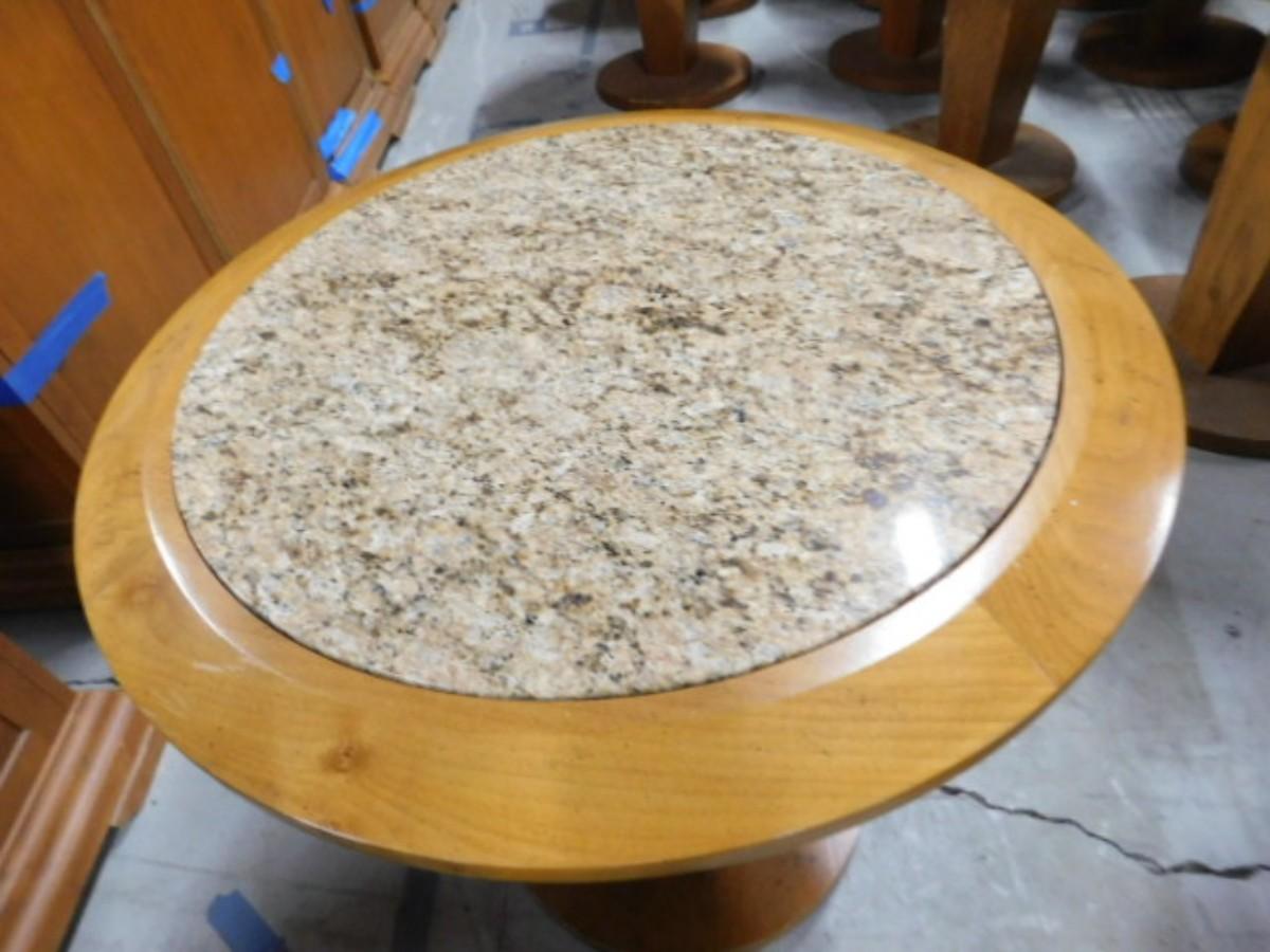 Contemporary Design Round Chair Height Pedestal Table Commercial Grade with Granite Insert Single Choice Expect some wear or scratches to the finish. Shipping option available via freight or local mover at Buyer's expense. Buyer must have all shipping scheduled within the stated dates and times of pickup. Recommended local mover is Beaty Bros. Moving 828-201-2982