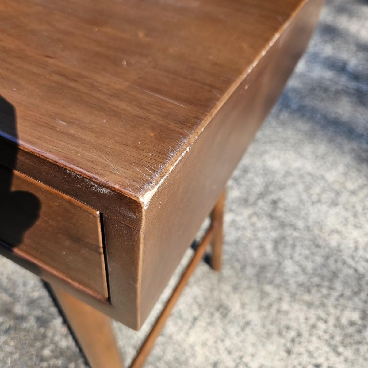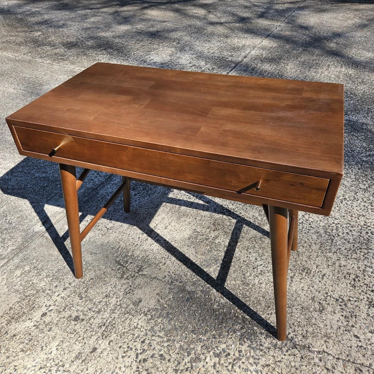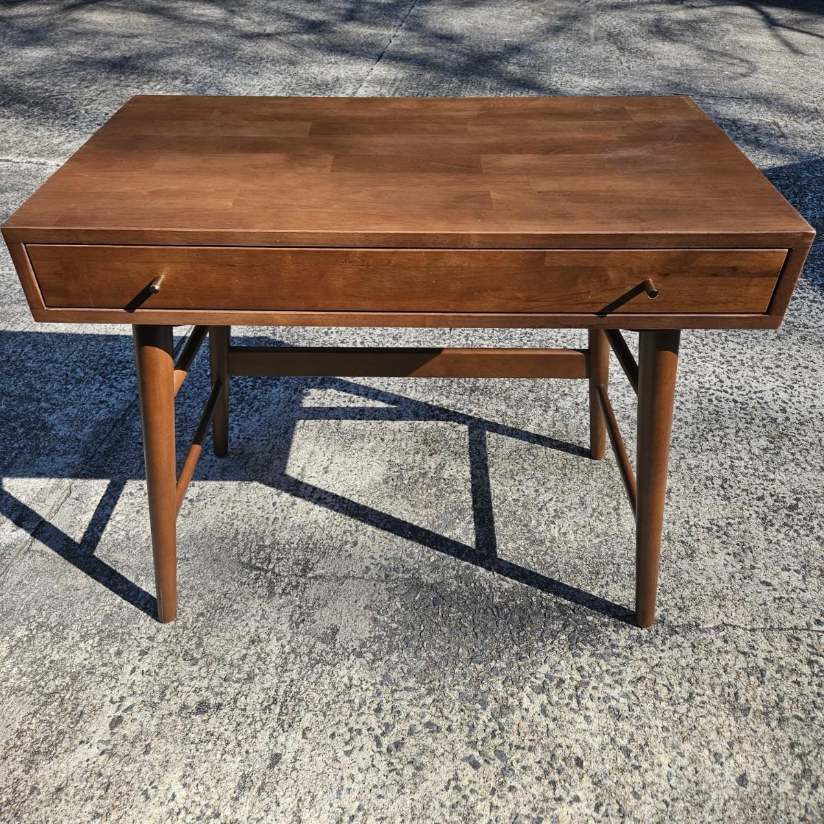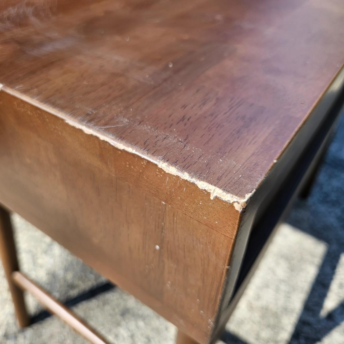 A contemporary desk that measures approximately 35.5" x 20.5" x 30"H. The desk is constructed of engineered wood with a faux wood veneer and has some scratches and minor damage. Local pickup only. Winning bidder must bring assistance to help move and load this item due to its weight and/or size.