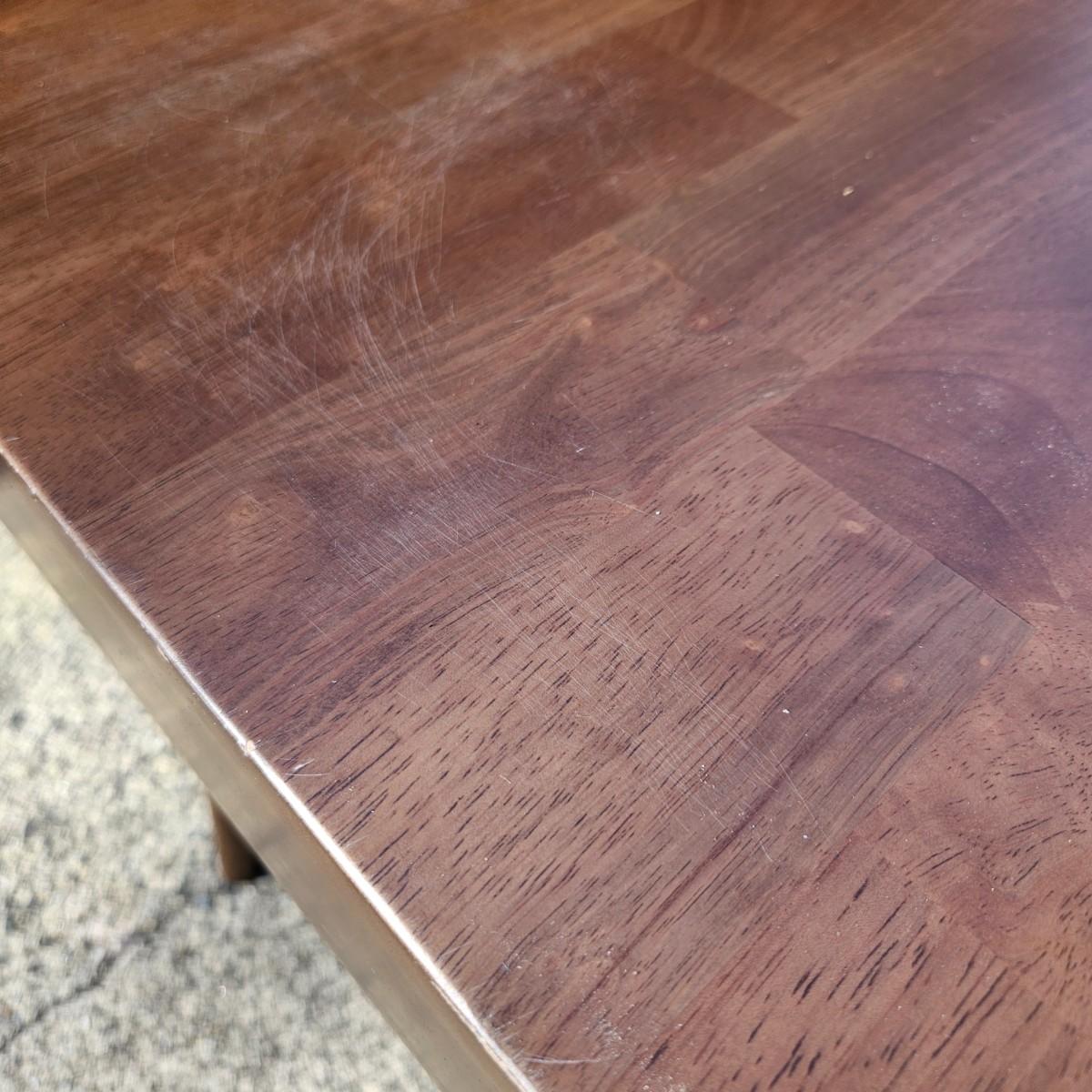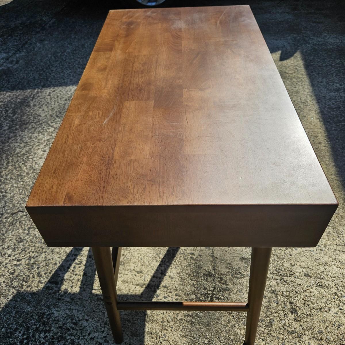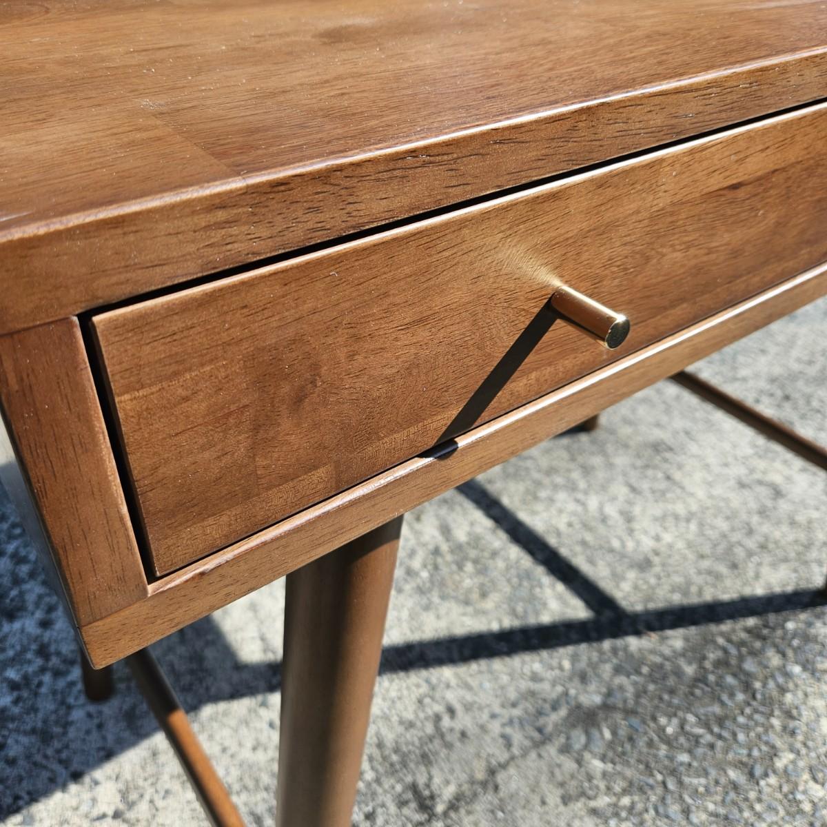 A contemporary desk that measures approximately 35.5" x 20.5" x 30"H. The desk is constructed of engineered wood with a faux wood veneer and has some scratches and minor damage. Local pickup only. Winning bidder must bring assistance to help move and load this item due to its weight and/or size.