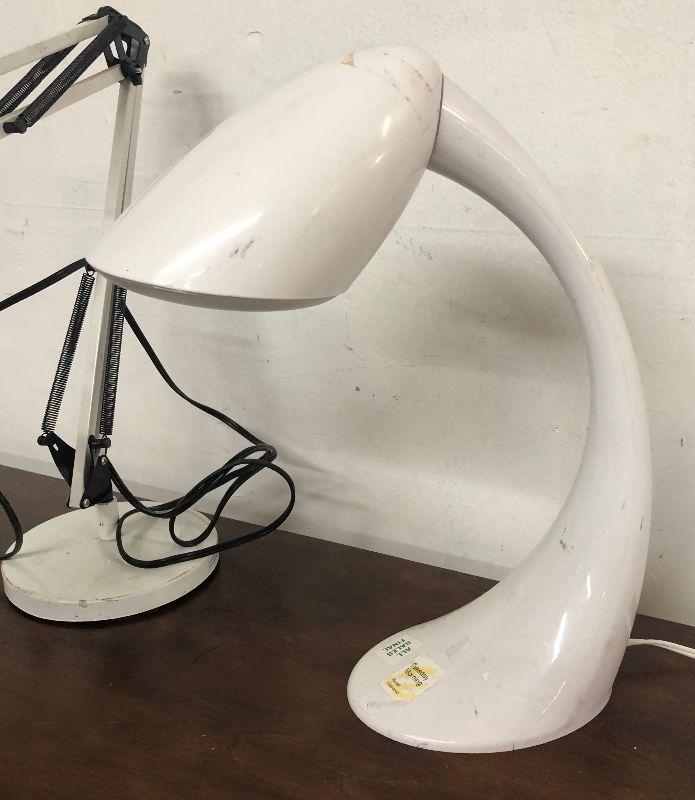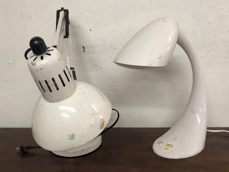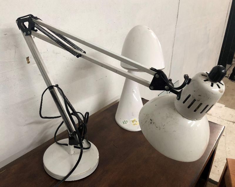 Here are a pair of modern desk lamps in white...drafting style..articulated arm...light normal wear...