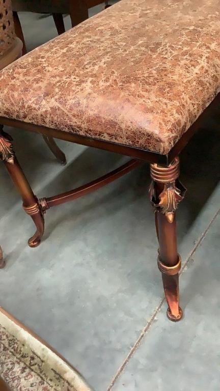 Entry bench 40 x 16 x 16 inches, metal frame in a copper finish, sueded topÂ…vinyl lift top chest/ stool, 20 x 15 inchesÂ…