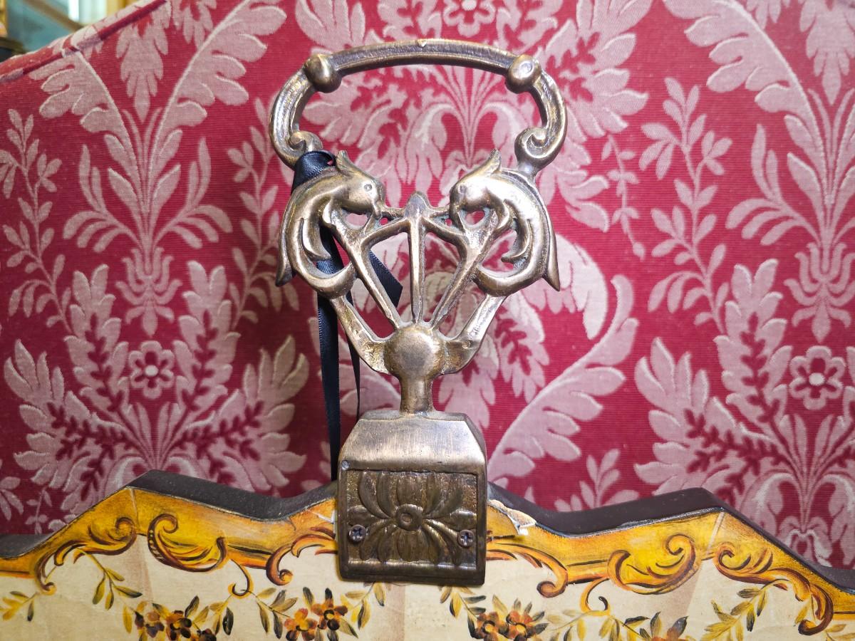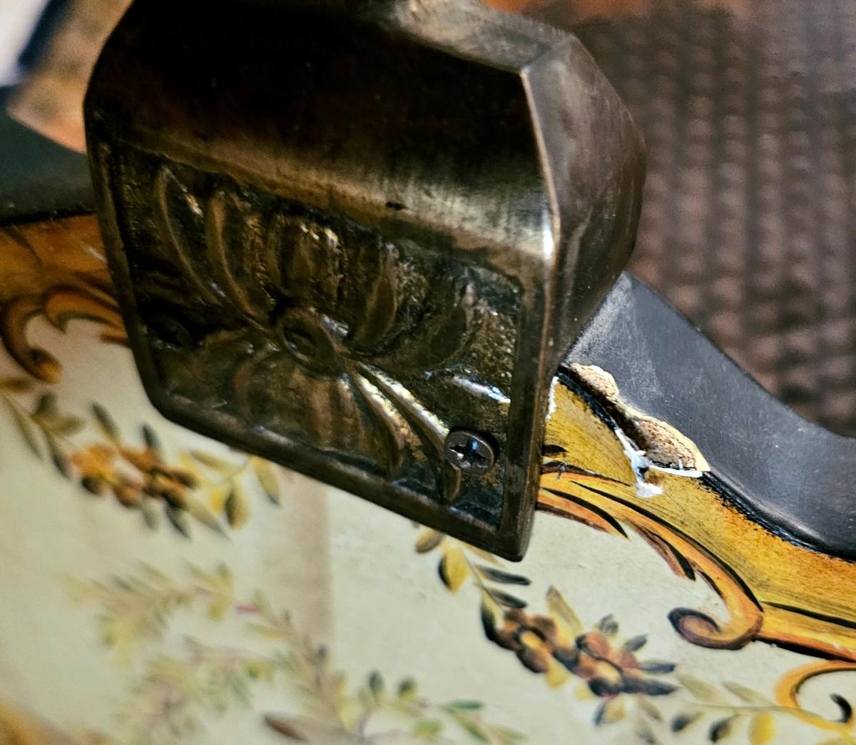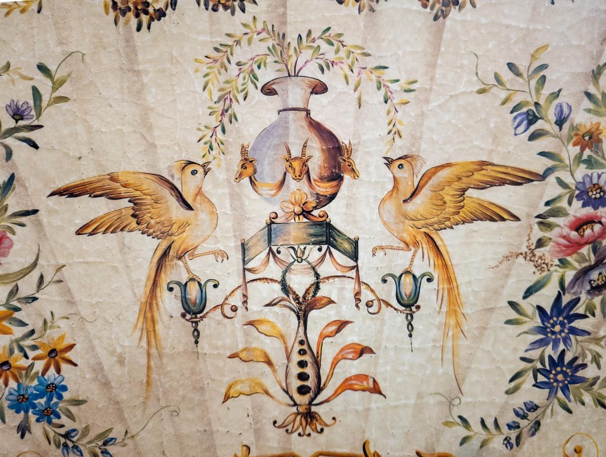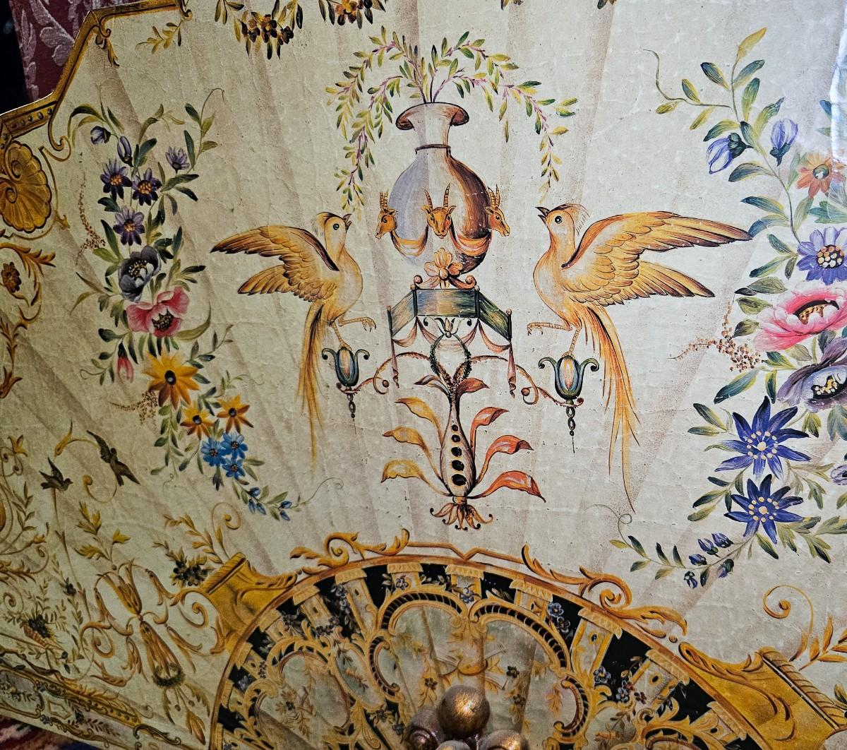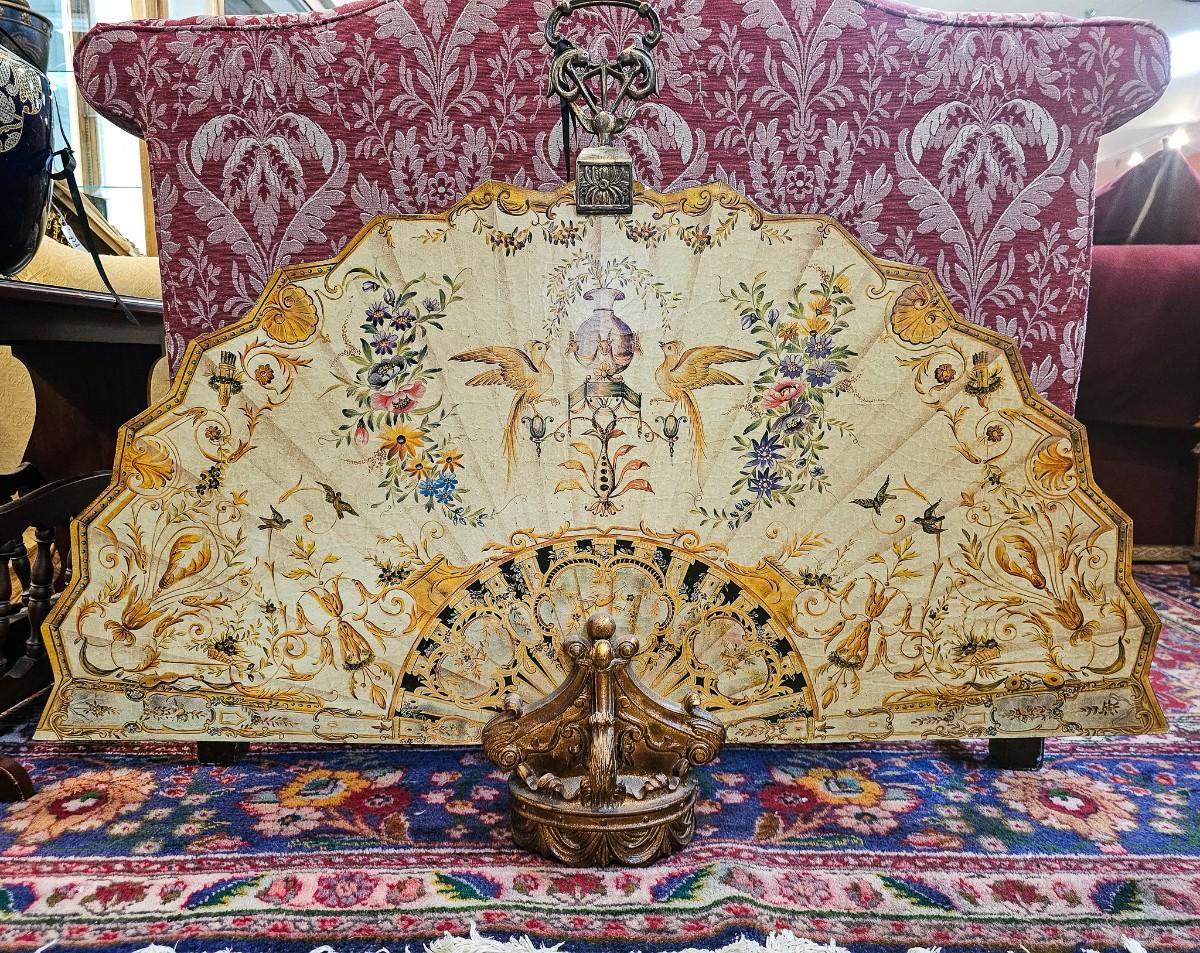 Handpainted fire screen in fan shape with bird motif, has a minor tear, see picture 42"W x 30"H
