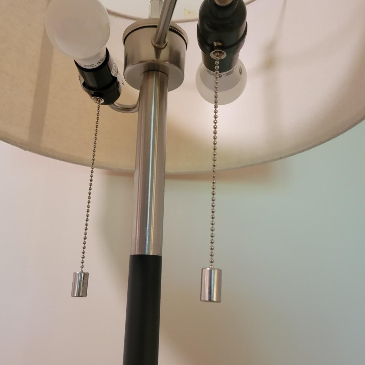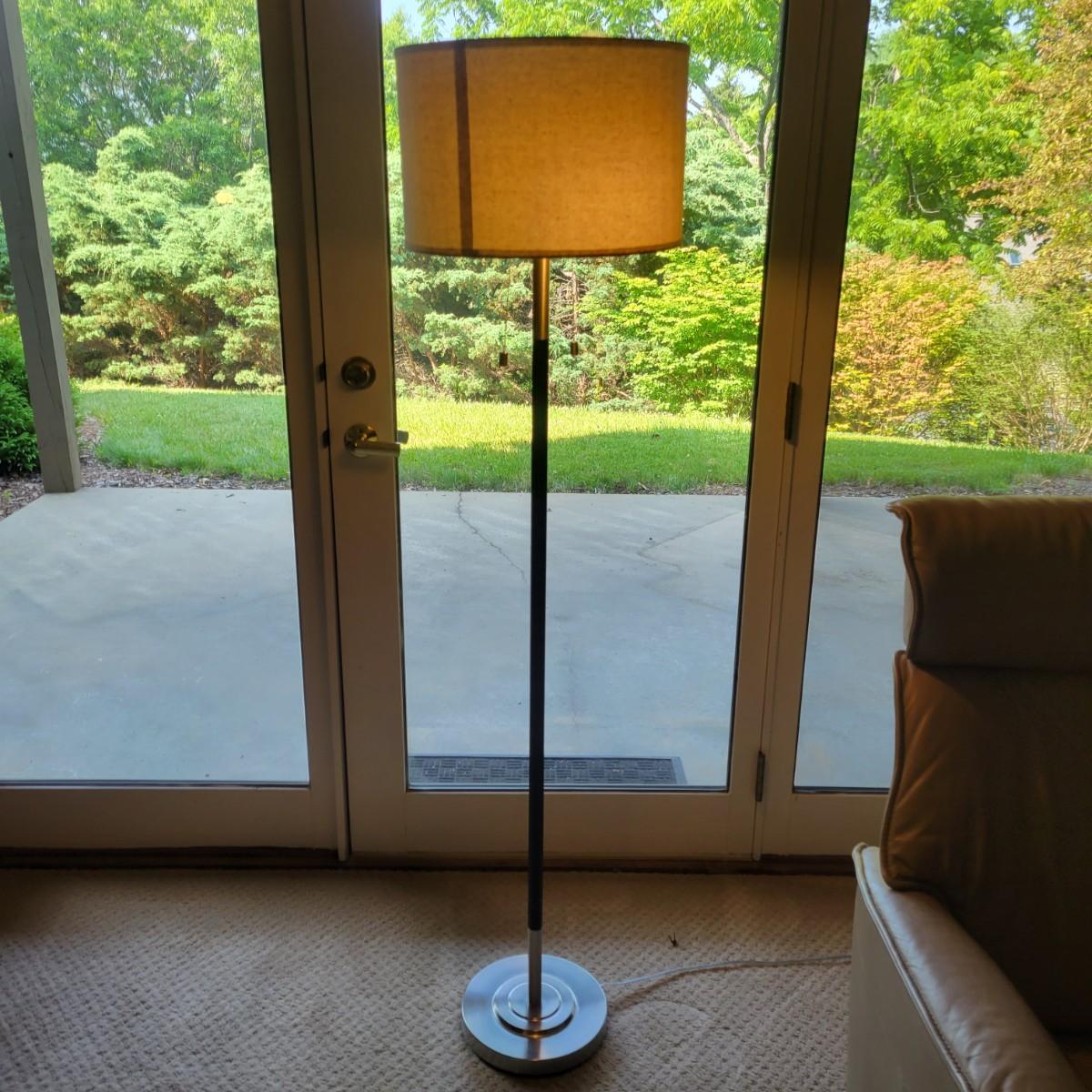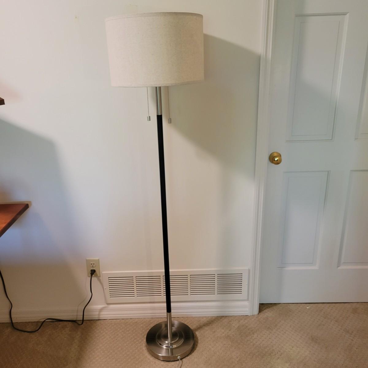 A contemporary floor lamp made of metal that powered on when plugged in. It has twin bulbs with two-way light chains. It has a brushed chrome base with a flat black body. The shade is a sandy linen color and the lamp measures approximately 15"D x 63"H. Local pickup only