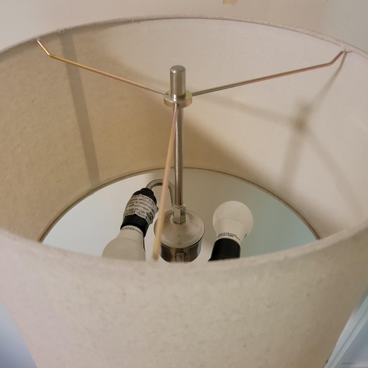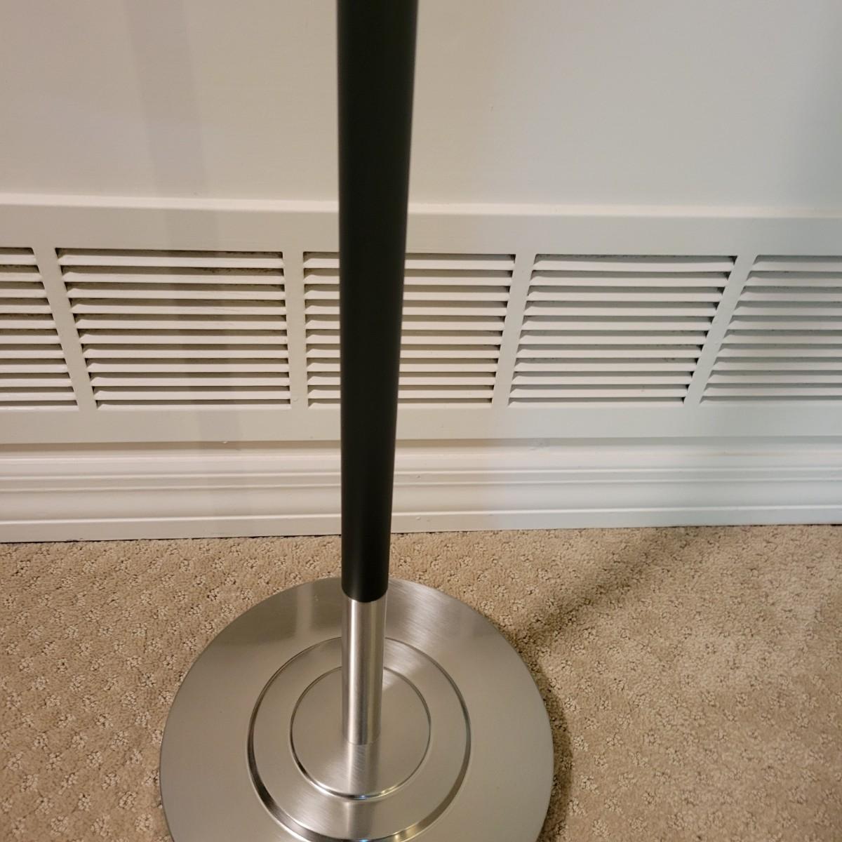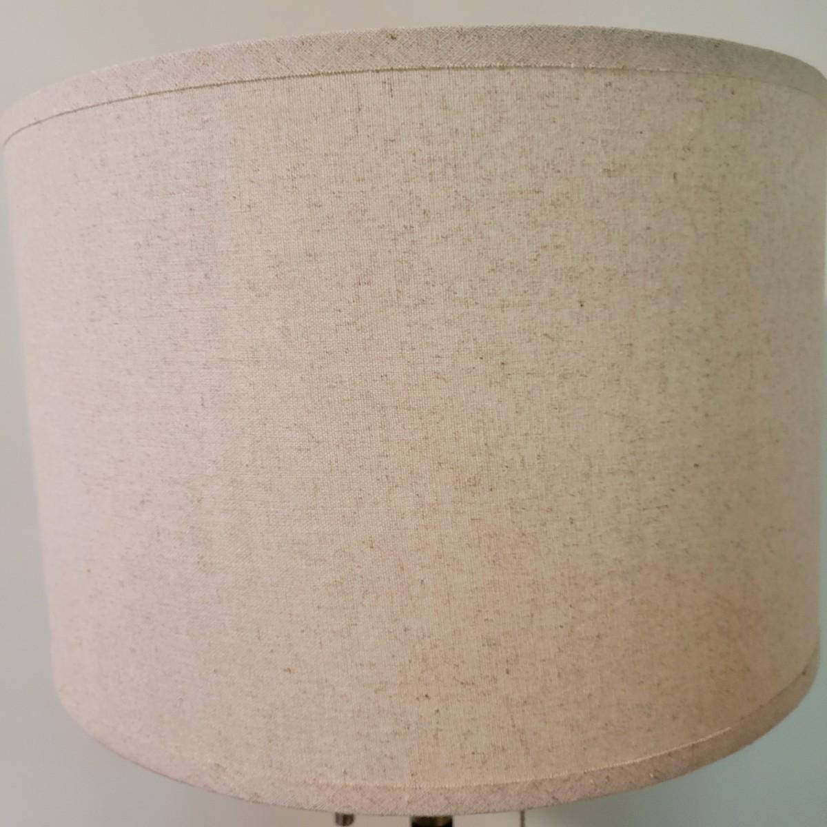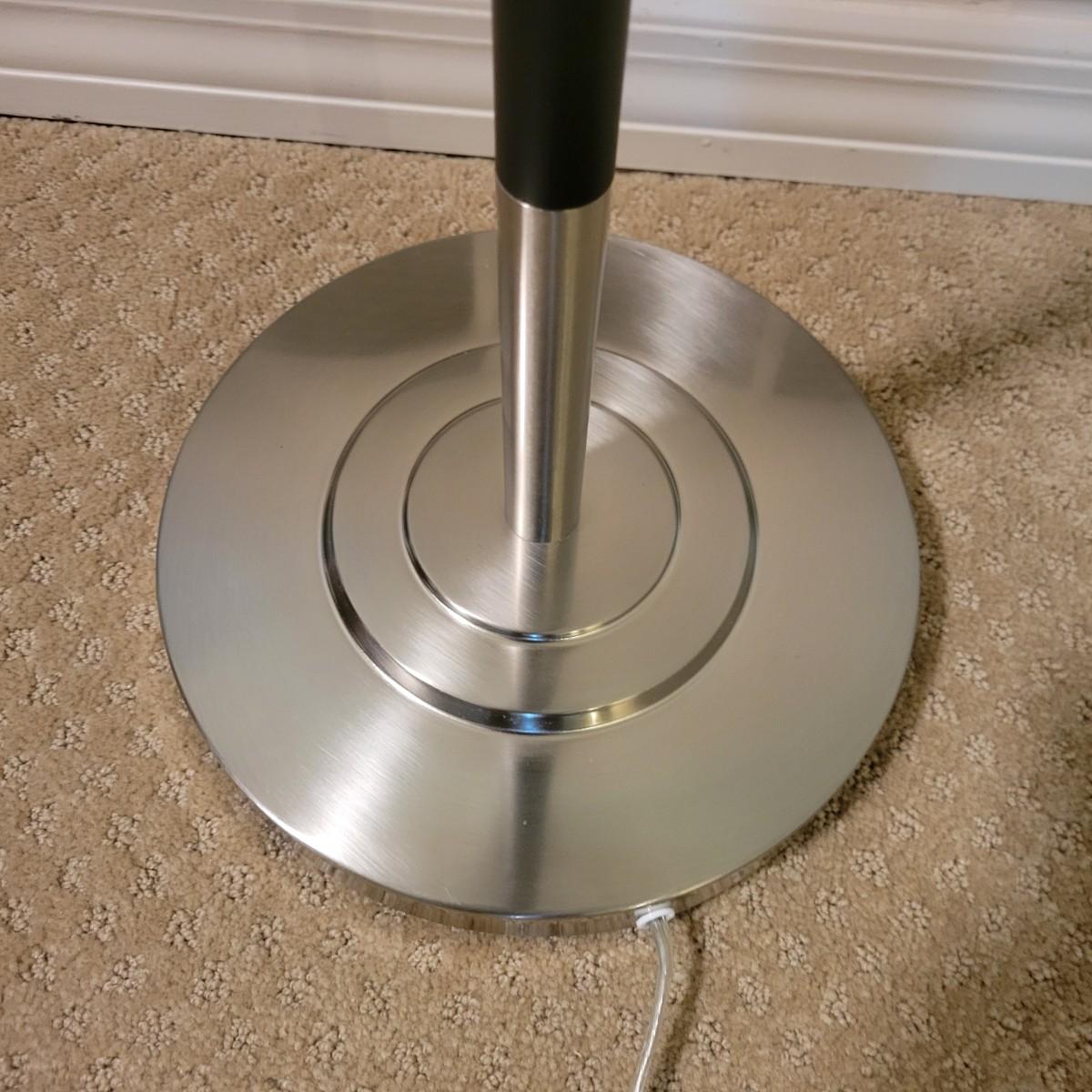A contemporary floor lamp made of metal that powered on when plugged in. It has twin bulbs with two-way light chains. It has a brushed chrome base with a flat black body. The shade is a sandy linen color and the lamp measures approximately 15"D x 63"H. Local pickup only