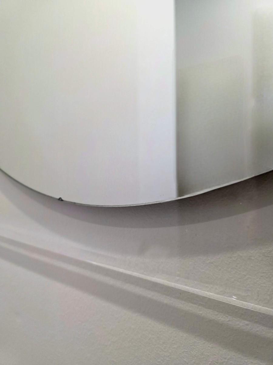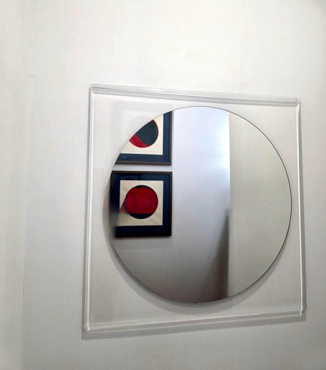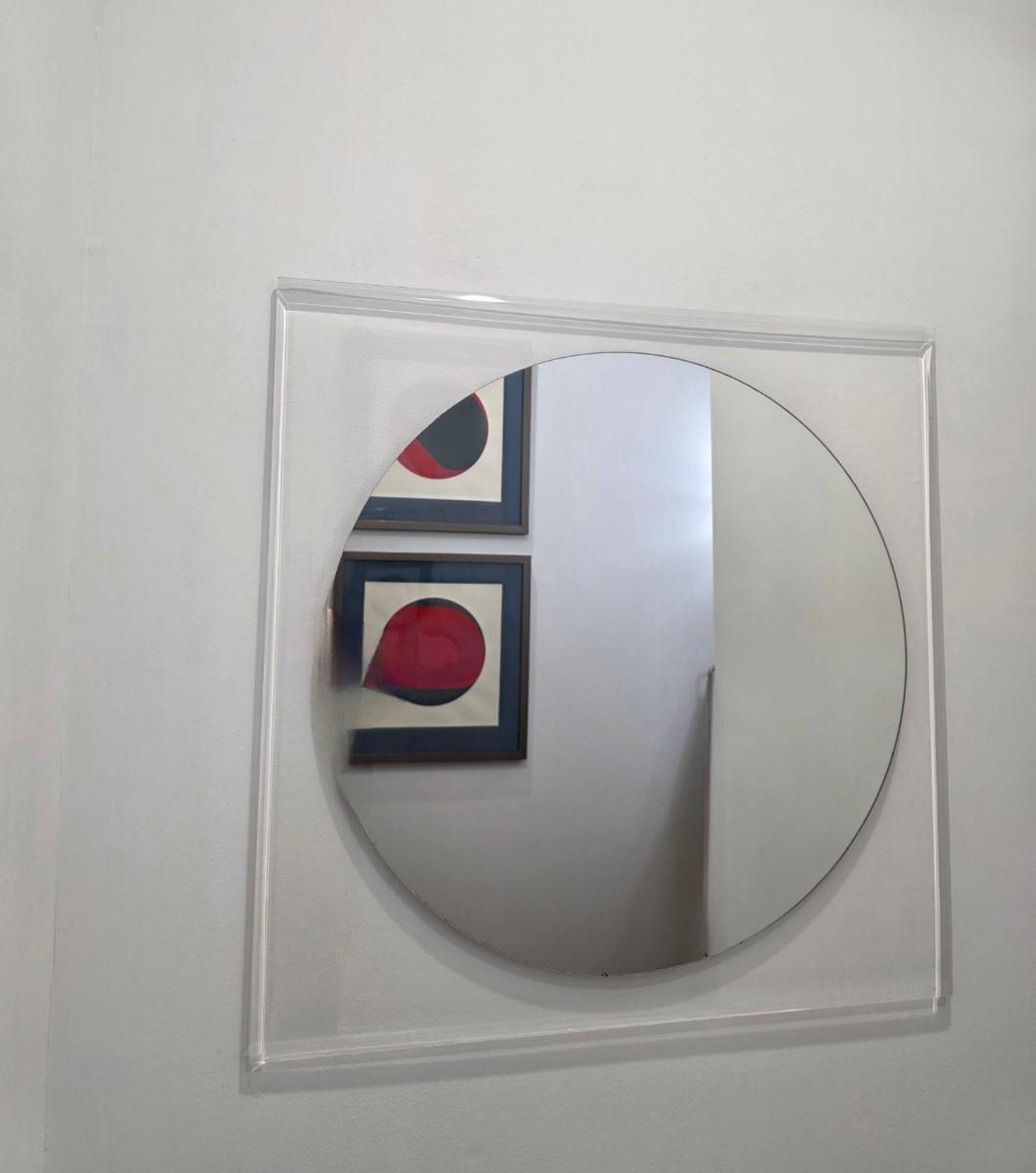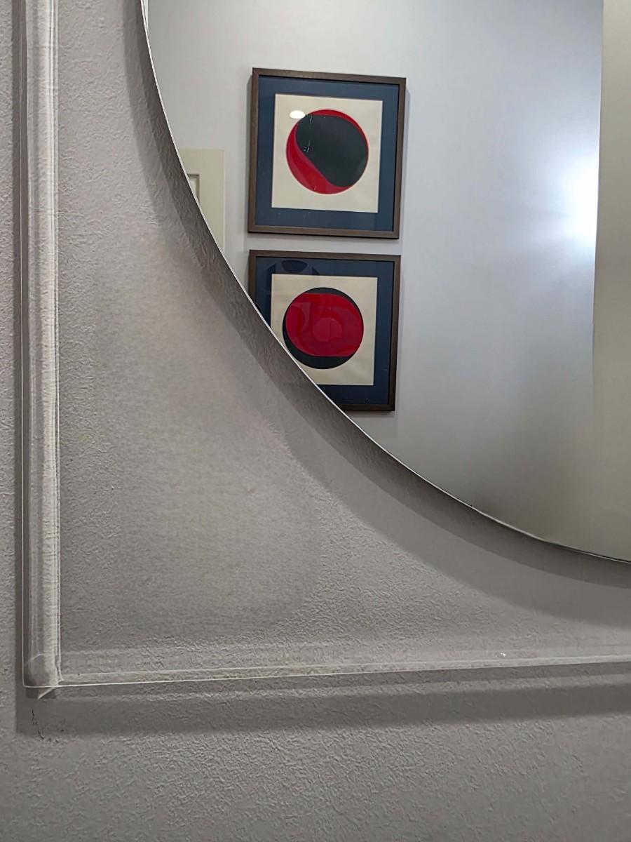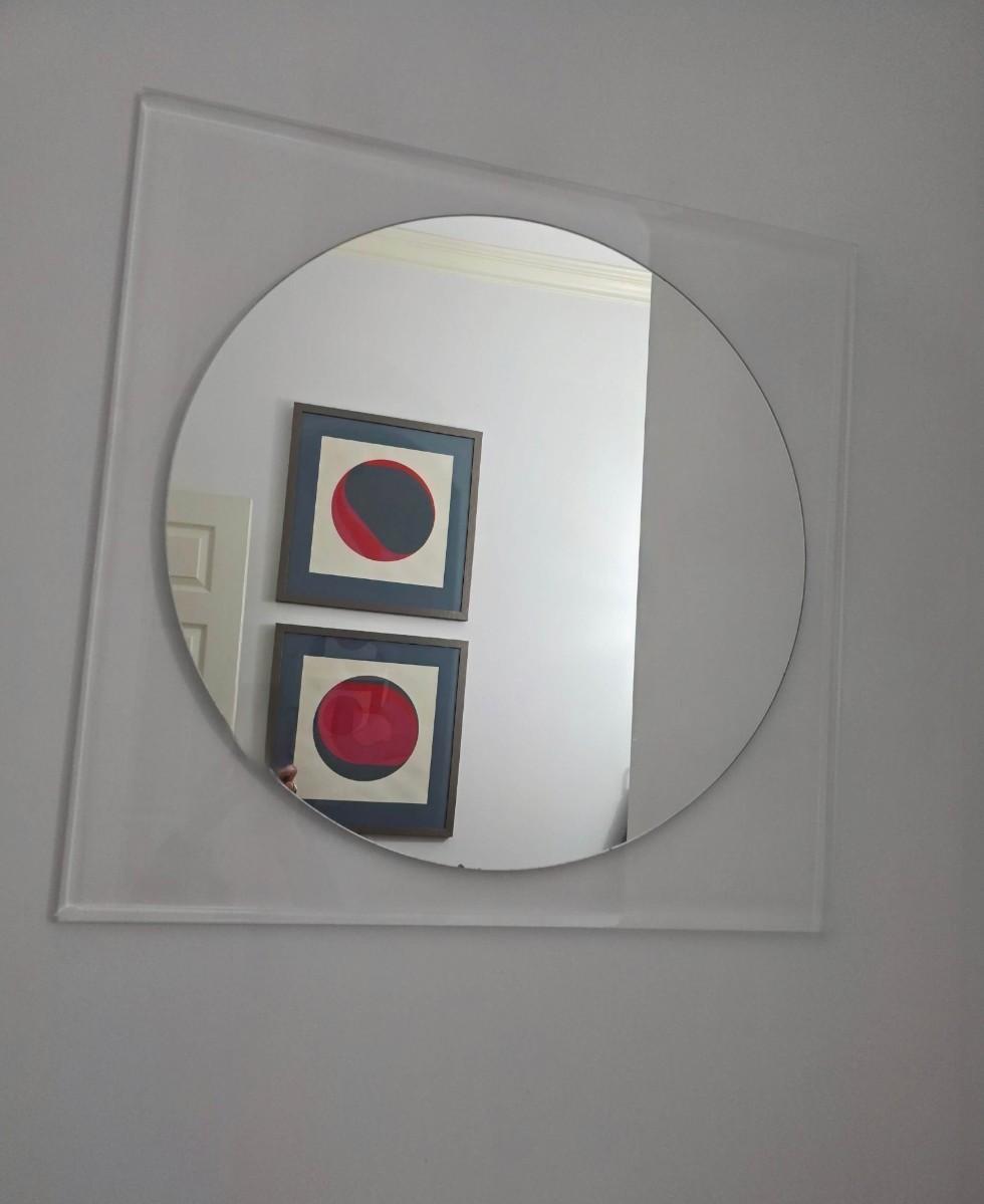 This contemporary geometric acrylic mirror will add fun to any space. There are a few blemish spots on the bottom edge of the mirror, please zoom in on pictures to inspect closer. I wouldn't say they are highly noticeable but want to make you aware. The square frame surrounding the circular mirror measures 28" x 28". You are bidding on the mirror only. The red, white and black art is NOT included,