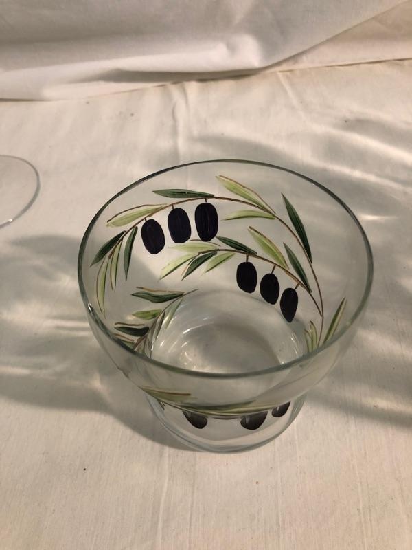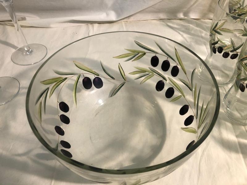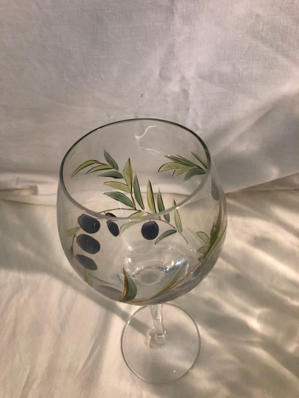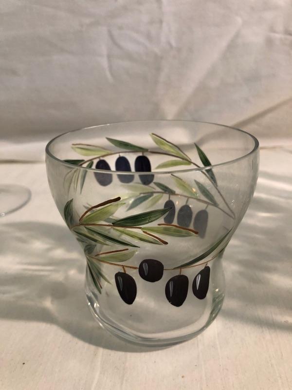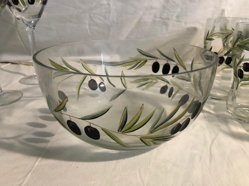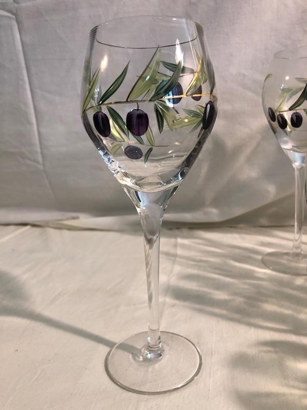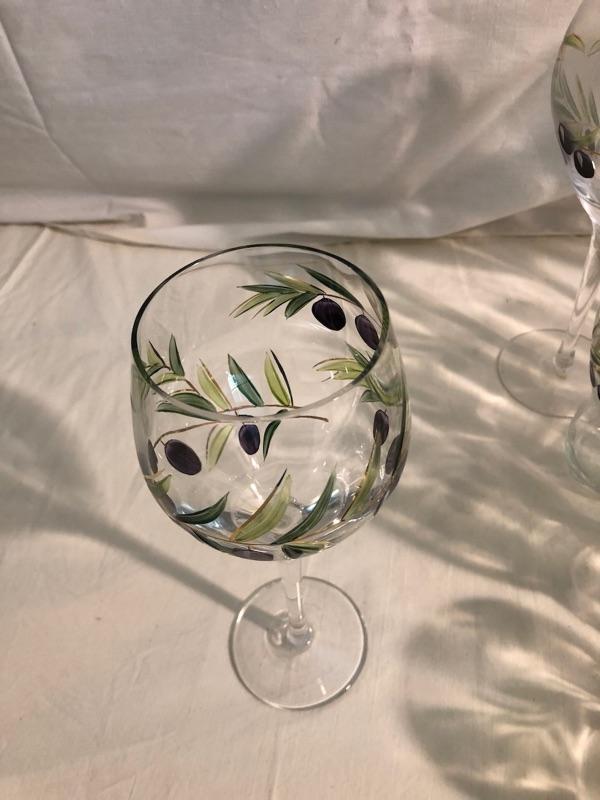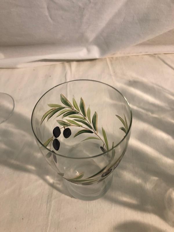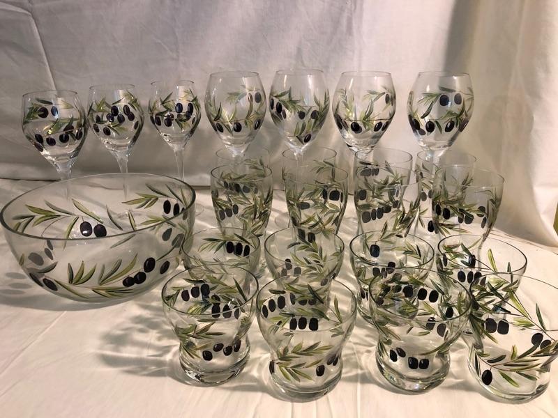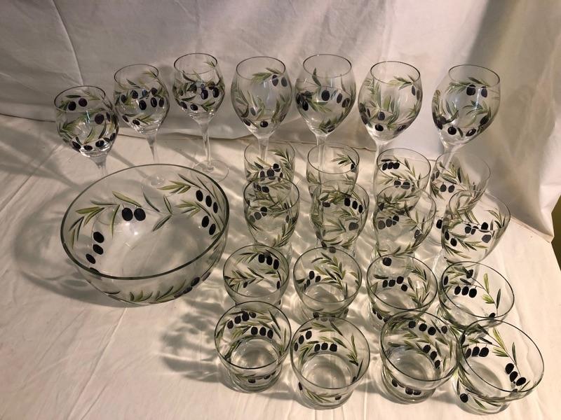 Set of 8 highballs and set of 8 cocktail glasses along with set of 4 large red stemware and set of 3 white stemware The set is etched glass that has been hand painted in an olive design. Red wine glasses are 10in tall x 3in diameter, white wine glass is 9in tall x 2.75 diameter, highball glasses are 6in tall x 3in diameter, and cocktails are 4in tall x 3.5in diameter, the bowl is 9in diameter x 4.75in rim