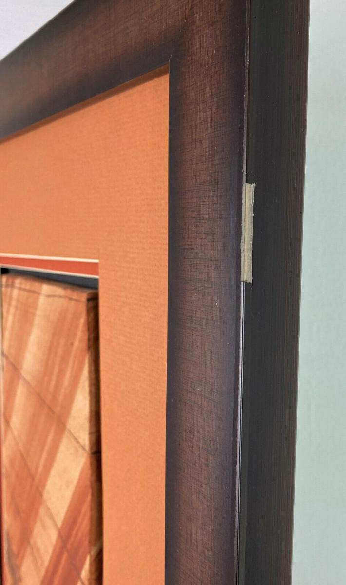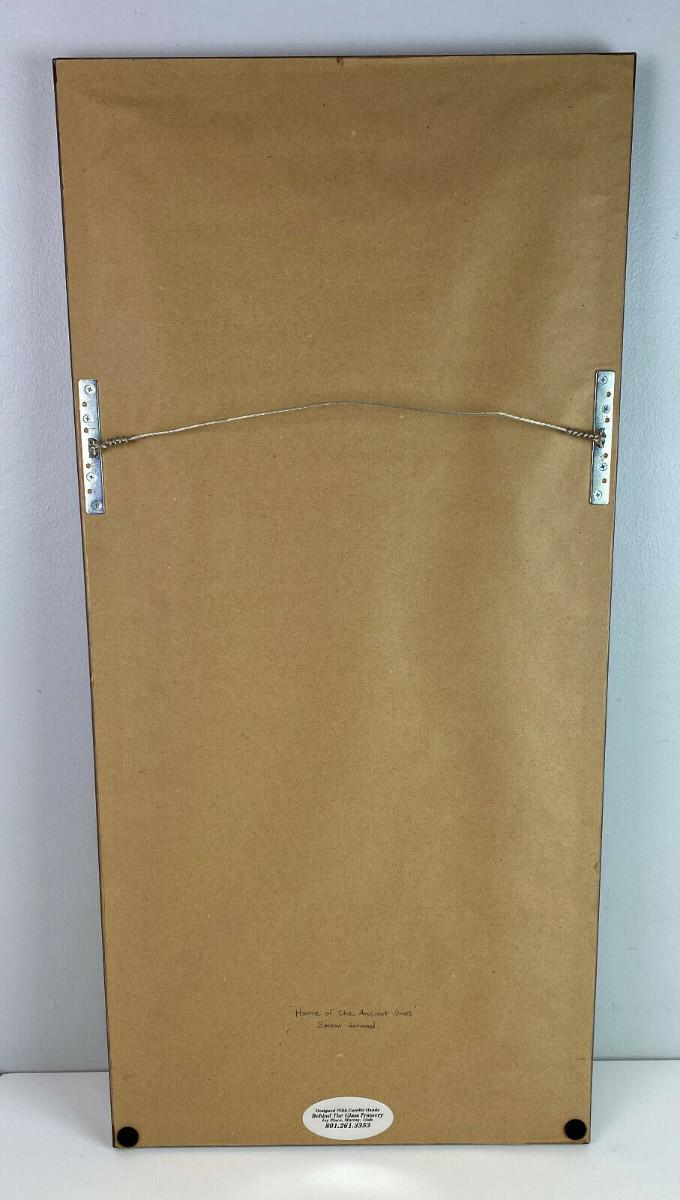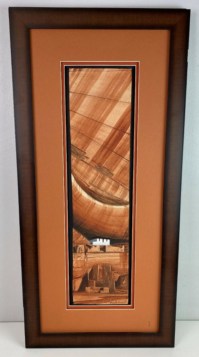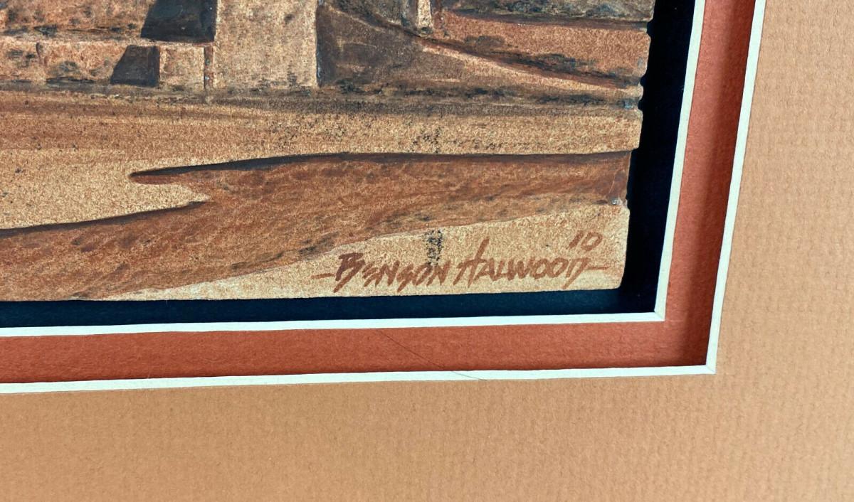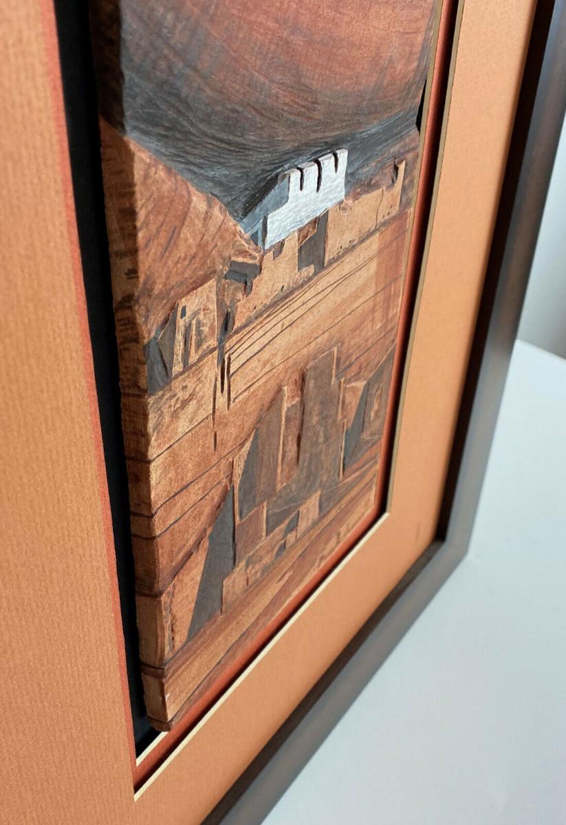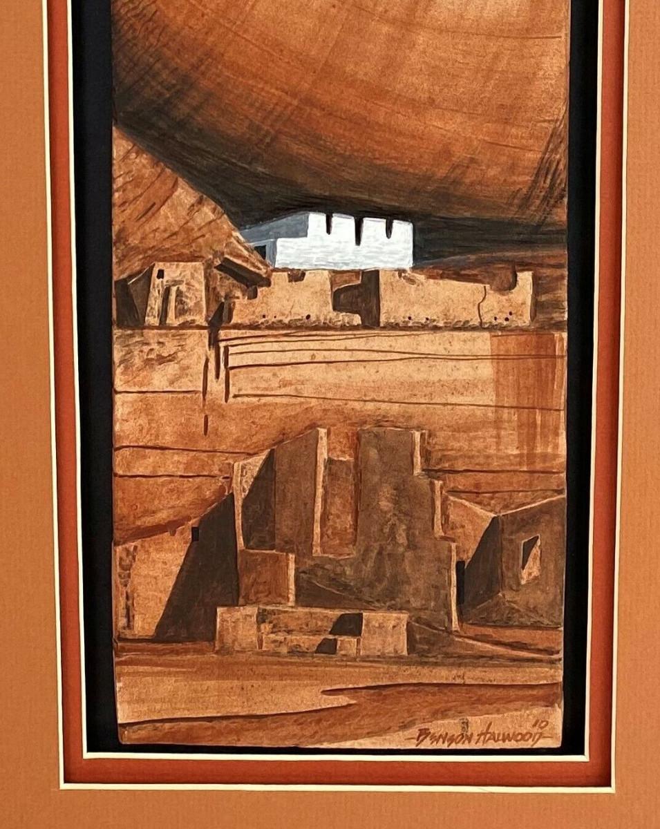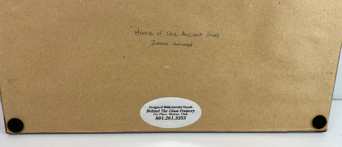 In excellent condition this piece of contemporary Navajo Art signed abd dated in 2010 by Benson Halwood self taught Native artisan who works mostly in watercolor I believe...this tile art is in relief..."HOME OF THE ANCIENTS"...Nicely matted and framed...30.5 x 14.5"...Image 22.25 x 6.5"...the nly small detractors are a couple of edge rubs on the wooden frame..loss of finish...as shown.