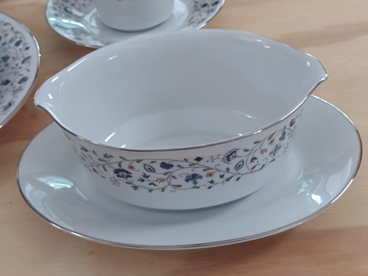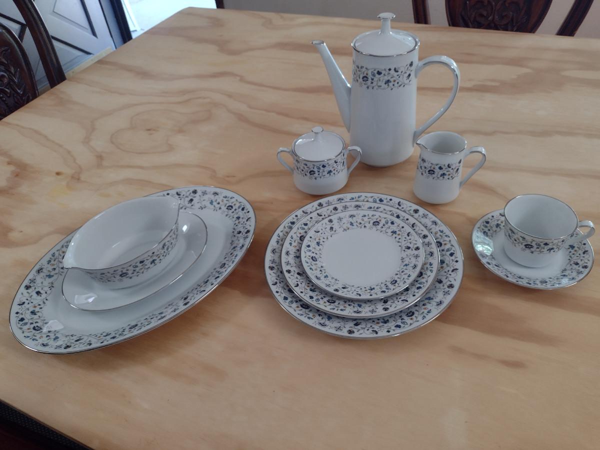 Contemporary Noritake 'Floris' Dinnerware- Approx 49 Pieces. Includes eight of each: dinner plate, salad plate, bread plate, cup and saucer. Also, four additional dinner plates, coffee pot, creamer, sugar, gravy with under plate, and oval platter (14"). Items are in good used condition. While chips or cracks are a possibility, none were noticed during picture taking.