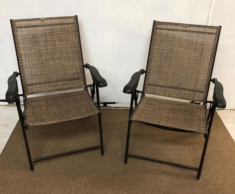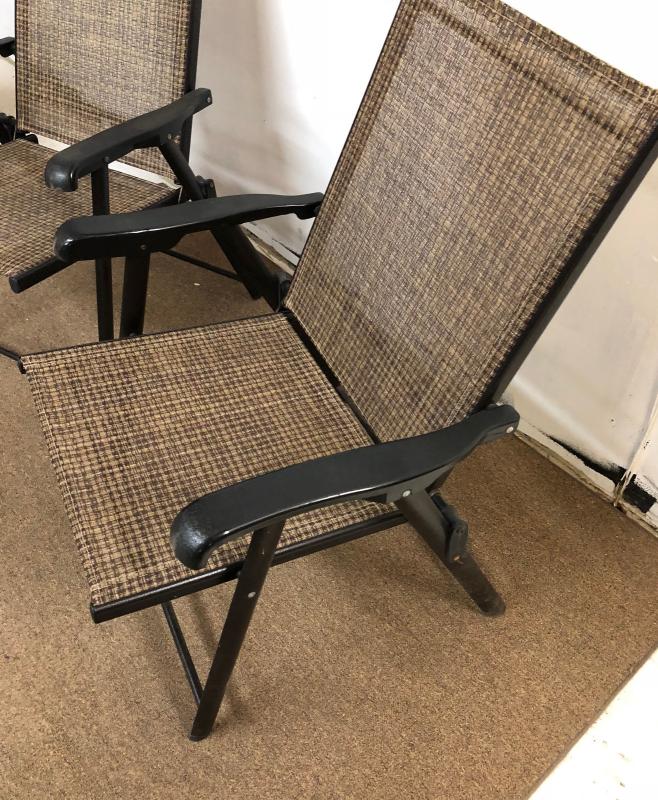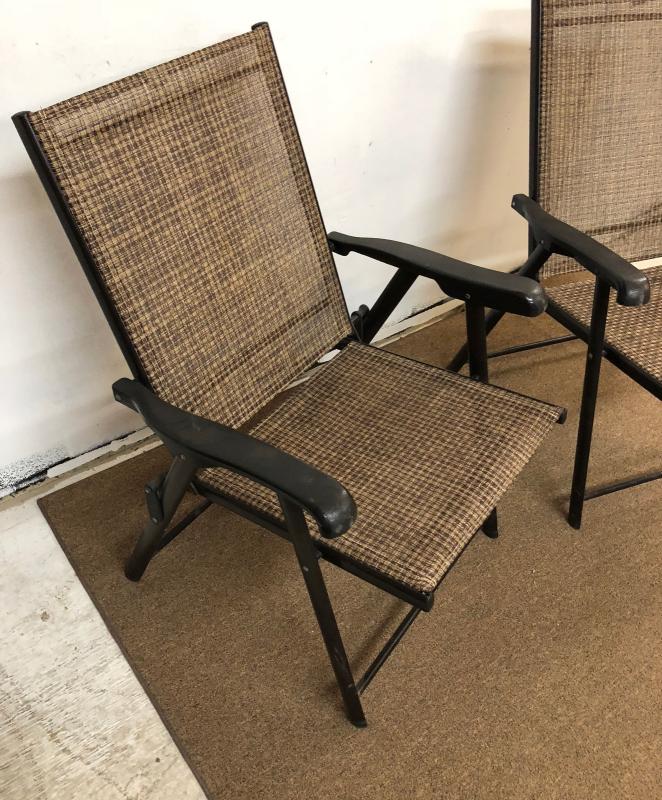 Excellent condition on this pair of woven material folding patio arm chairs...