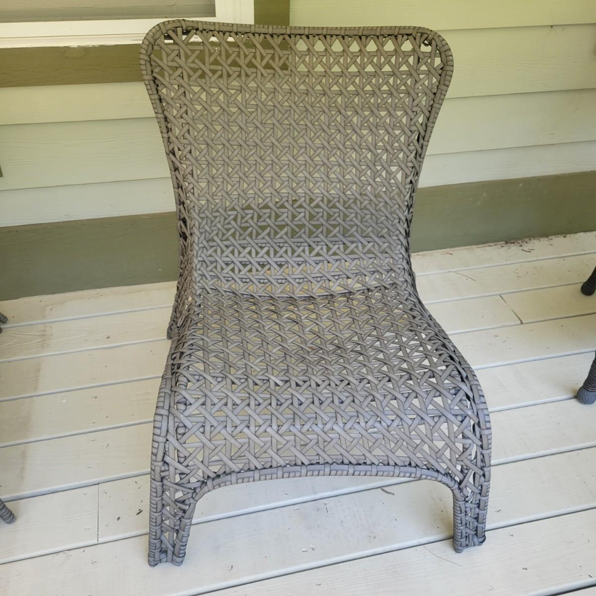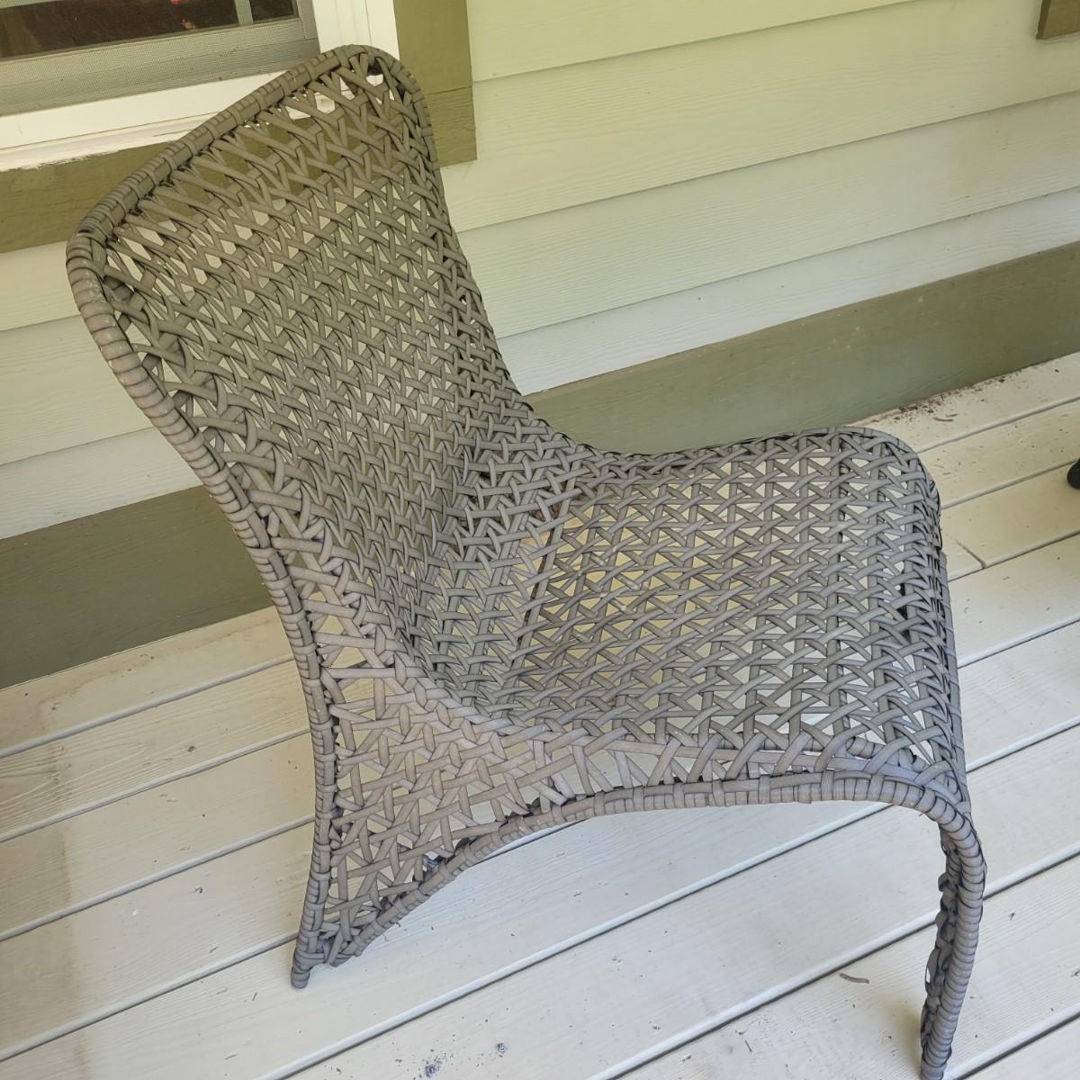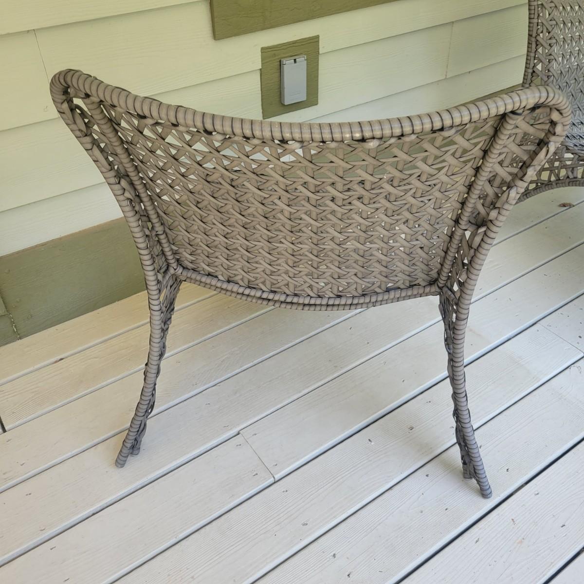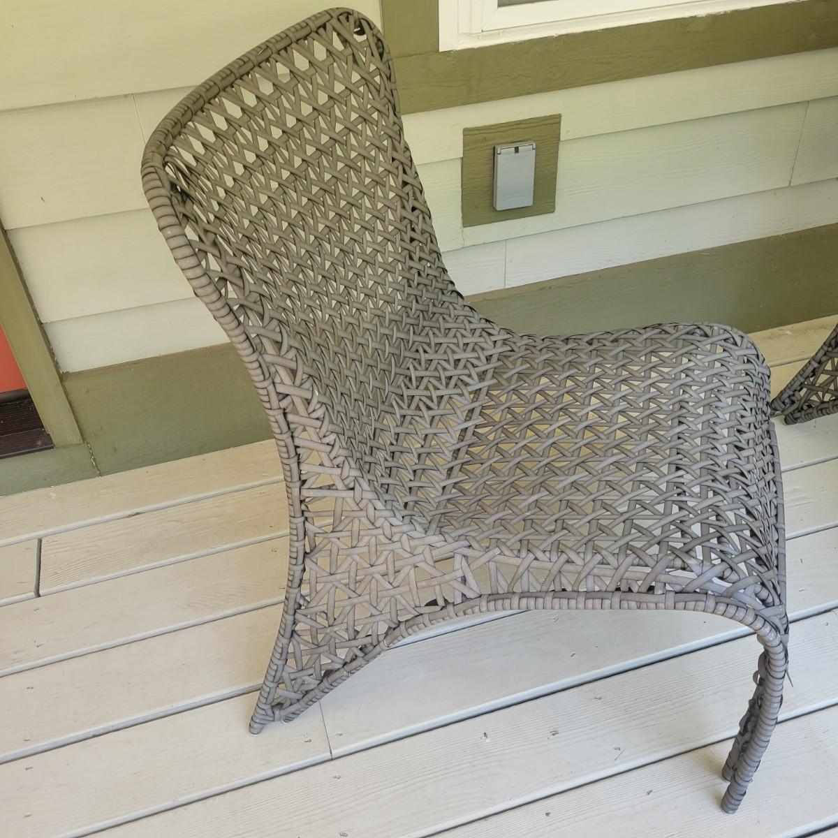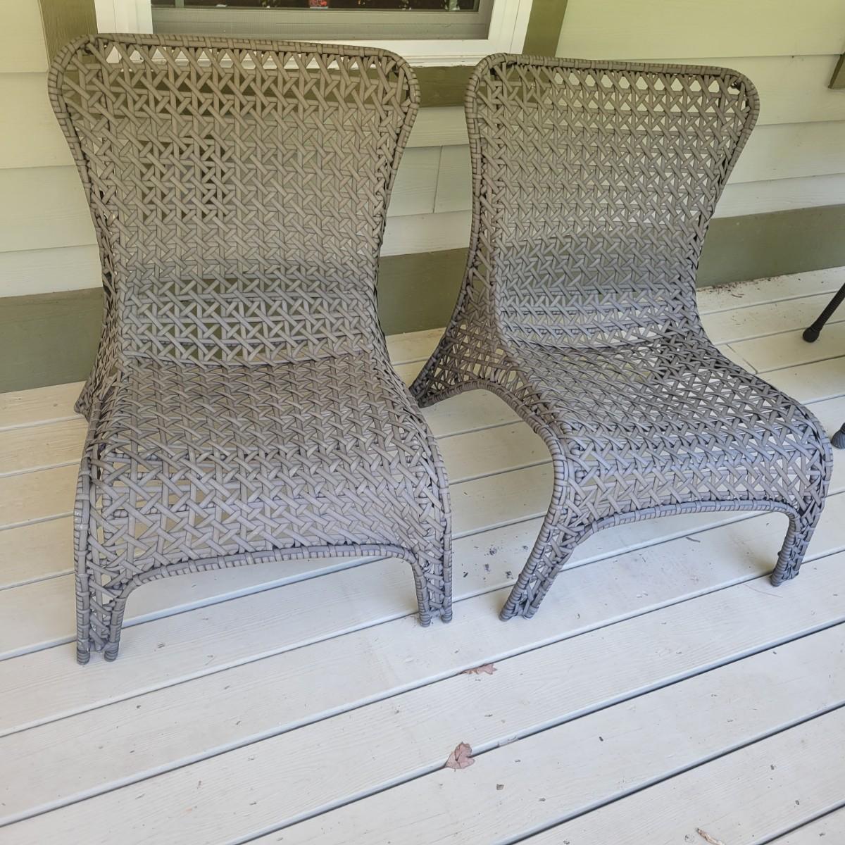 A pair of faux rattan chairs with a contemporary weave. These chairs measure approximately