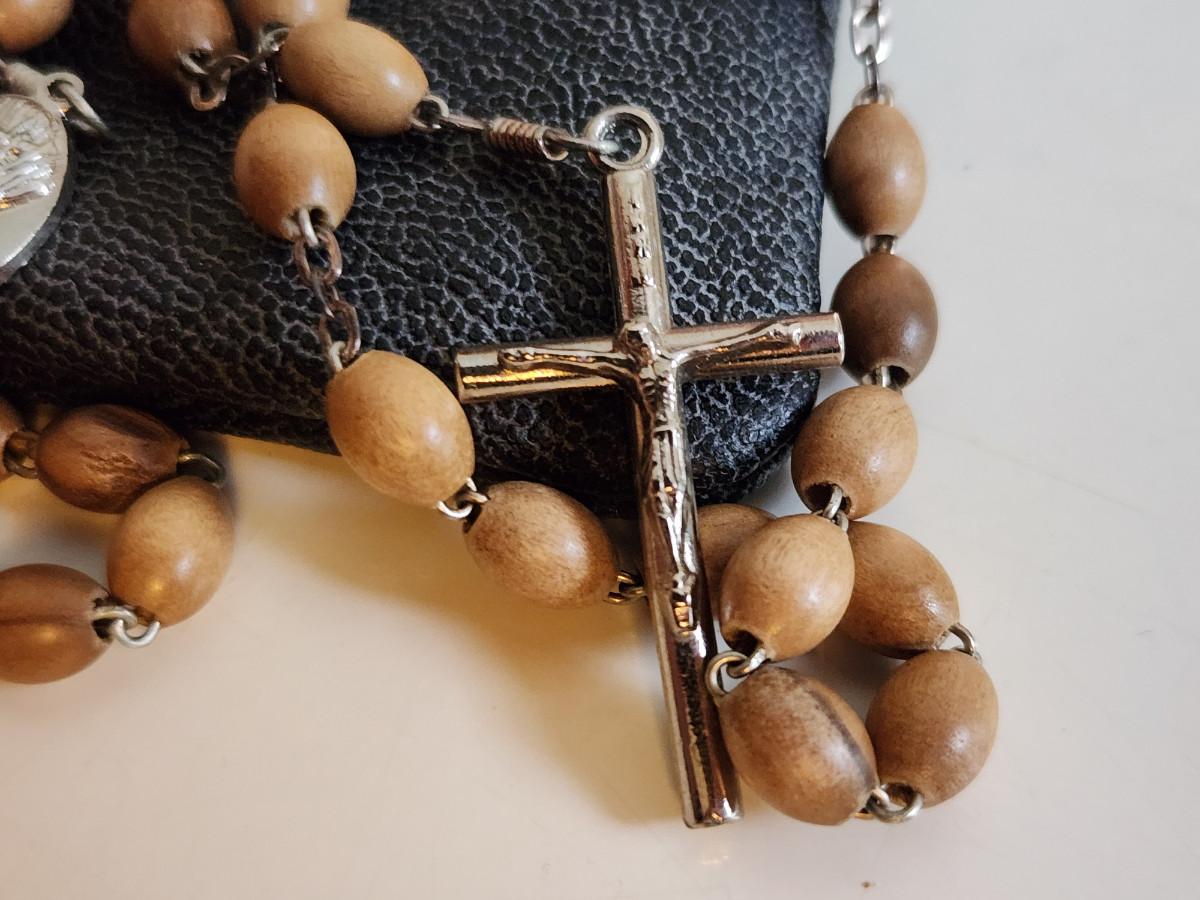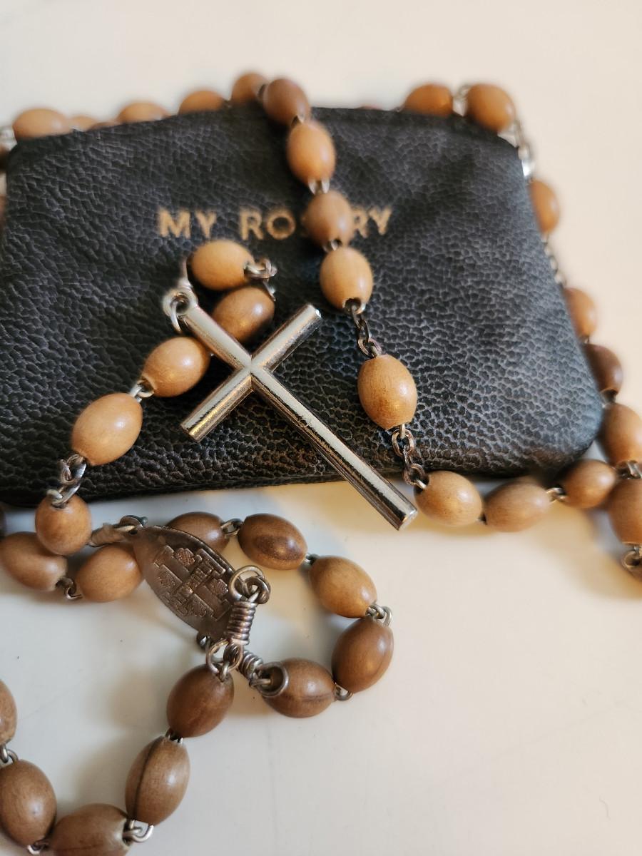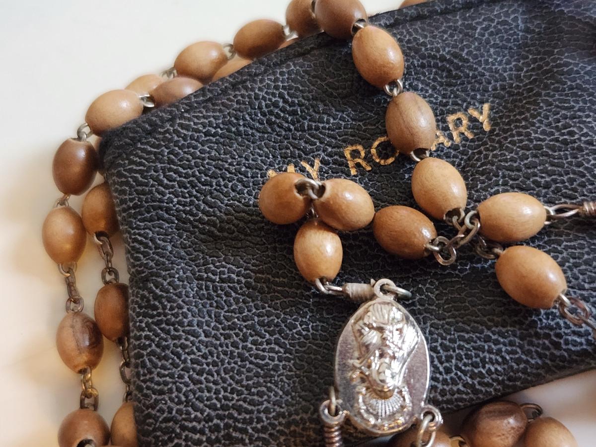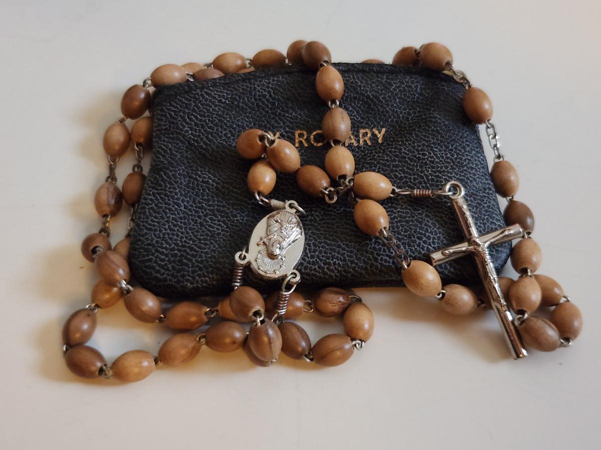 This auction lot is for a Contemporary Rosary which comes in a Leather Case, This rosary was made in Jerusalem as noted on the medal and most probably purchased as a religious souvenir by a tourist visiting the Holy Land. The case is marked French Leather. A wonderful rosary for most any adult.