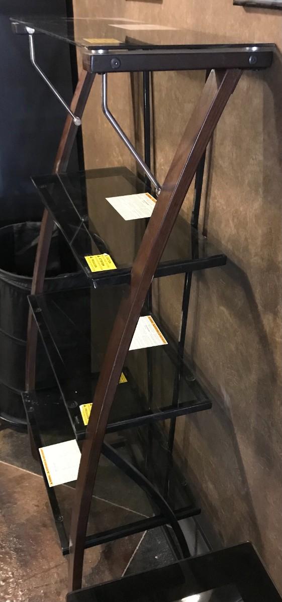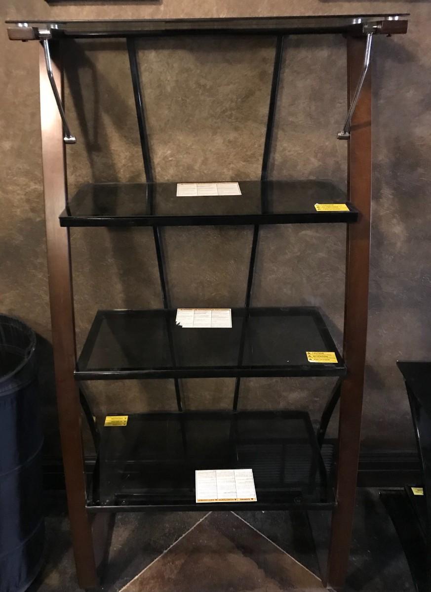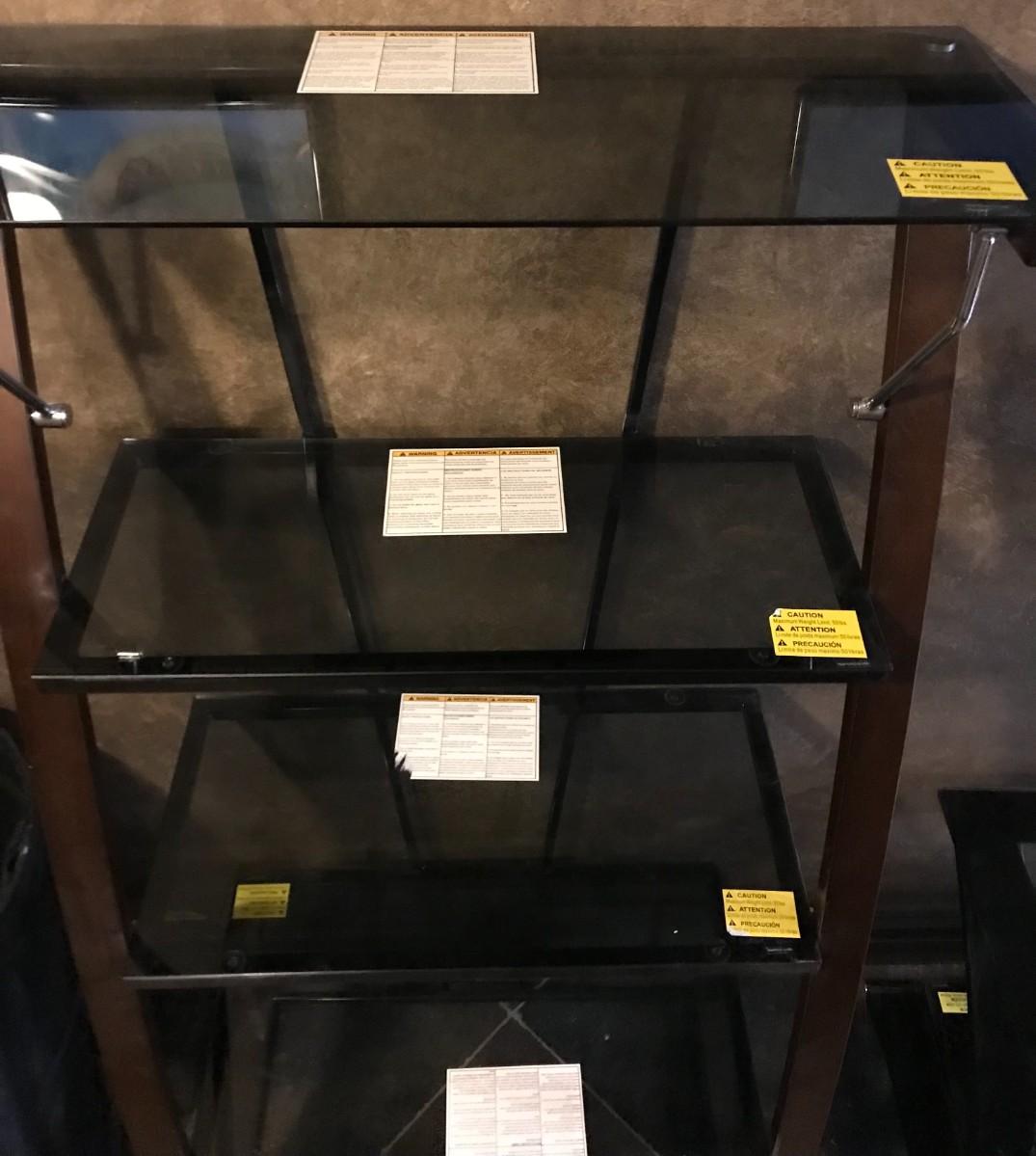 4 shelves for media, electronics, books, whatnot. Still has original packaging stickers on the shelves