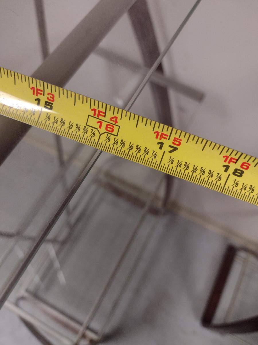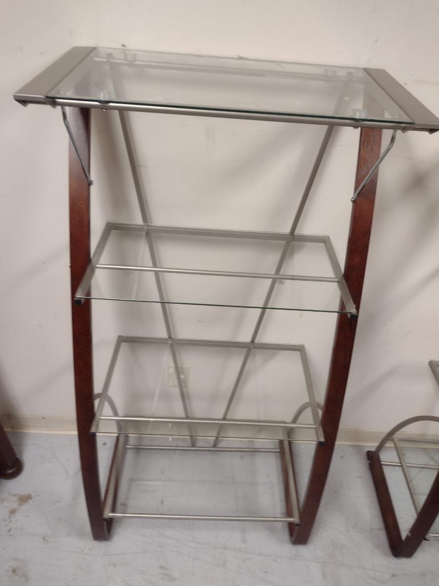 Contemporary Shelving Unit- Glass Shelves with Wood and Metal Supports (Choice #2). Item is approx 60" tall, 30" wide. Shelves are different depths- 15 3/4", 14 1/4", 16 1/4".