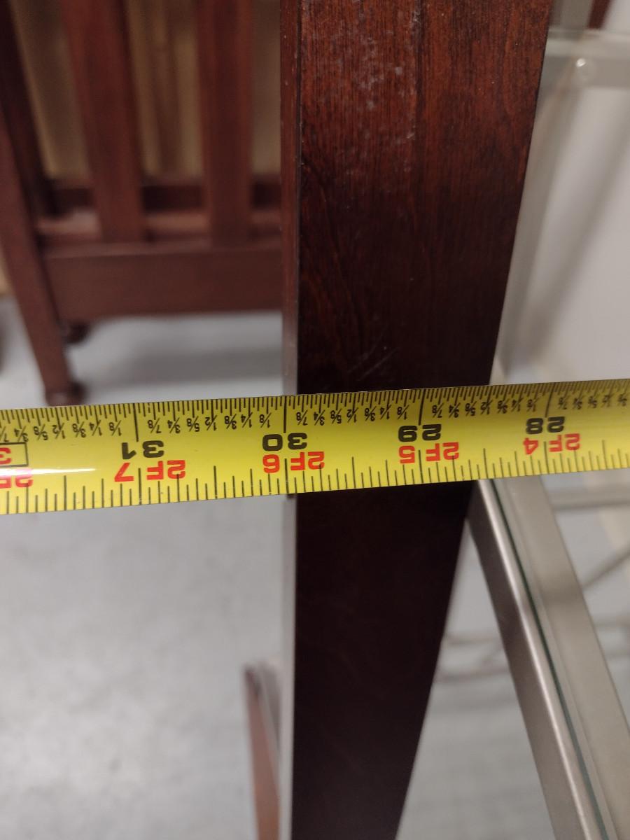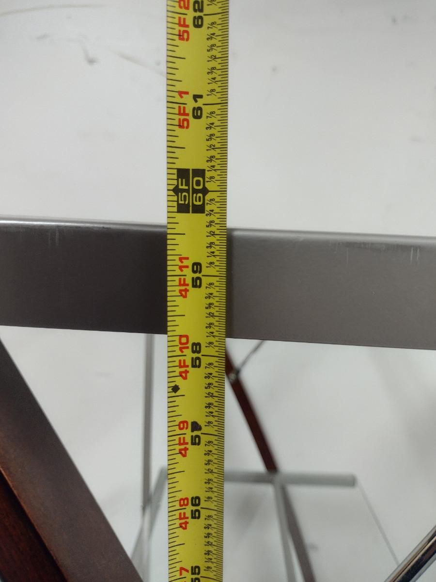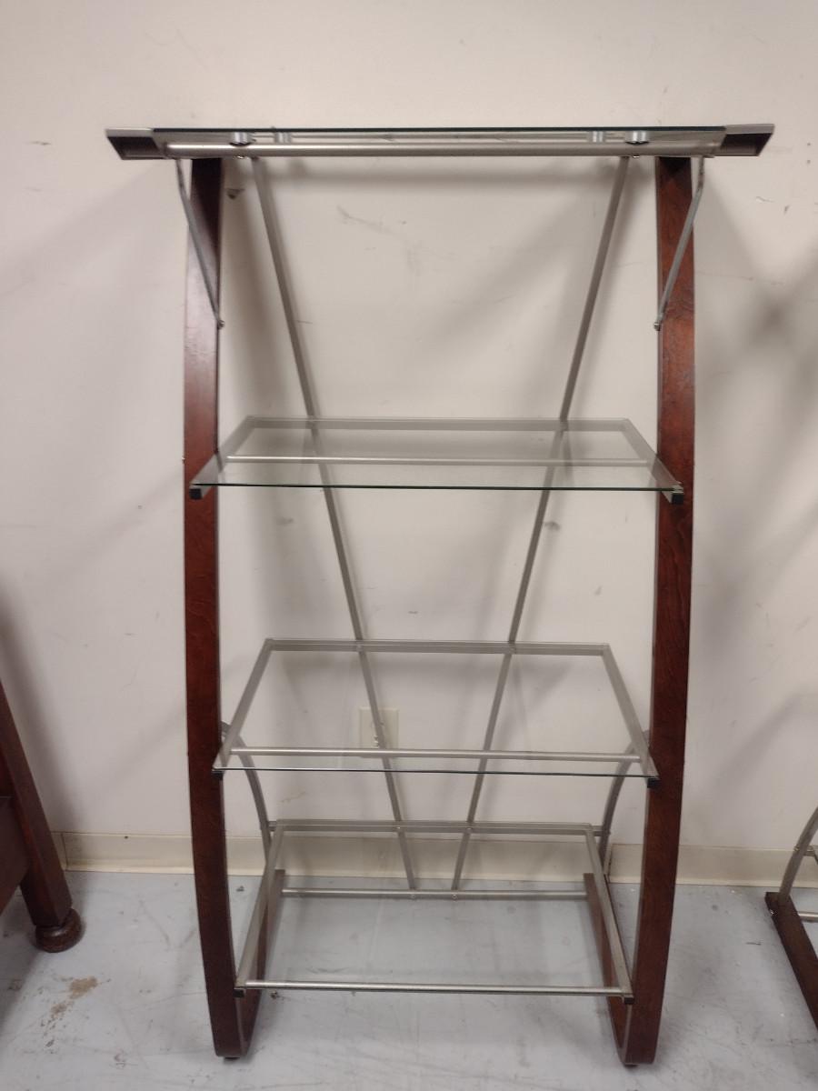 Contemporary Shelving Unit- Glass Shelves with Wood and Metal Supports (Choice #3). Item is approx 60" tall, 30" wide. Shelves are different depths- 15 3/4", 14 1/4", 16 1/4".