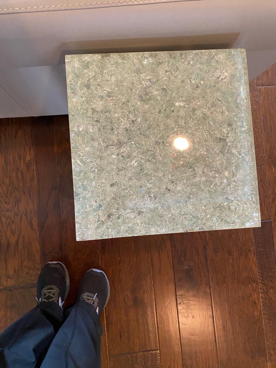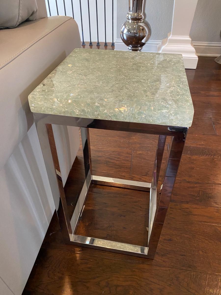 Contemporary side table, metal legs, resin top.