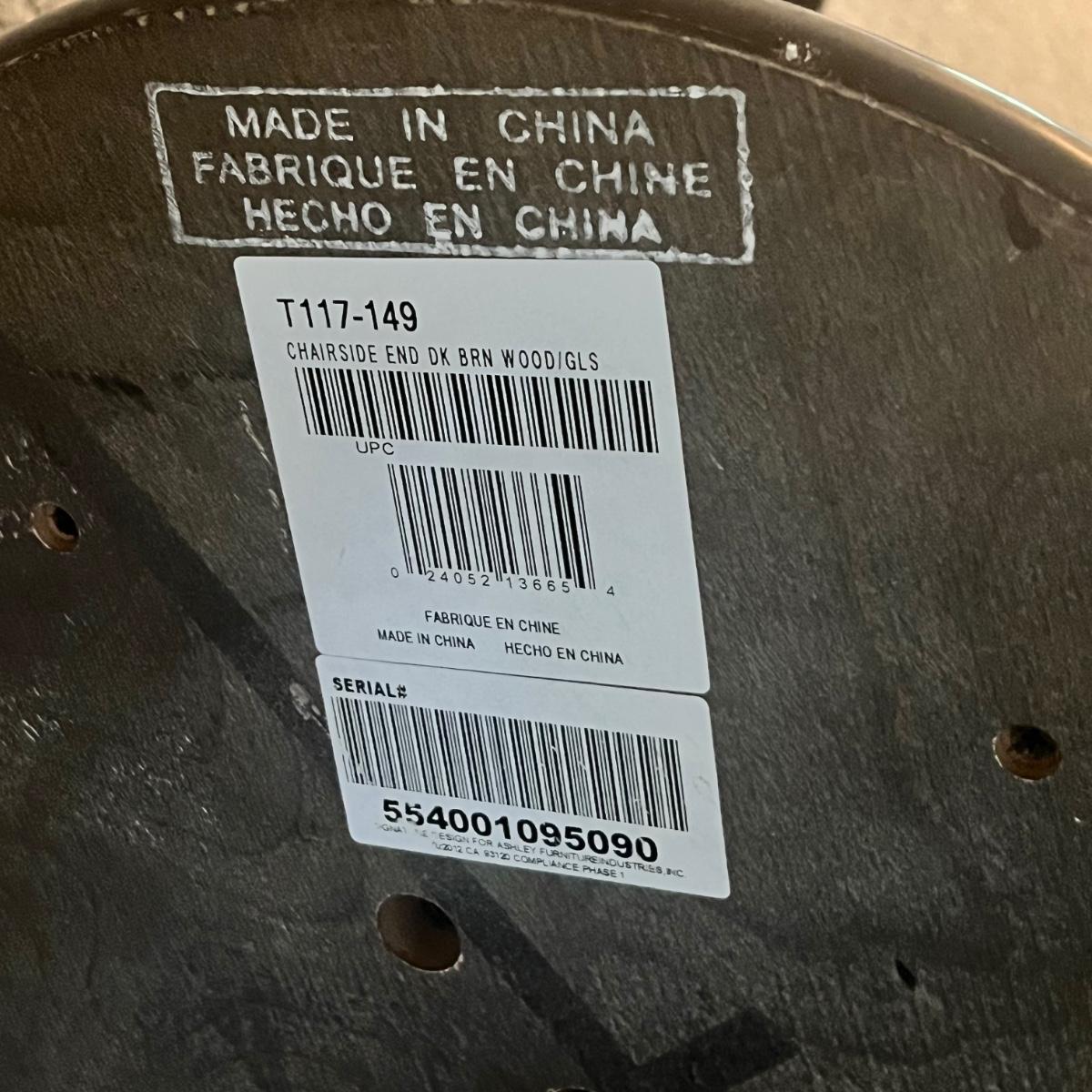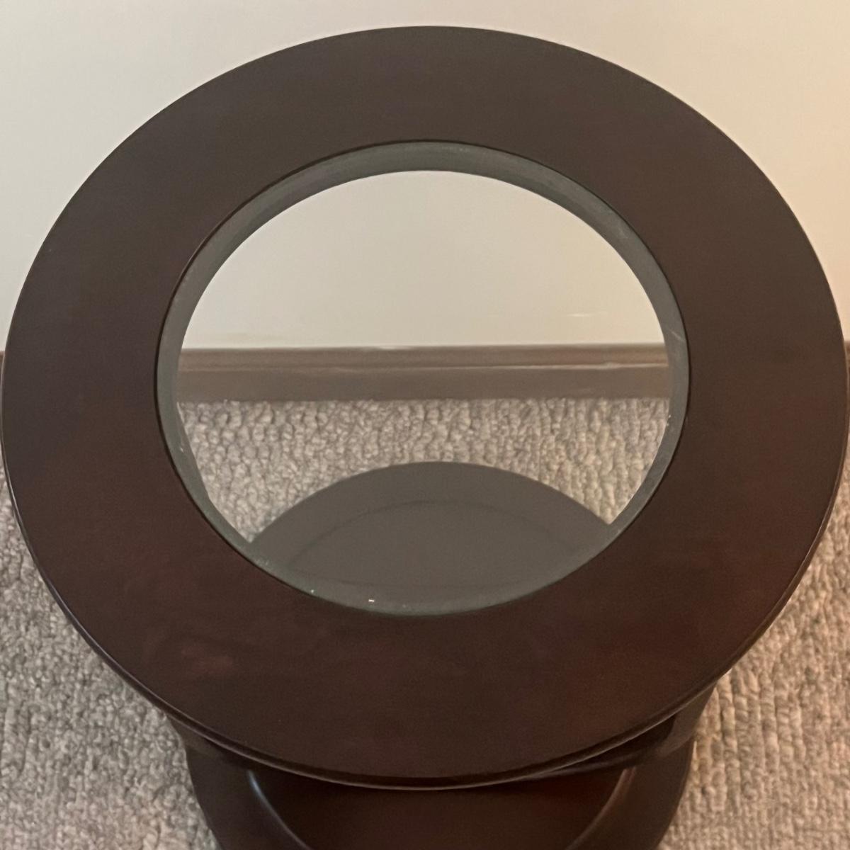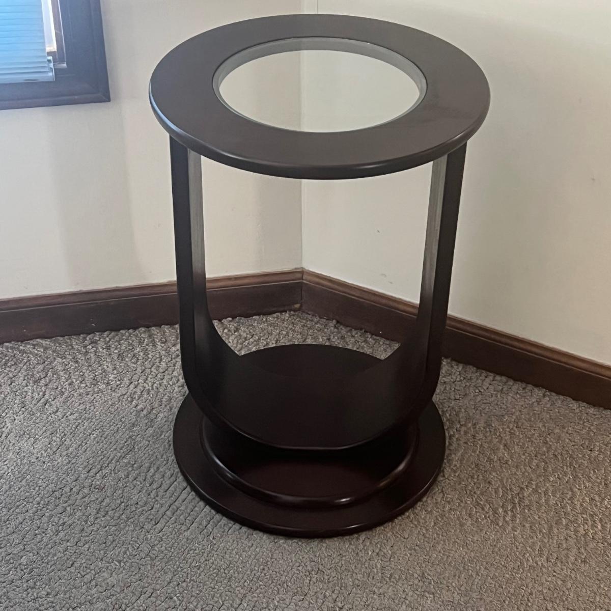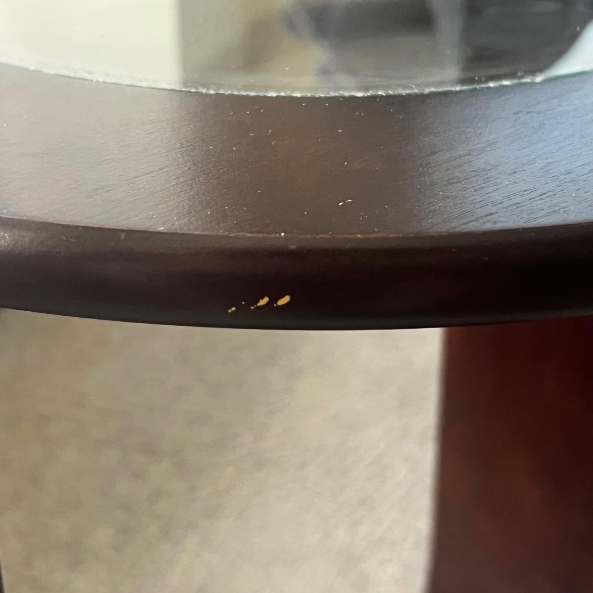 Sleek and modern, this wooden side table has a glass top. There are a few nicks shown in photos.