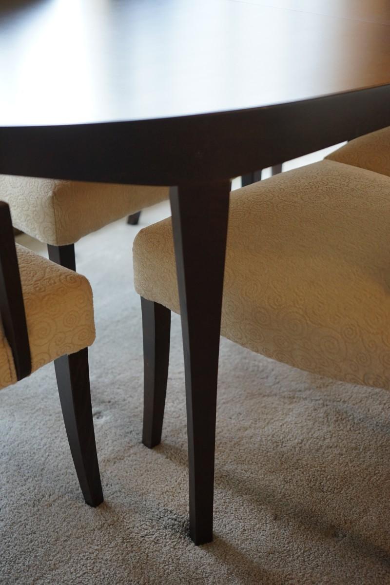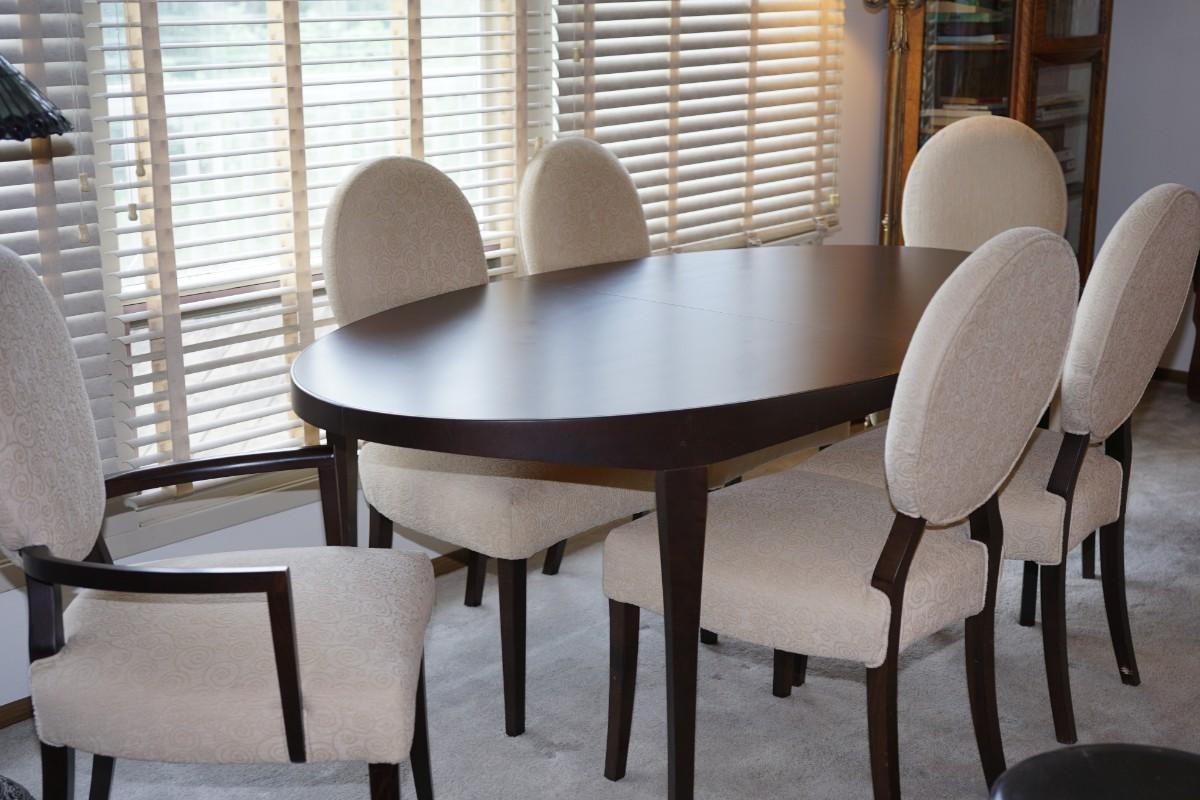 CONTEMPORARY STYLE DINING TABLE W/ SIX CHAIRS /ONE LEAF/UPHOLSTERED CHAIRS.