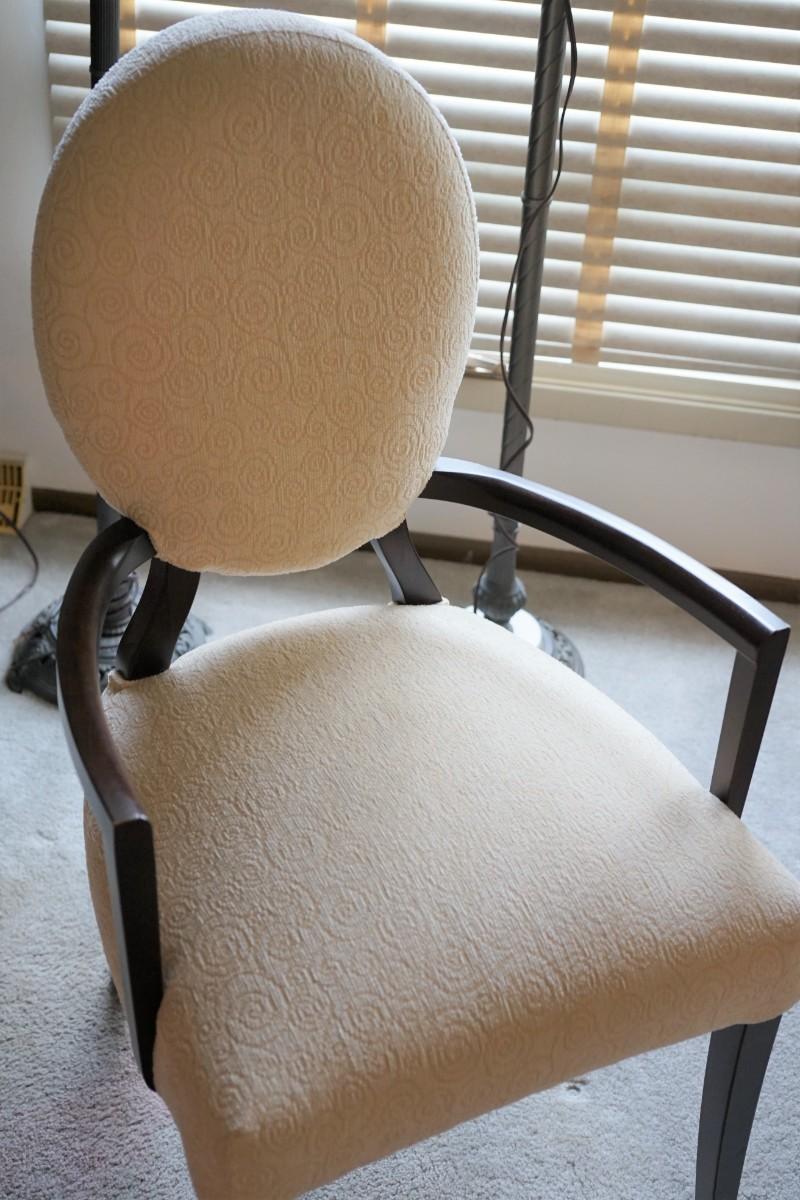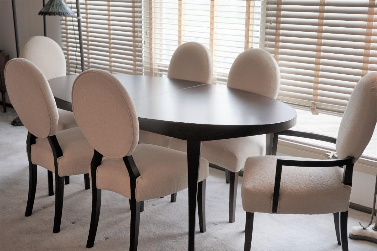 classic contemporary style dining table with white pattern fabric upholstered chairs.