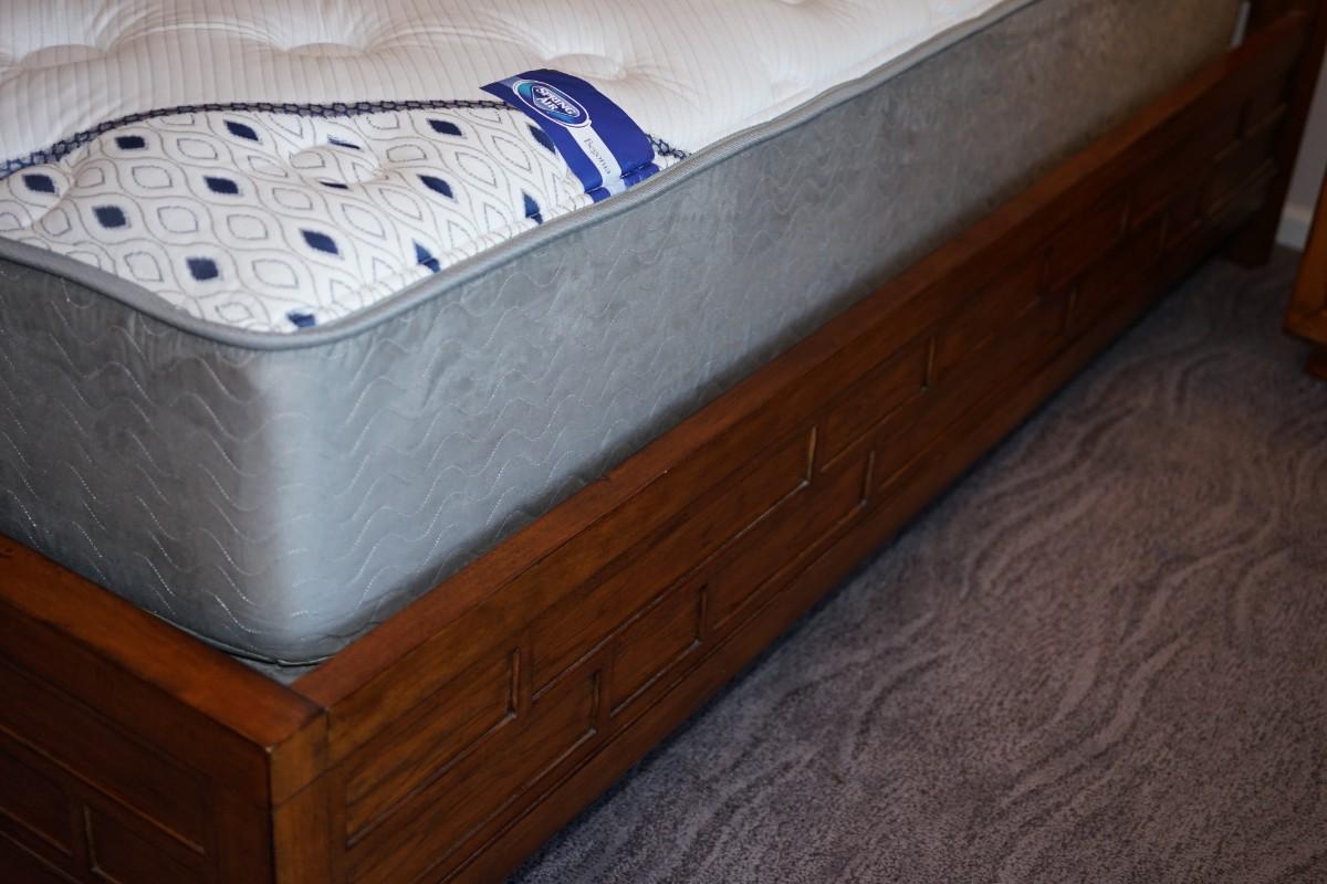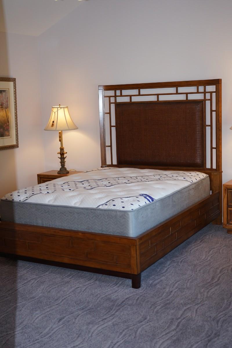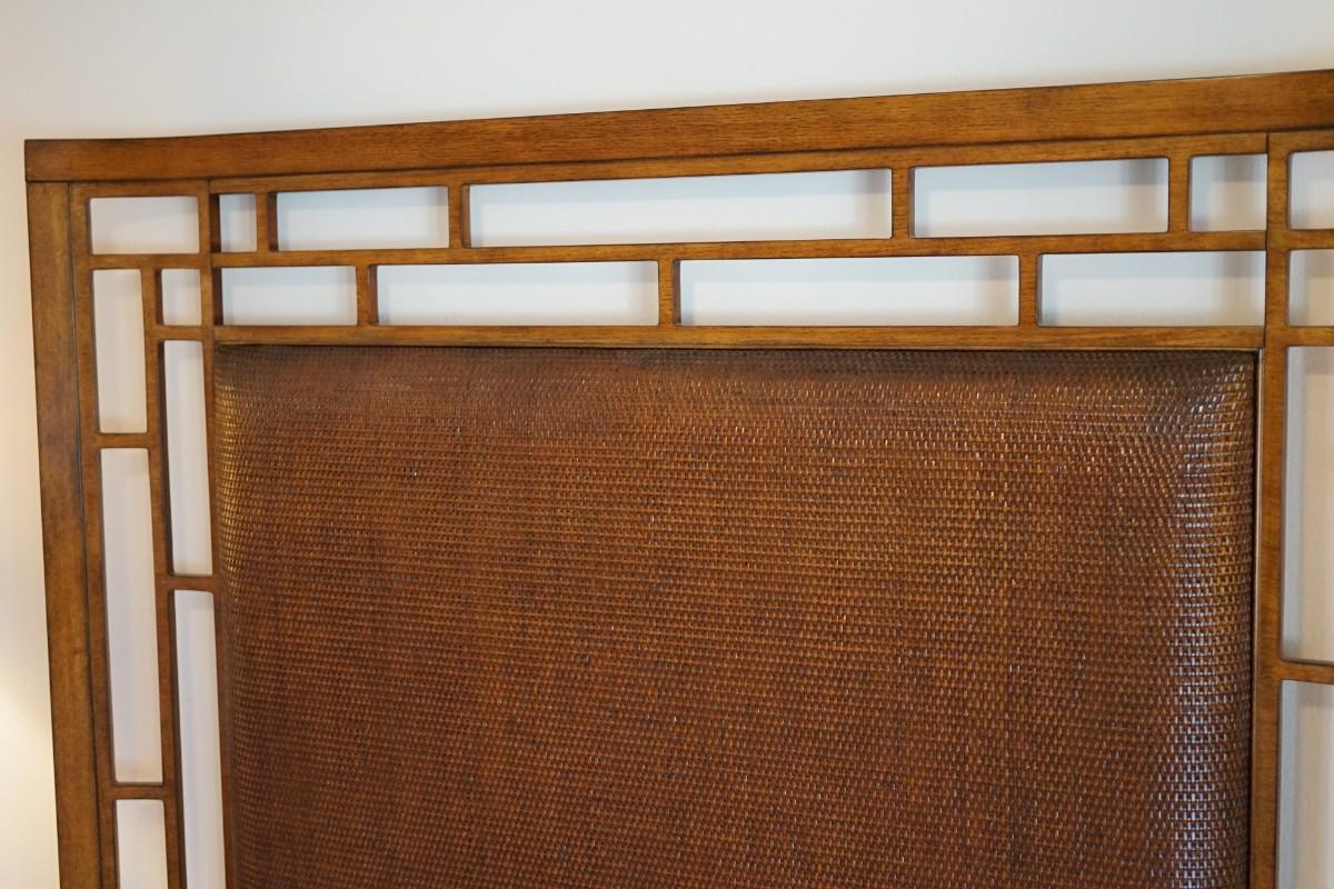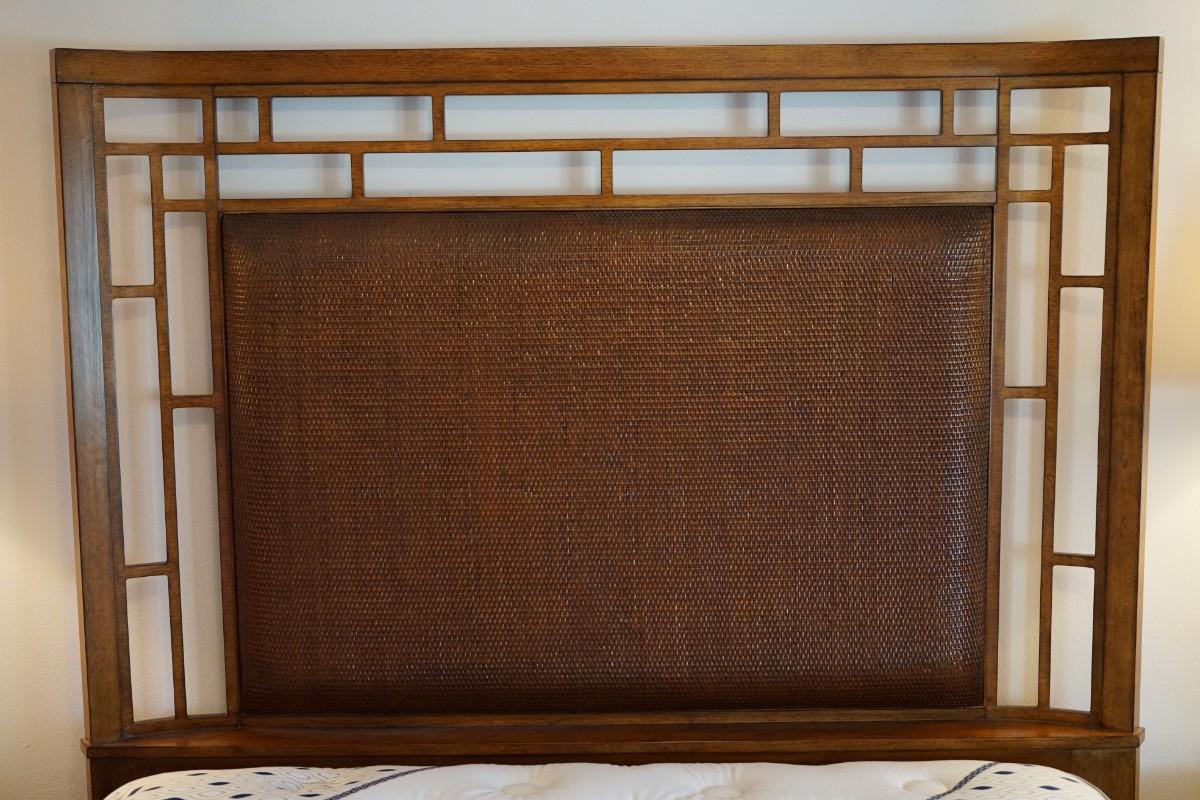 the center of the headboard has a stained wicker panel that is recessed out. The headboard slightly curves to give additional style. The base frame has panels recessed in for design.
