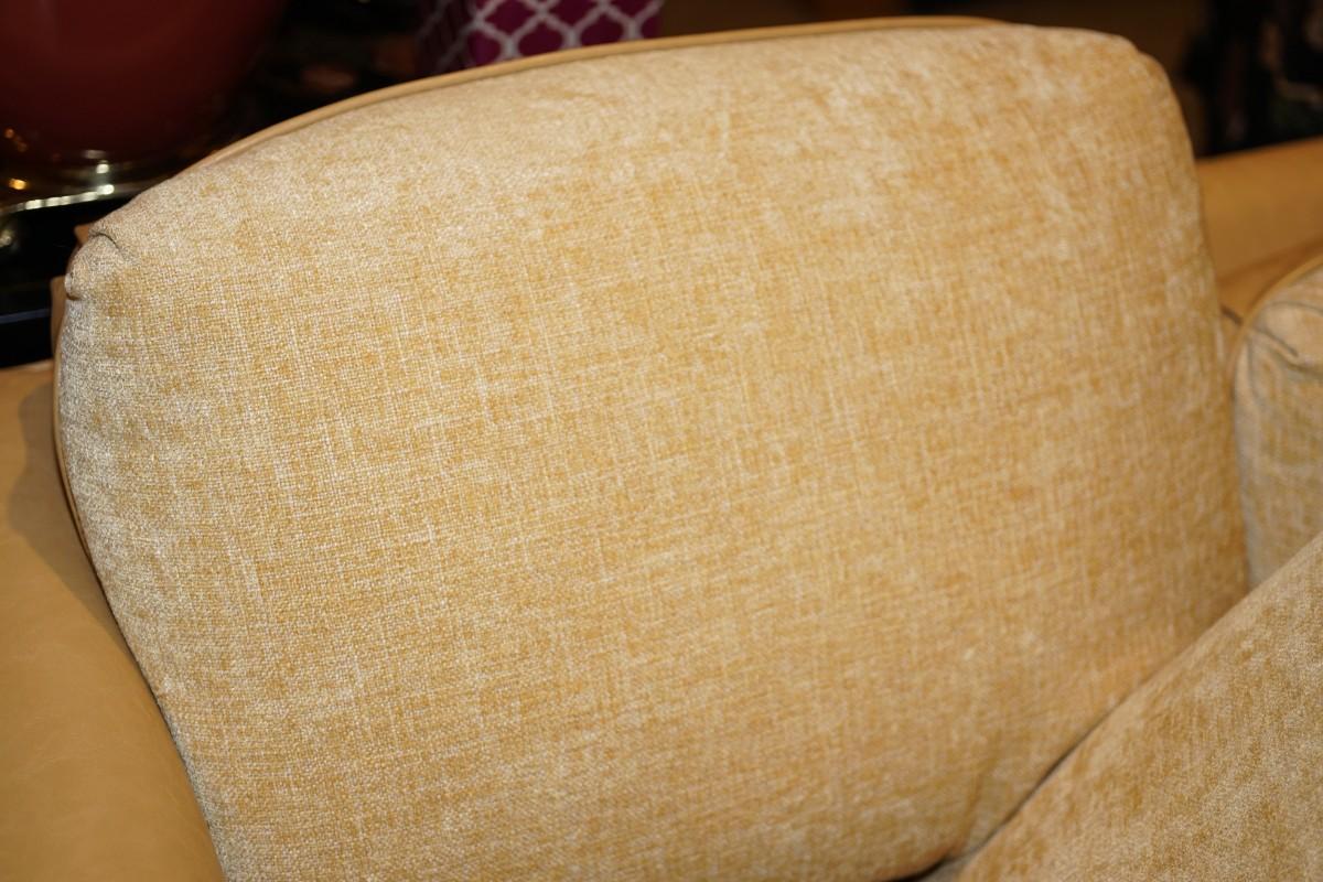 a yellow brown colored tone leather with a soft cotton blend fabric. So comfortable and soft. It would look good in a mid century modern setting