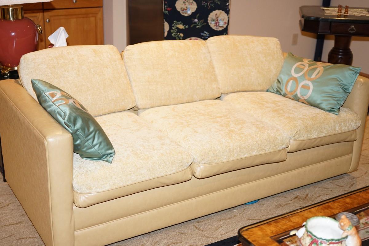 CONTEMPORARY THREE CUSHION SOFA SLEEPER . YELLOW TONE LEATHER W/ SOFT COTTON BLEND UPHOLSTERY
