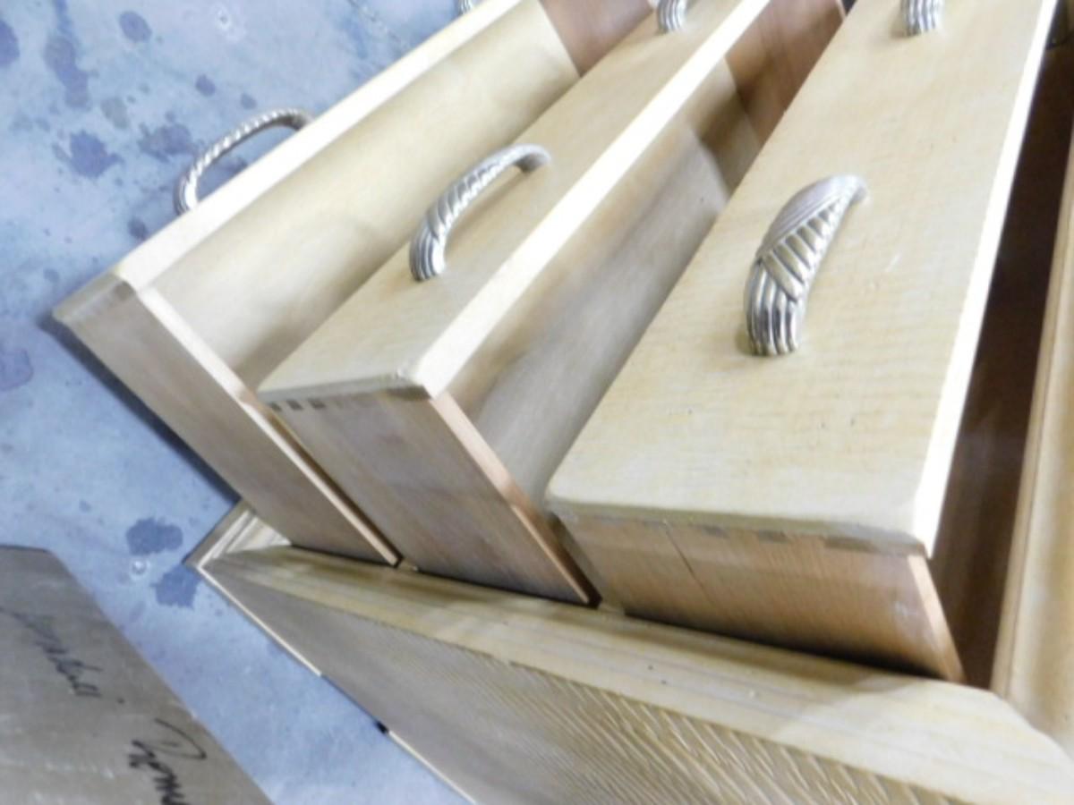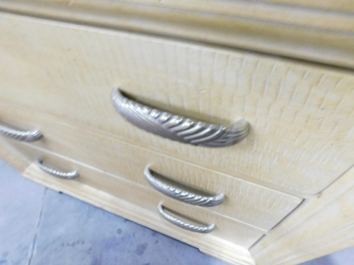 Contemporary Three Drawer Ash Finish Side Dresser Choice C Expect some wear or scratches to finish. Shipping option available via freight or local mover at Buyer's expense. Buyer must have all shipping scheduled within the stated dates and times of pickup. Recommended local mover is Beaty Bros. Moving 828-201-2982