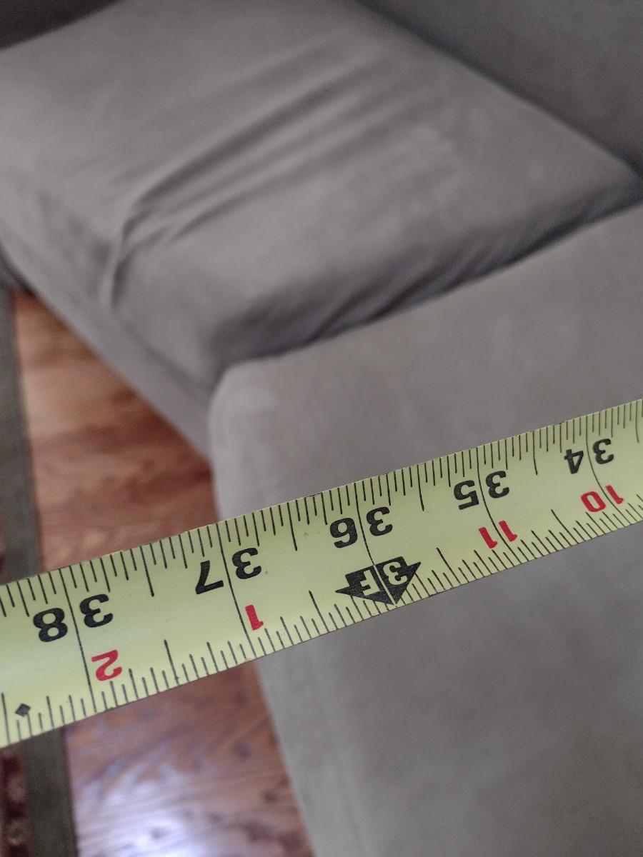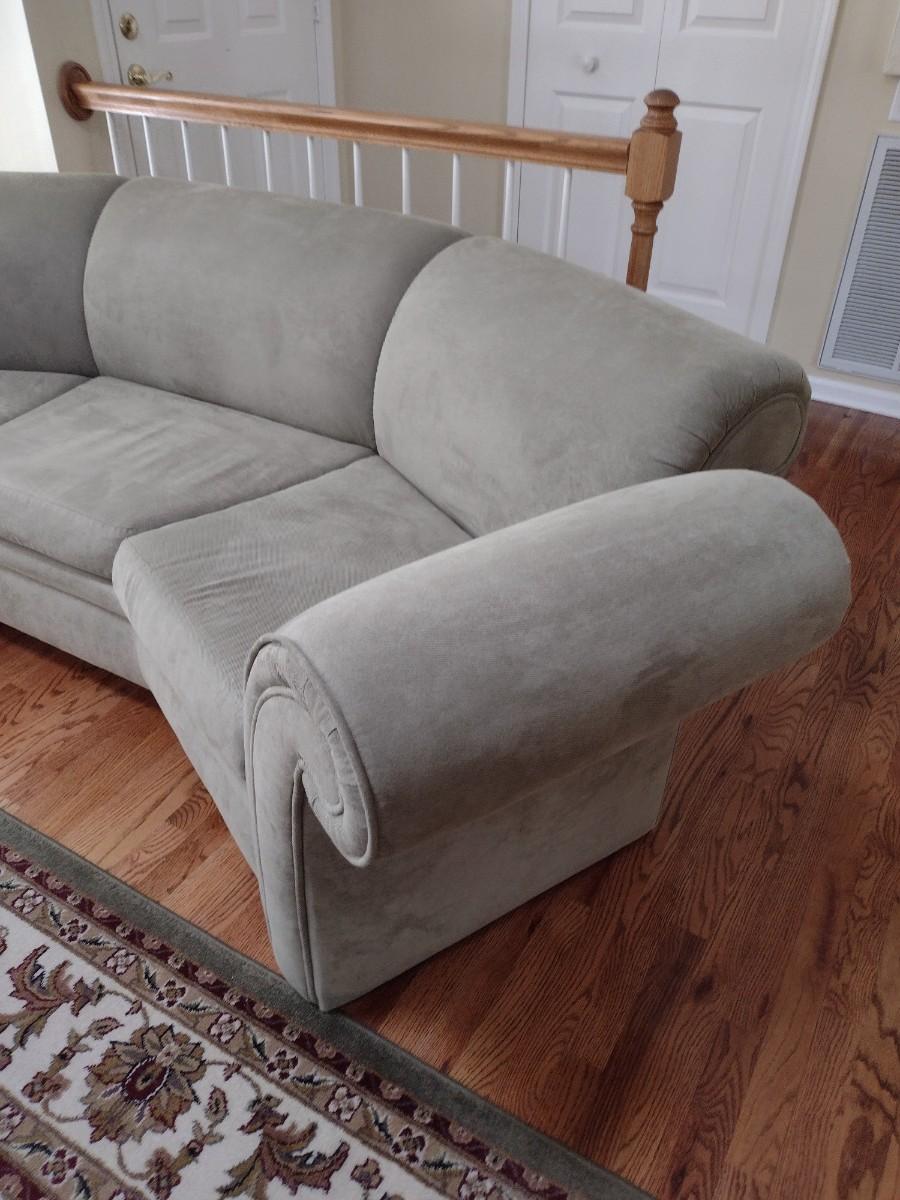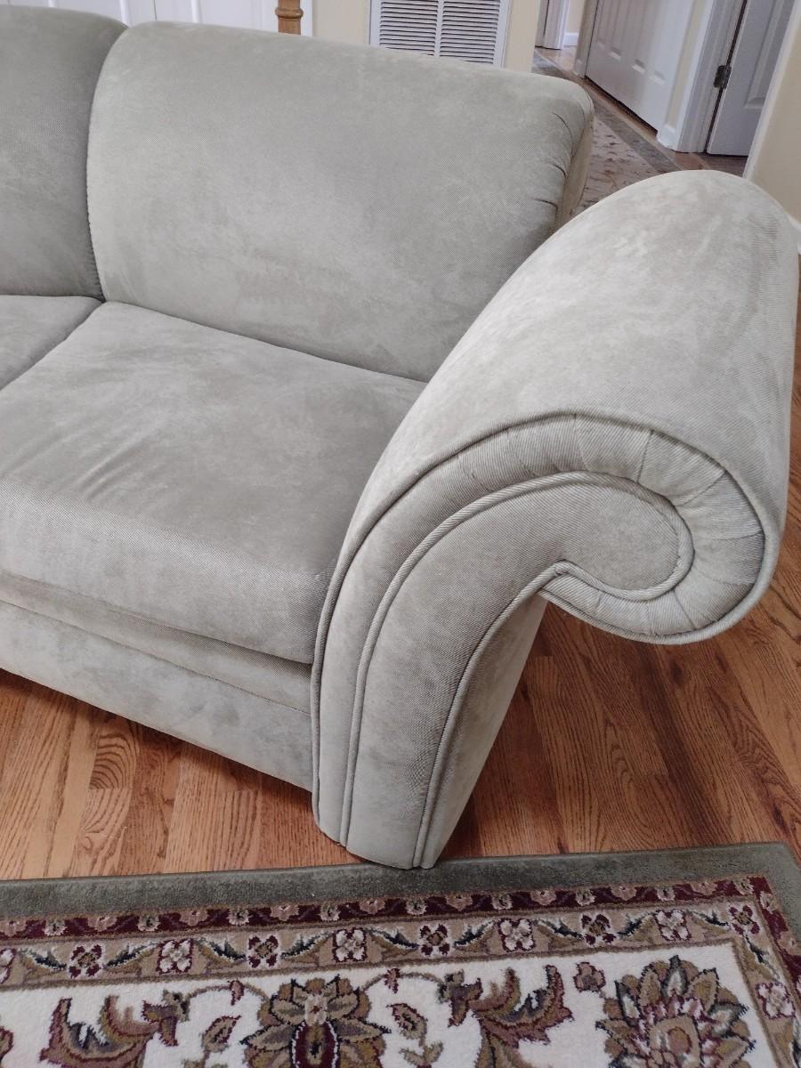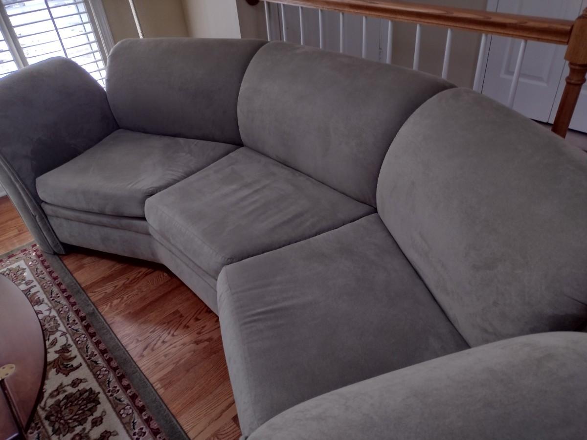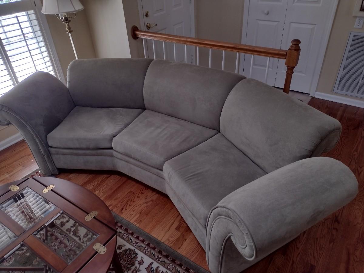 Contemporary Upholstered Sage Colored Curved Sofa. This sofa is light sage green and not grey as shown. Lighting did not allow for true color representation. This is the actual couch for bidding.
