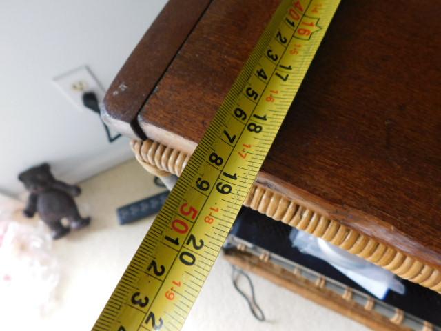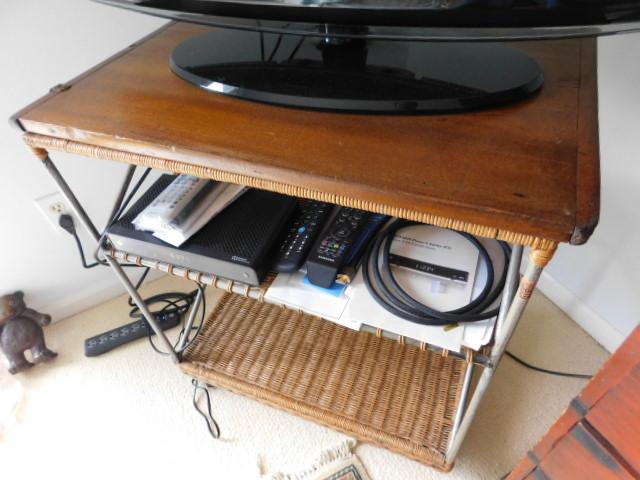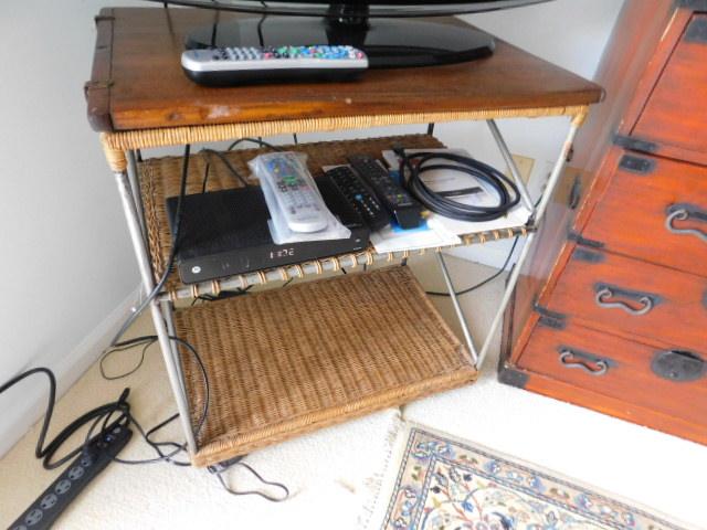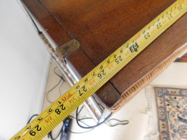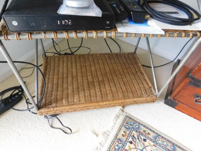 Contemporary Wood and Wicker Side Table with Open Shelves  27"x19"x29" (No Contents)